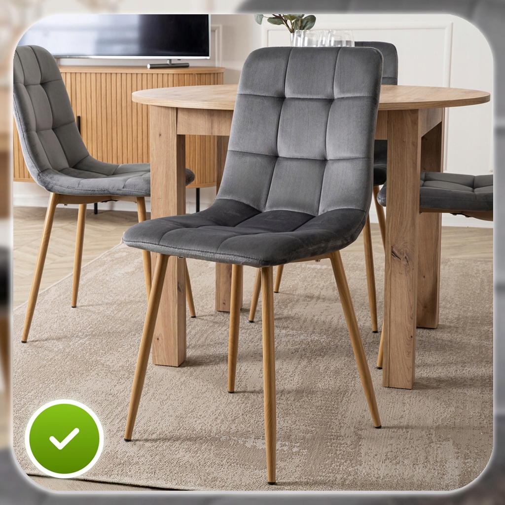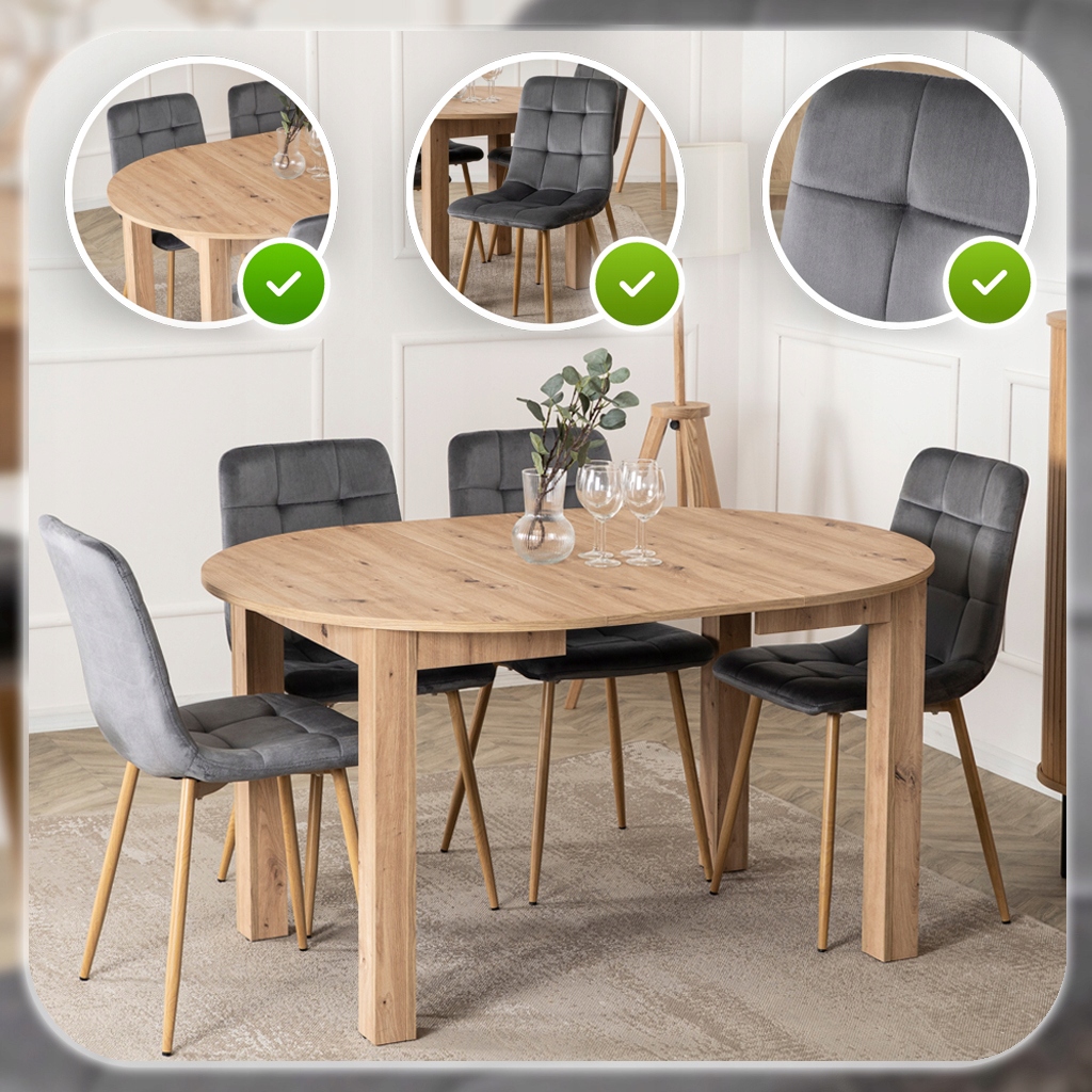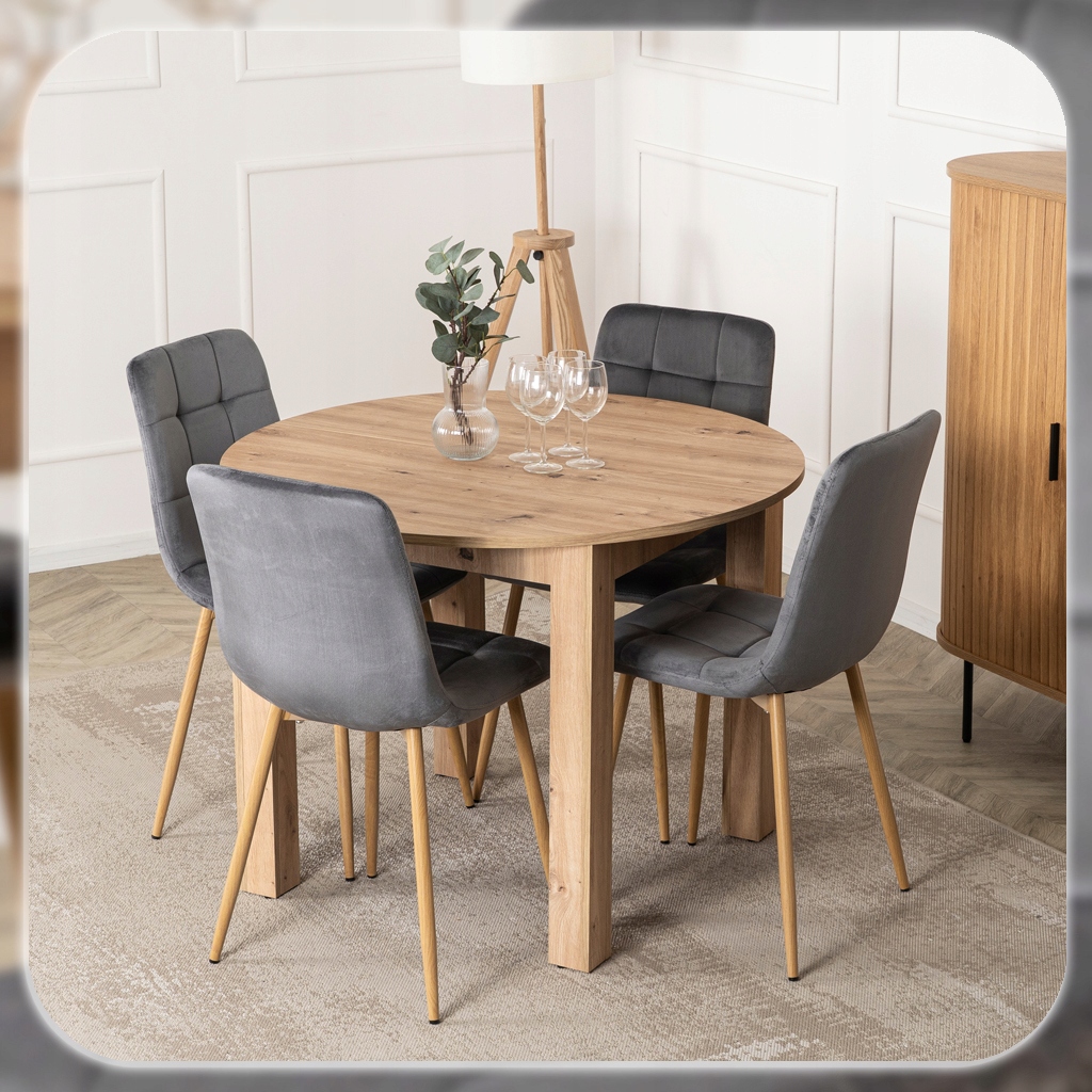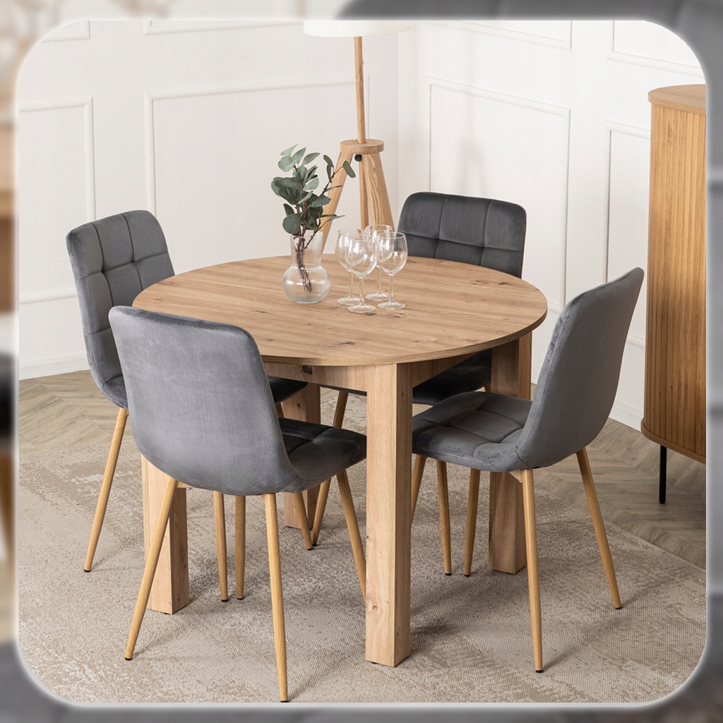 Zestaw składa się z okrągłego stołu w kolorze Dąb Artisan oraz czterech krzeseł o welurowej tapicerce i metalowych nogach. Całość prezentuje się lekko, nowocześnie i elegancko. Dzięki klasycznym kolorom łatwo go dopasować do różnych aranżacji.