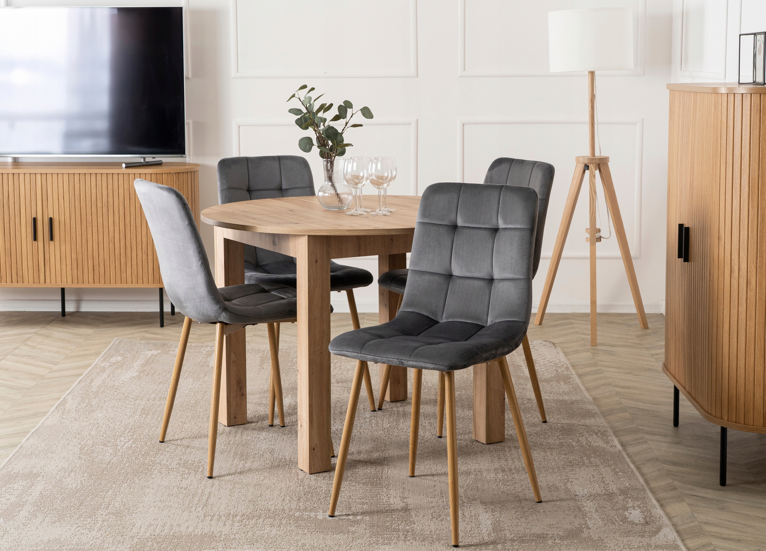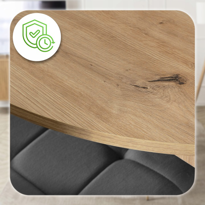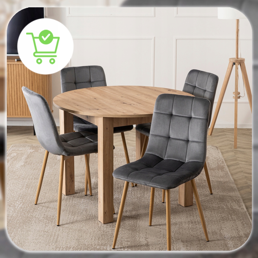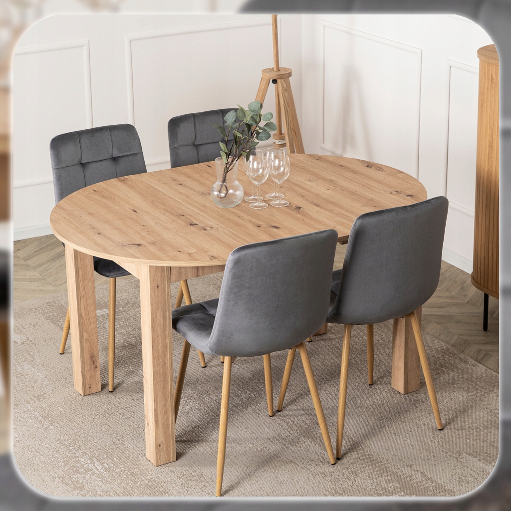Zestaw składa się z okrągłego stołu w kolorze Dąb Artisan oraz czterech krzeseł o welurowej tapicerce i metalowych nogach. Całość prezentuje się lekko, nowocześnie i elegancko. Dzięki klasycznym kolorom łatwo go dopasować do różnych aranżacji.