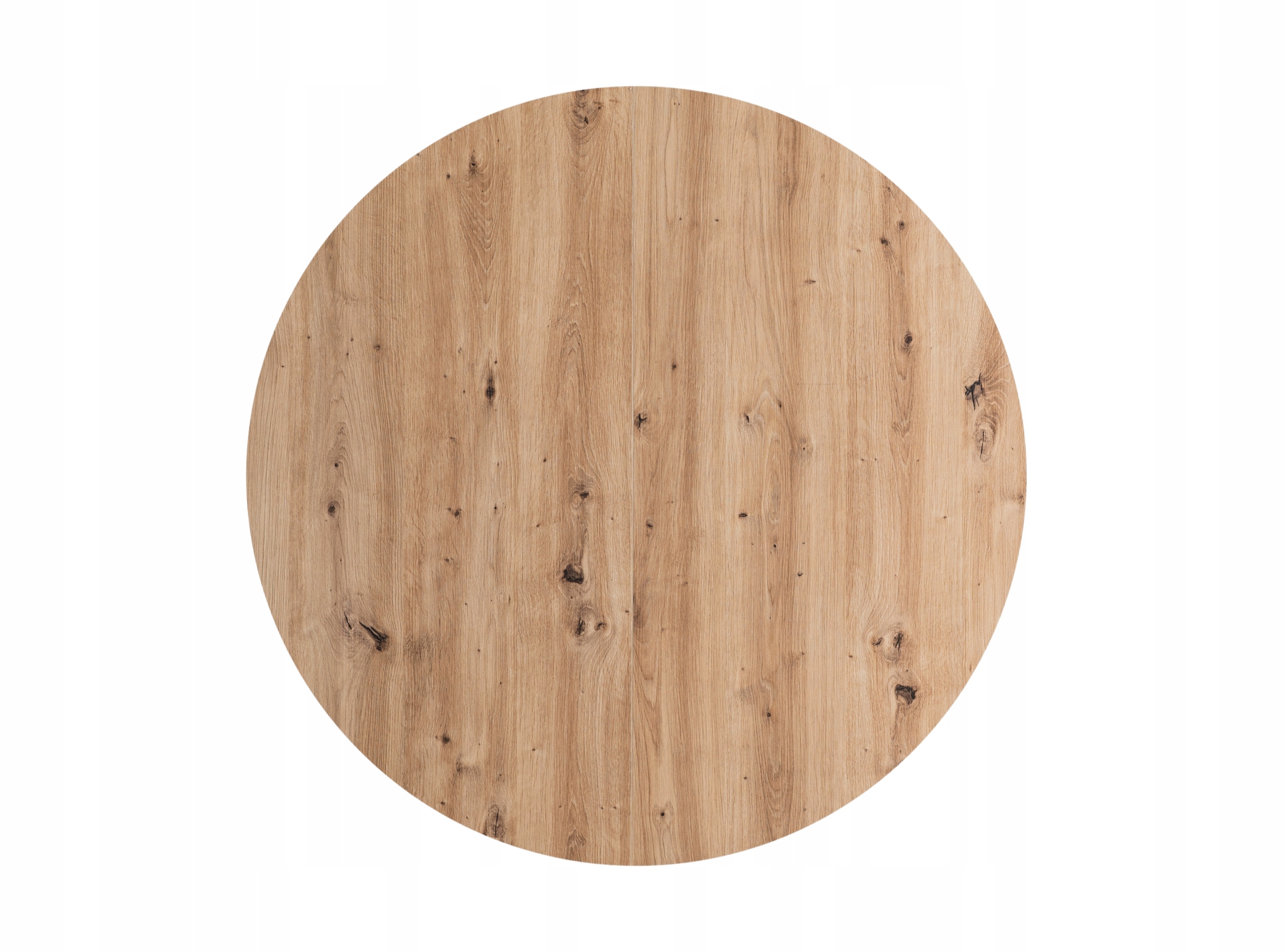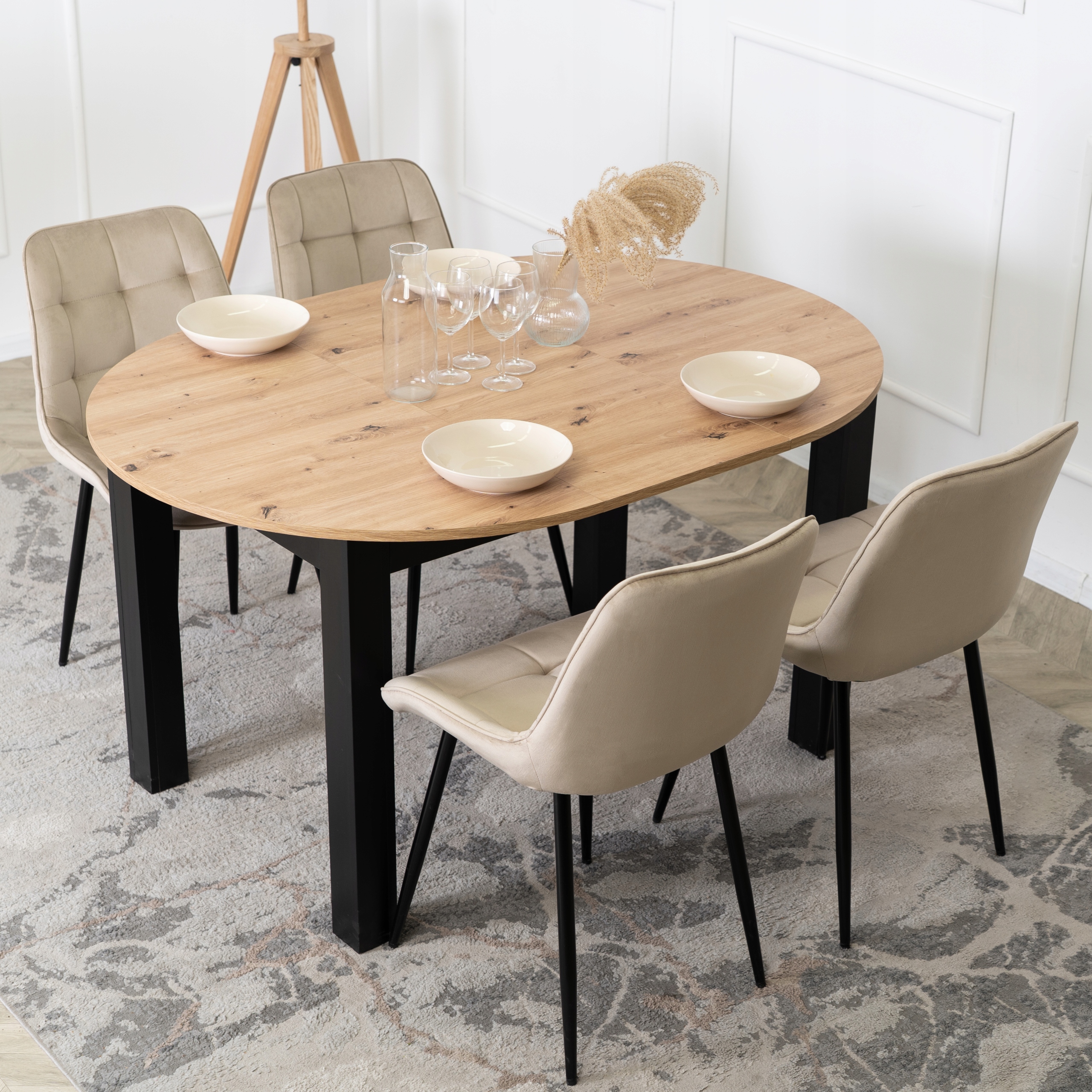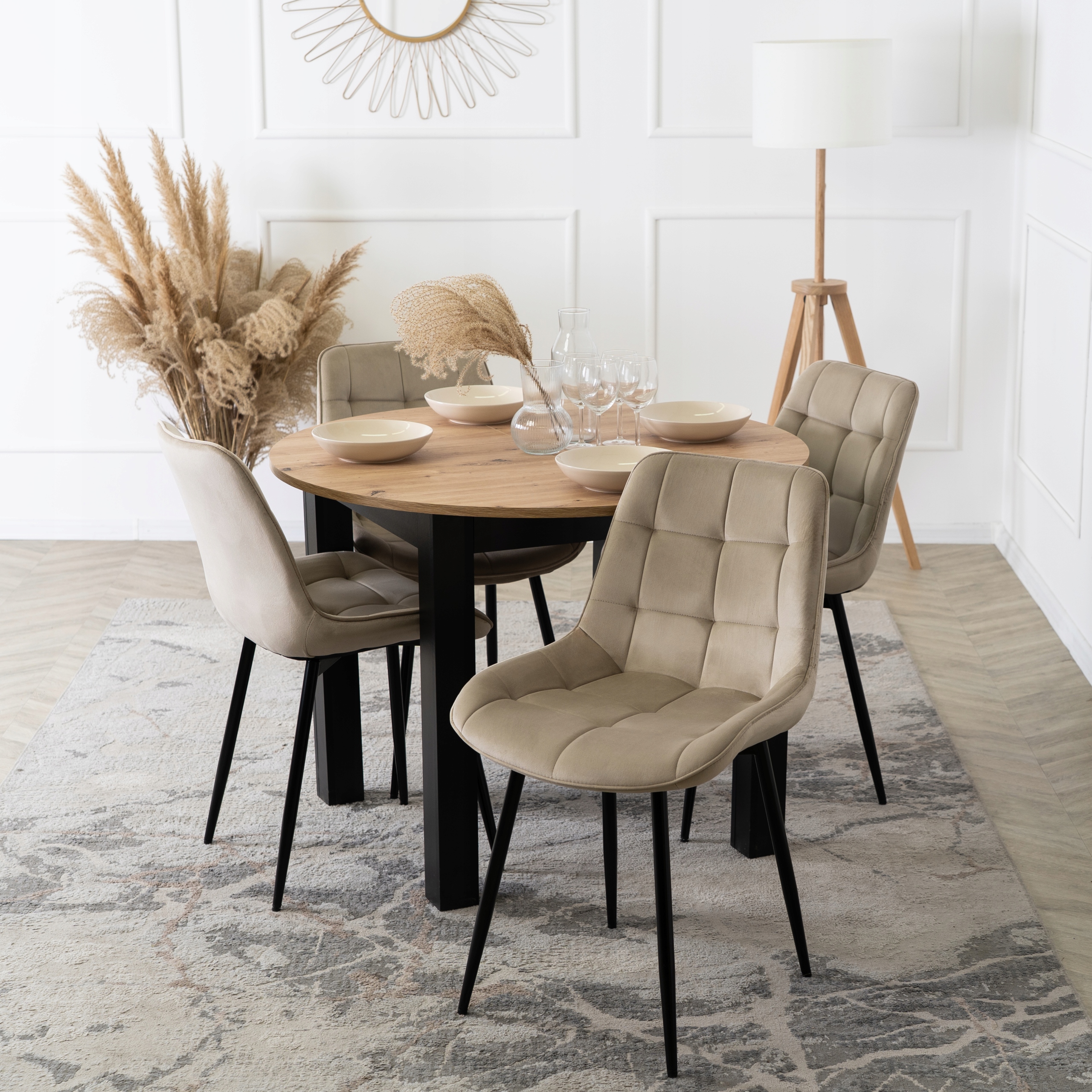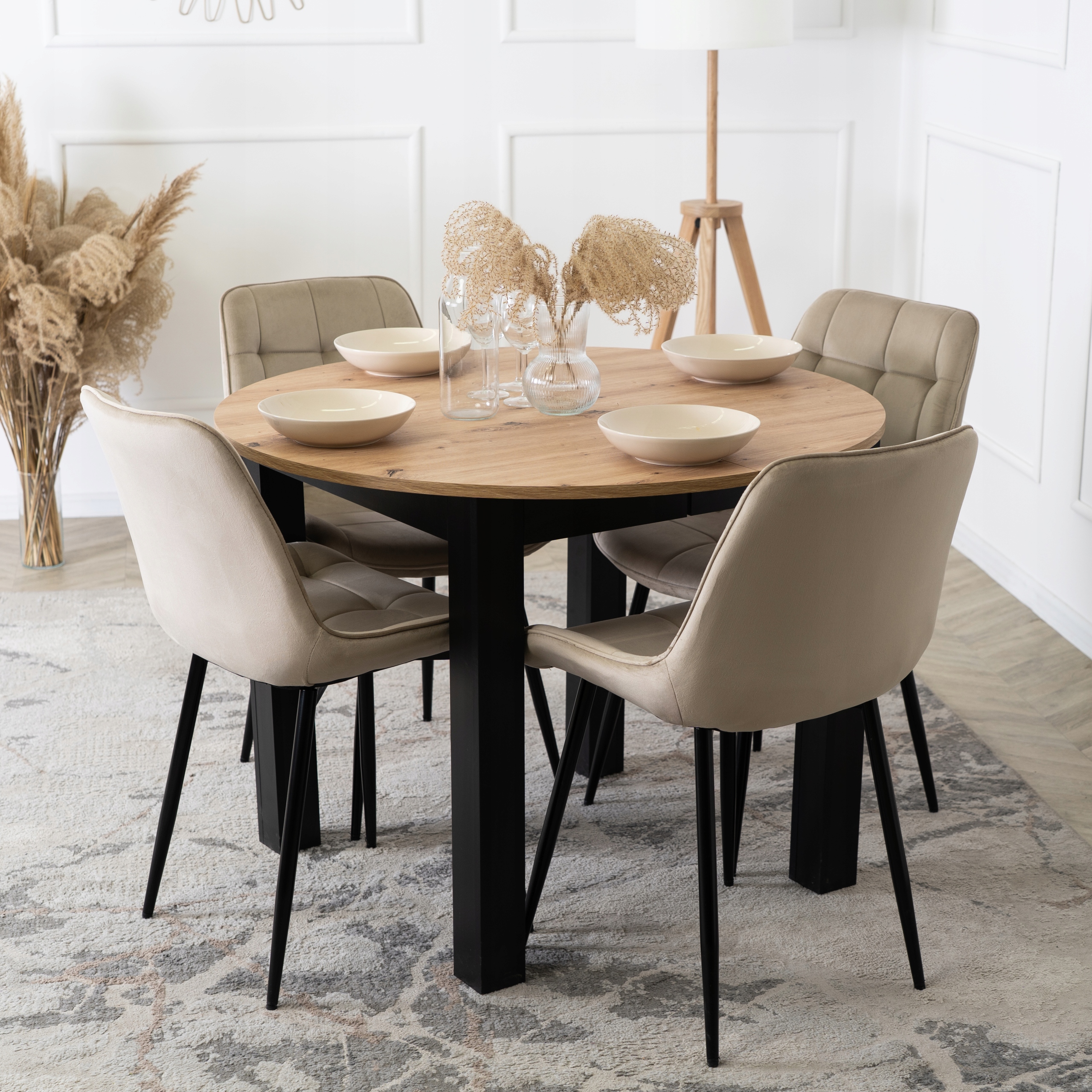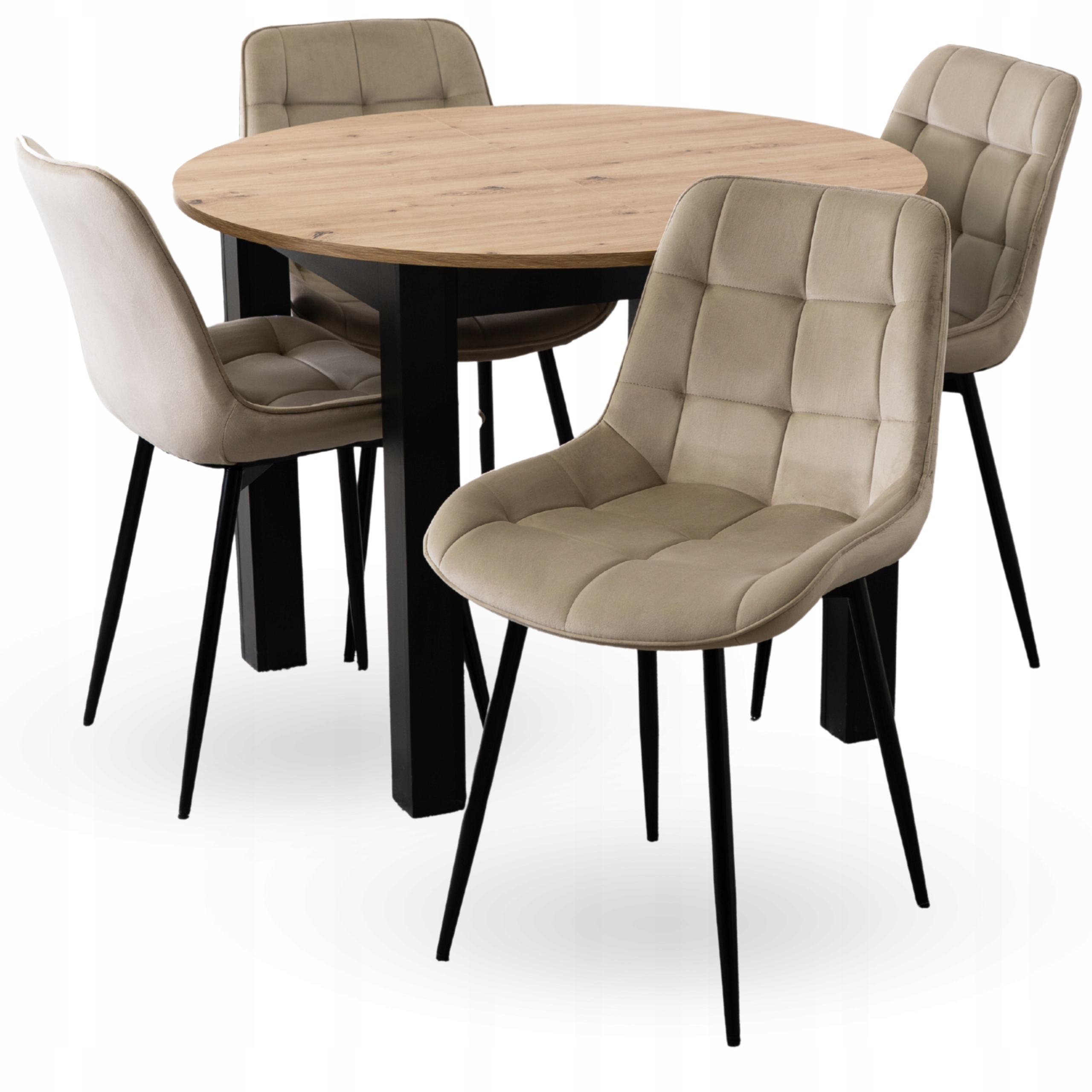 Zestaw składa się z okrągłego stołu w kolorze dąb artisan oraz czterech tapicerowanych krzeseł w kolorze beżowym. Całość prezentuje się lekko, nowocześnie i elegancko.