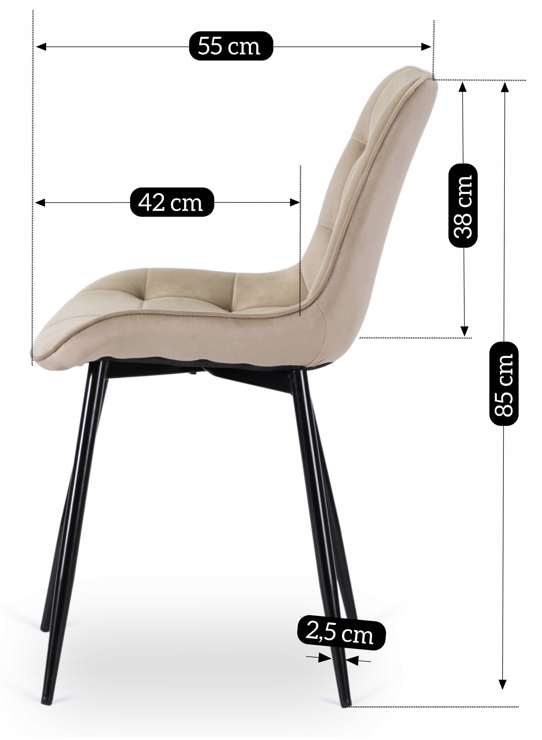 To doskonałe połączenie nowoczesnego designu z wygodą. Siedzisko oraz oparcie mają lekko wklęsły kształt, dzięki czemu dobrze dopasowują się do sylwetki podczas siedzenia. Krzesło jest tapicerowane pikowaną tkaniną welurową, która dodaje elegancji.