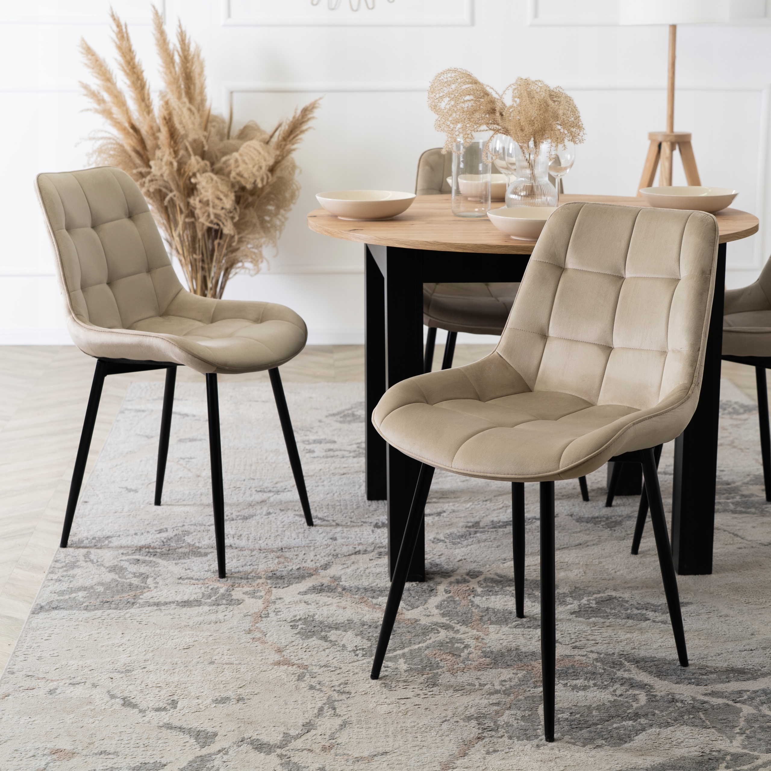 Zestaw dobrze sprawdzi się w kuchni, jadalni, salonie a nawet w biurze czy kawiarni. Czarne nogi dodają loftowego, industrialnego charakteru.