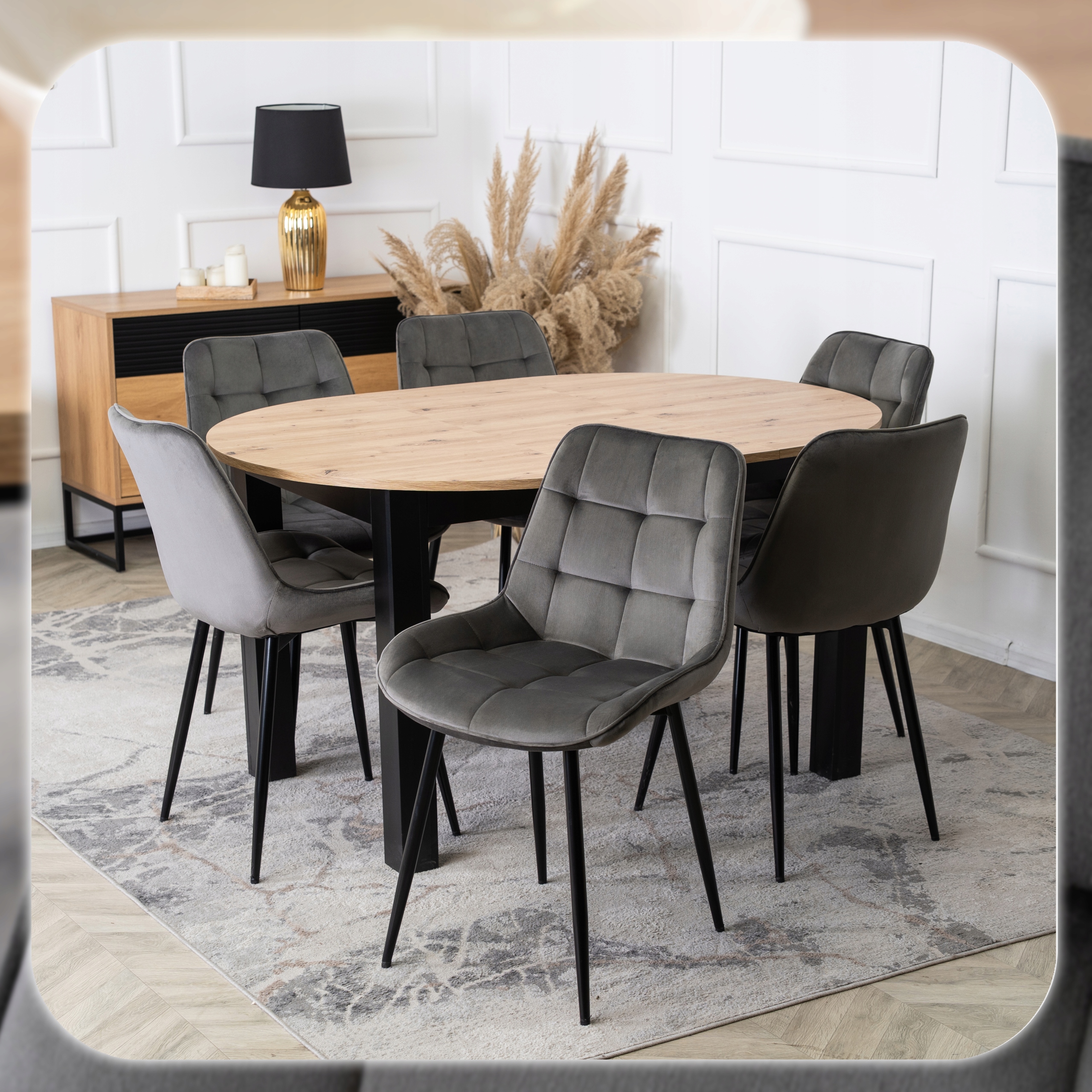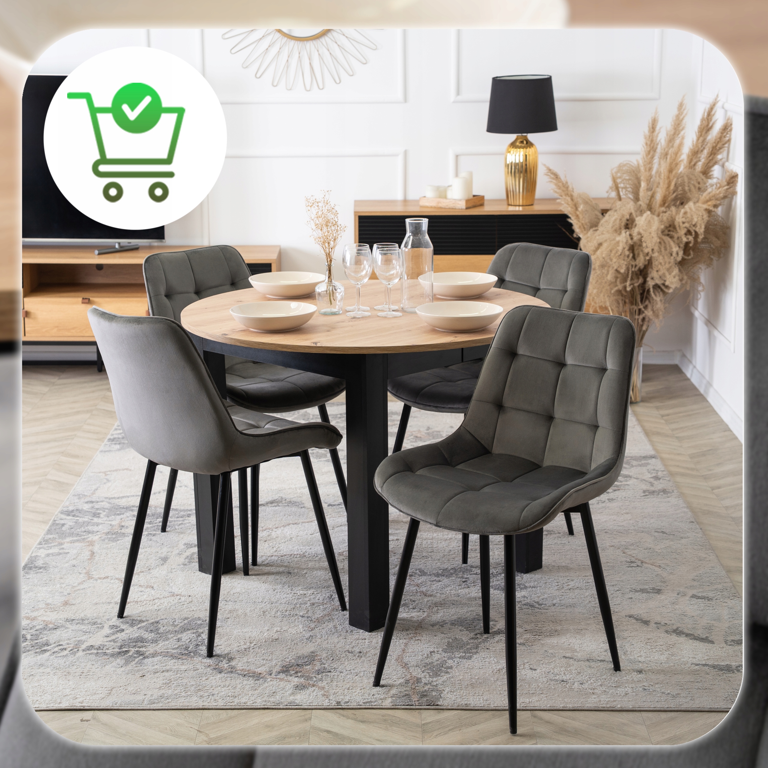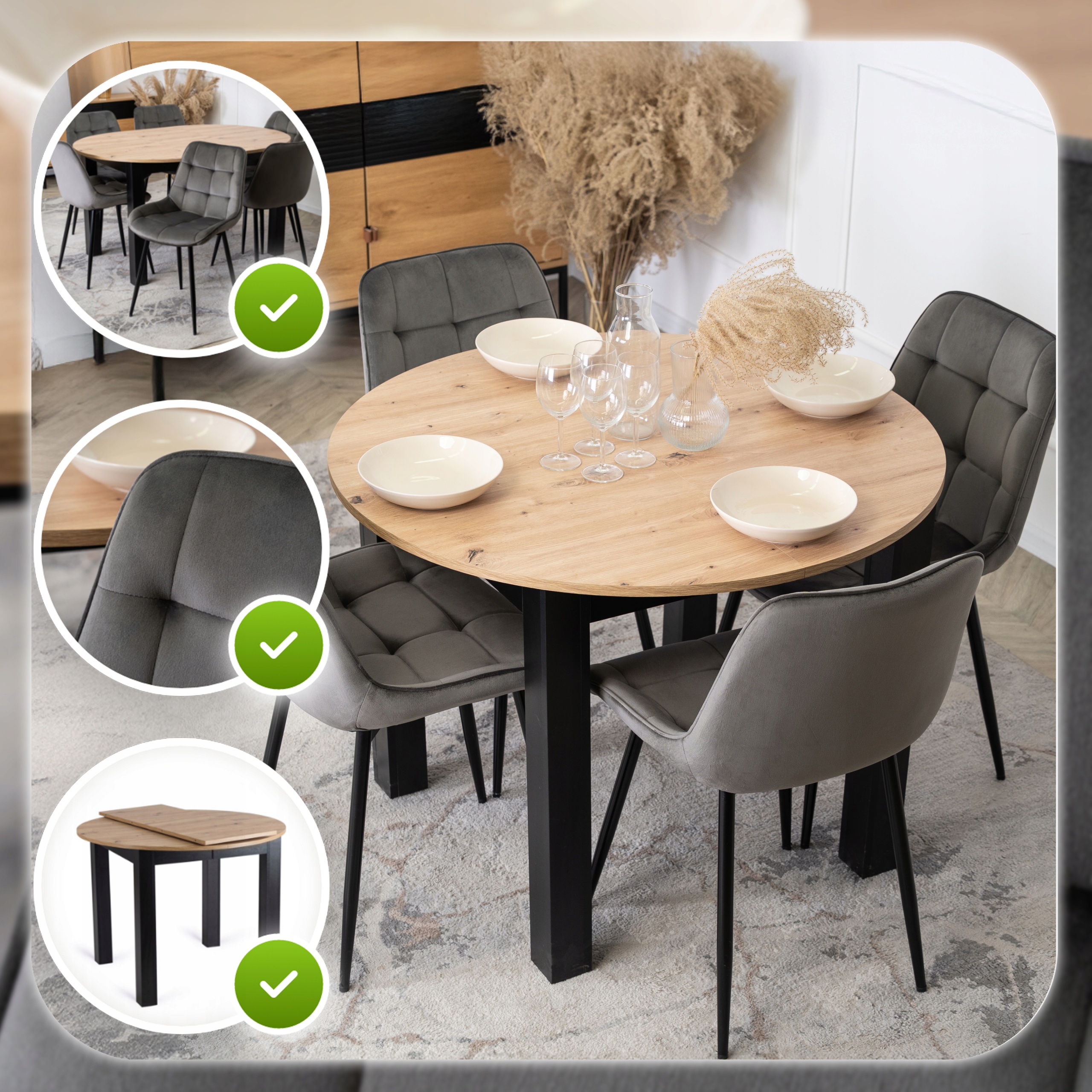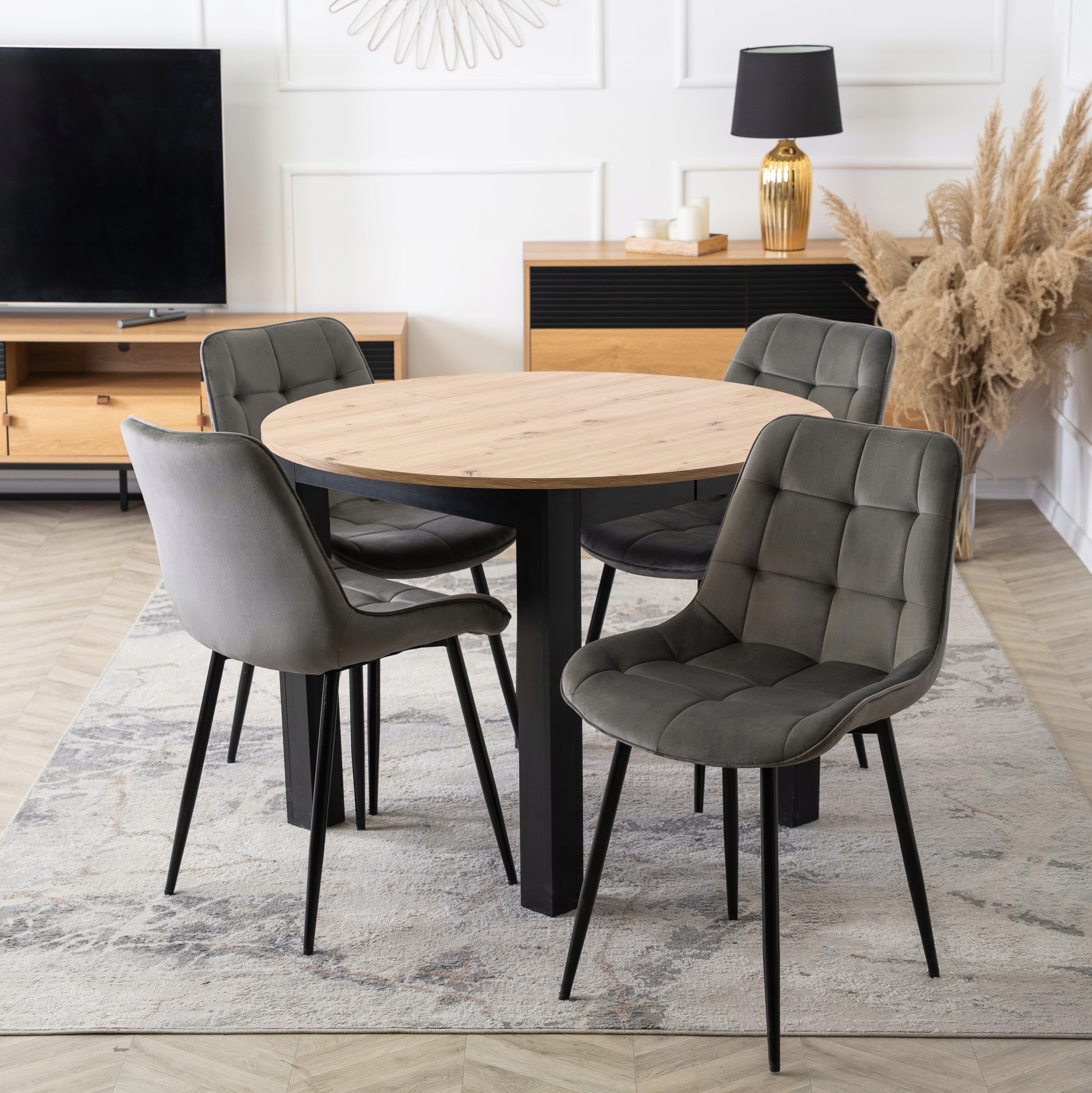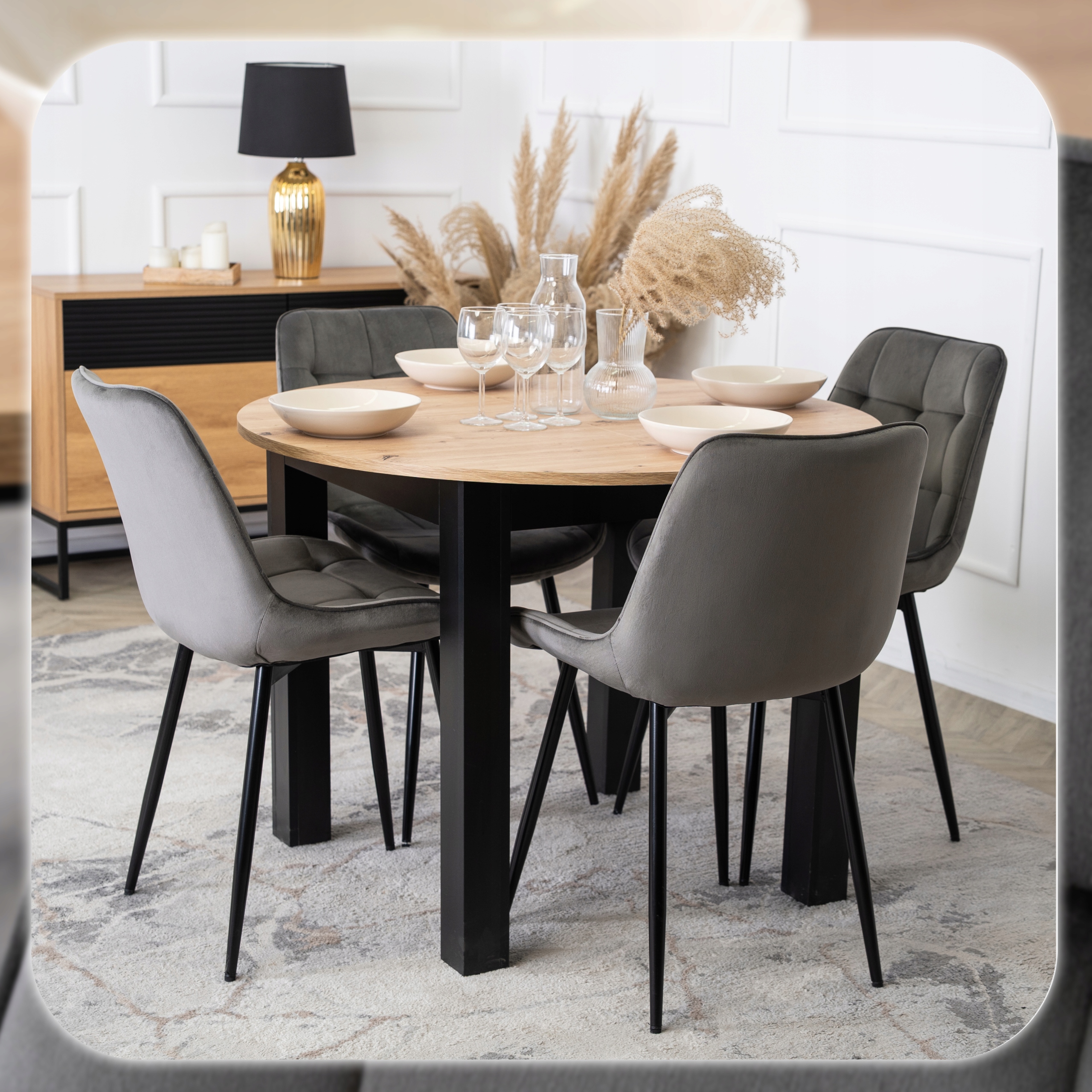 Zestaw składa się z okrągłego stołu w kolorze dąb artisan oraz czterech krzeseł na czarnych nogach. Całość prezentuje się lekko, nowocześnie i elegancko. Dzięki klasycznym kolorom łatwo go dopasować do różnych aranżacji.