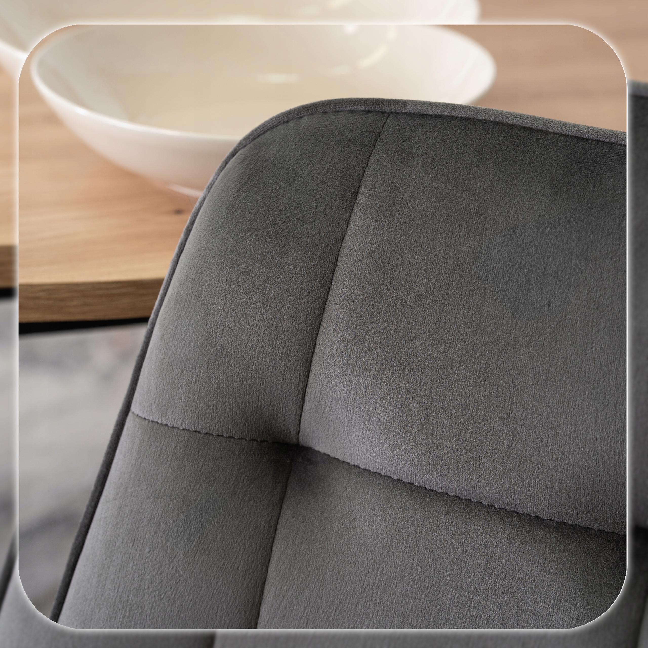 - Wygodne krzesła Chris – miękkie, tapicerowane siedziska w szarym odcieniu gwarantują komfort siedzenia nawet podczas długich spotkań przy stole.