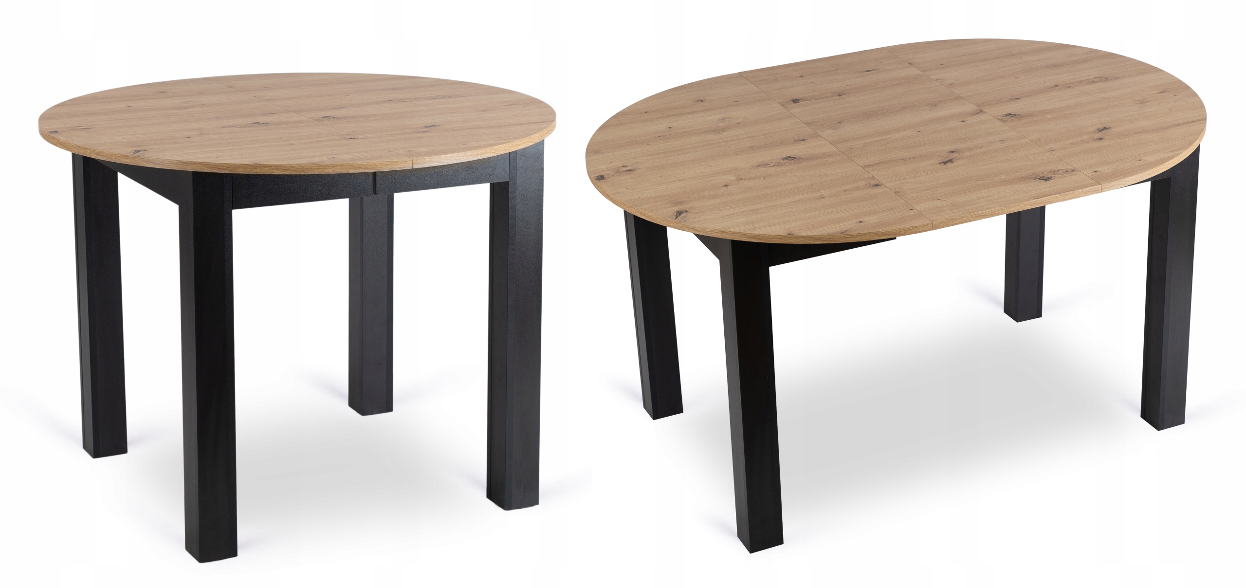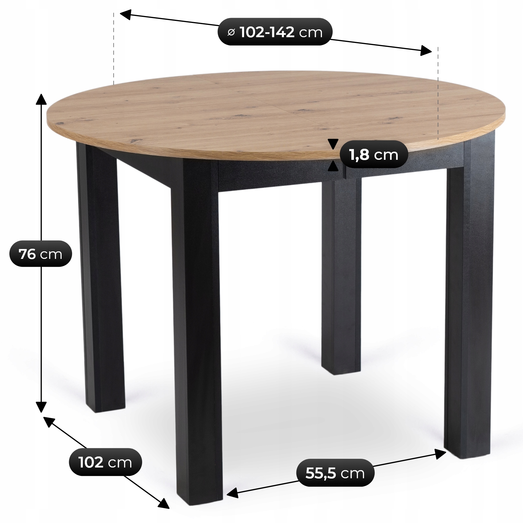- Stół rozkładany – okrągły blat o średnicy 102 cm z możliwością powiększenia do 142 cm.