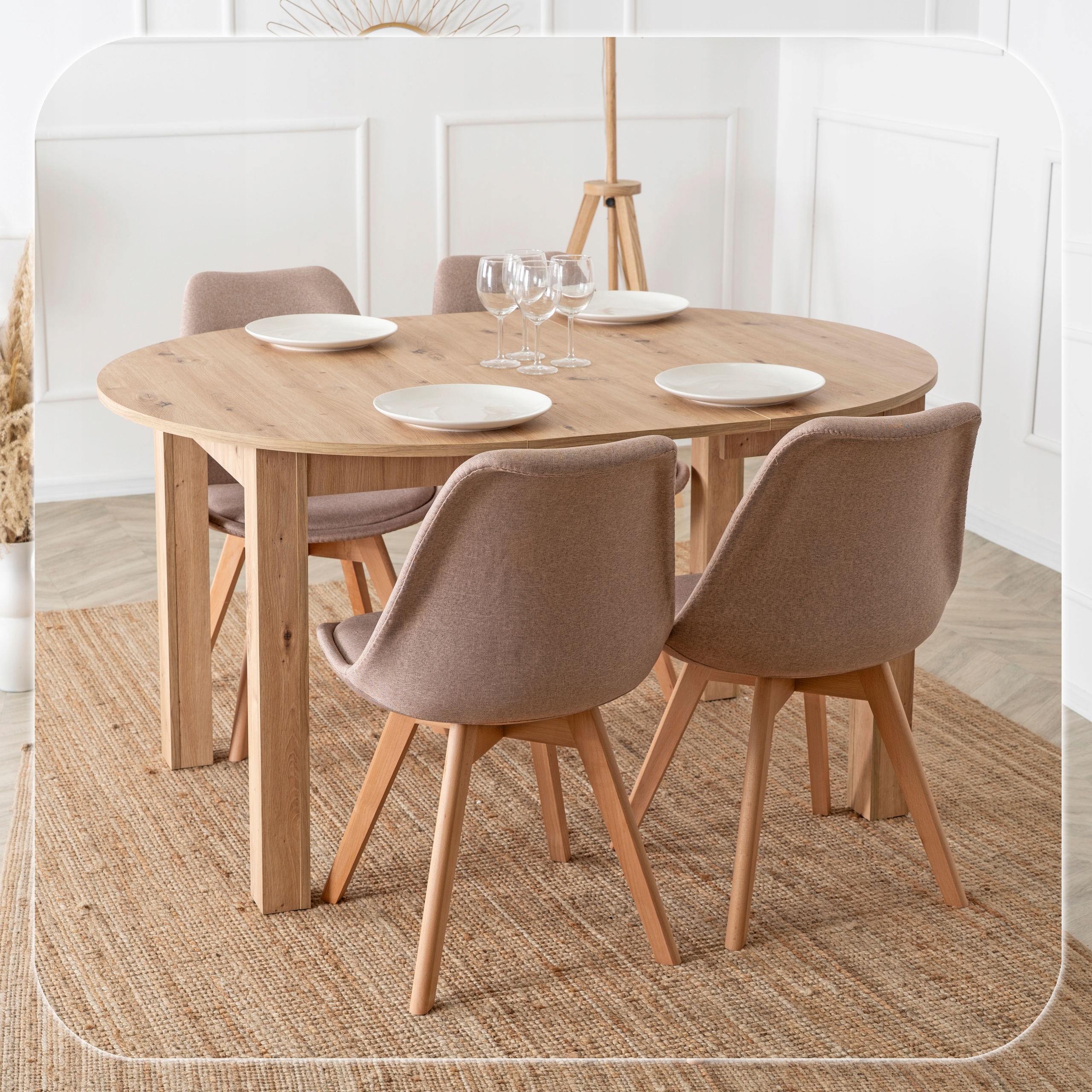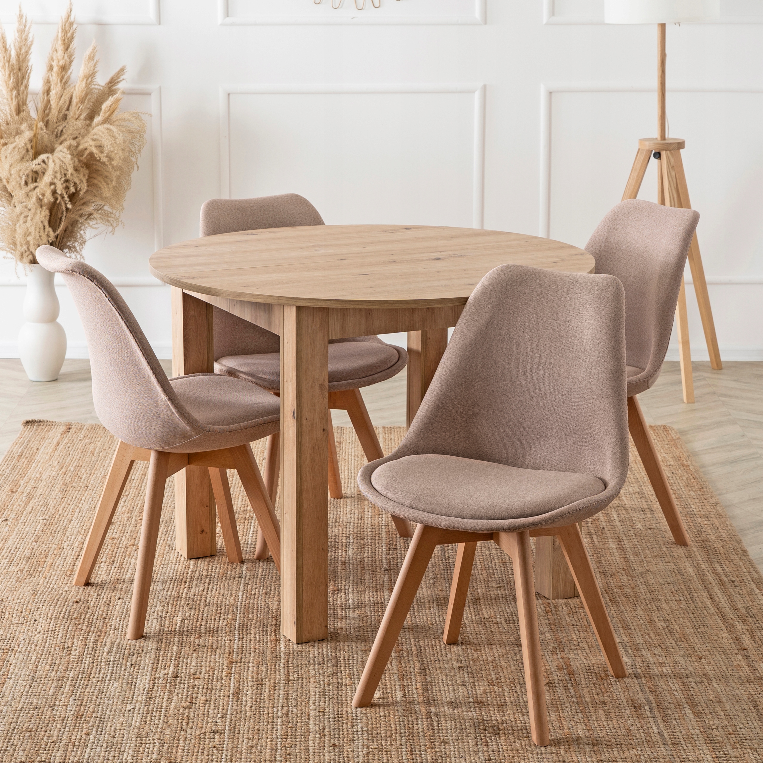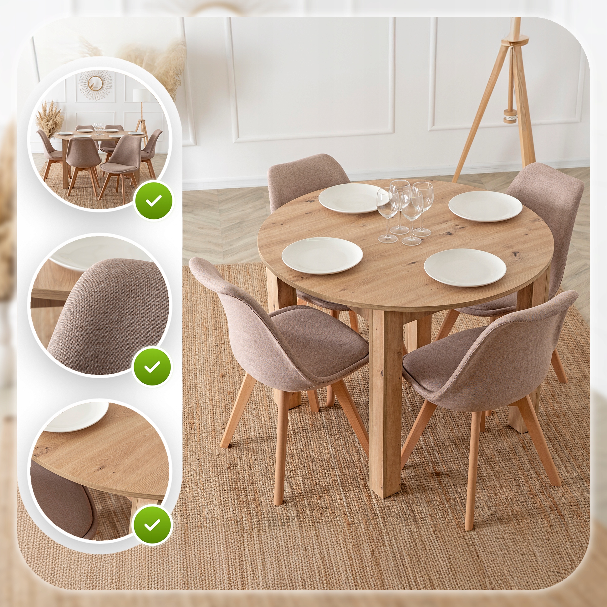 Zestaw składa się z okrągłego stołu w kolorze dąb artisan oraz czterech krzeseł na drewnianych nogach. Całość prezentuje się lekko, nowocześnie i elegancko. Dzięki klasycznym kolorom łatwo go dopasować do różnych aranżacji.