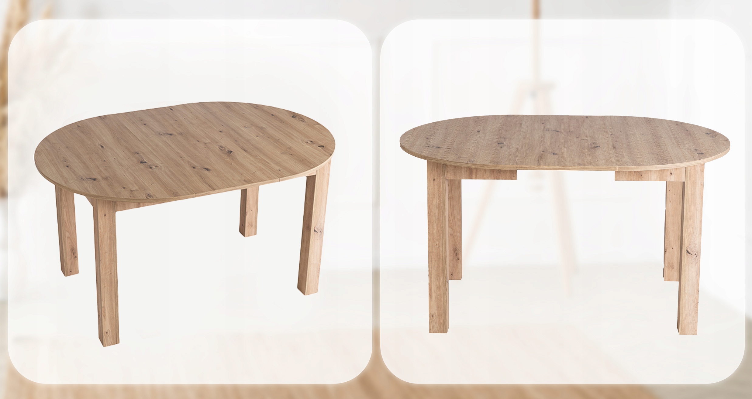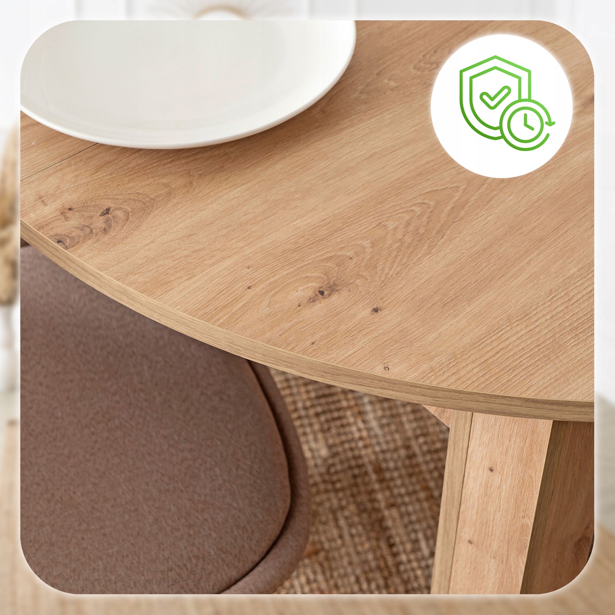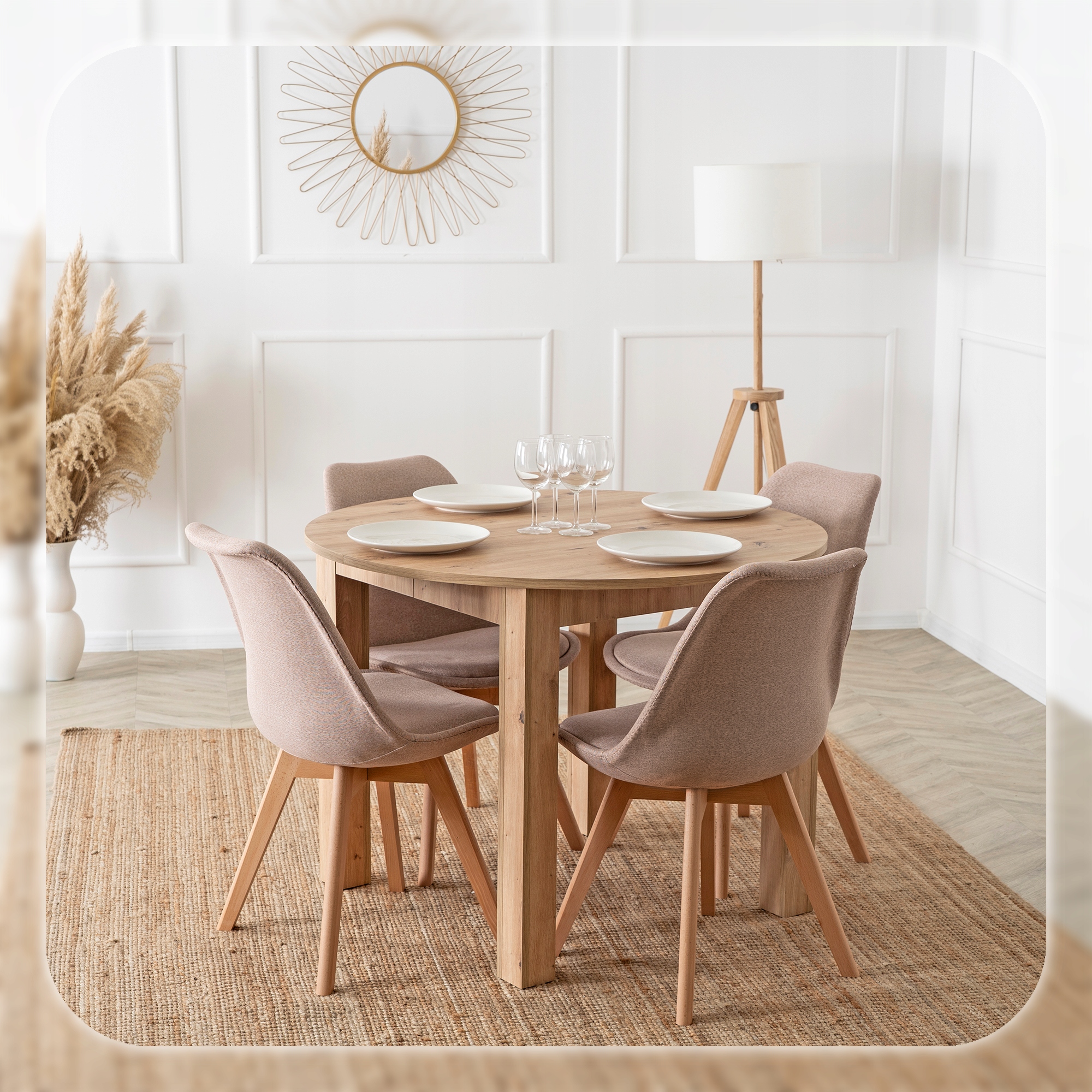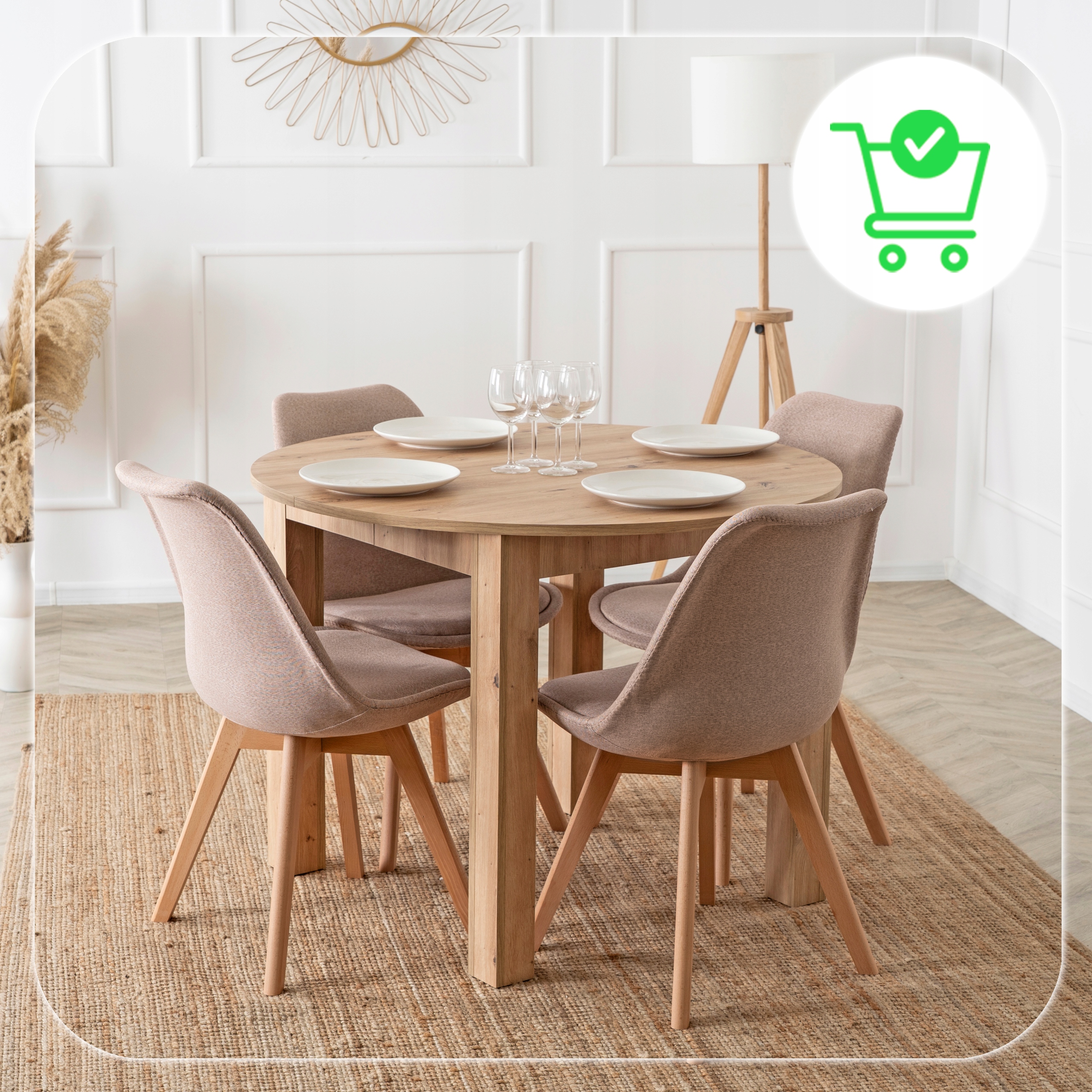 Zestaw składa się z okrągłego stołu w kolorze dąb artisan oraz czterech krzeseł na drewnianych nogach. Całość prezentuje się lekko, nowocześnie i elegancko. Dzięki klasycznym kolorom łatwo go dopasować do różnych aranżacji.