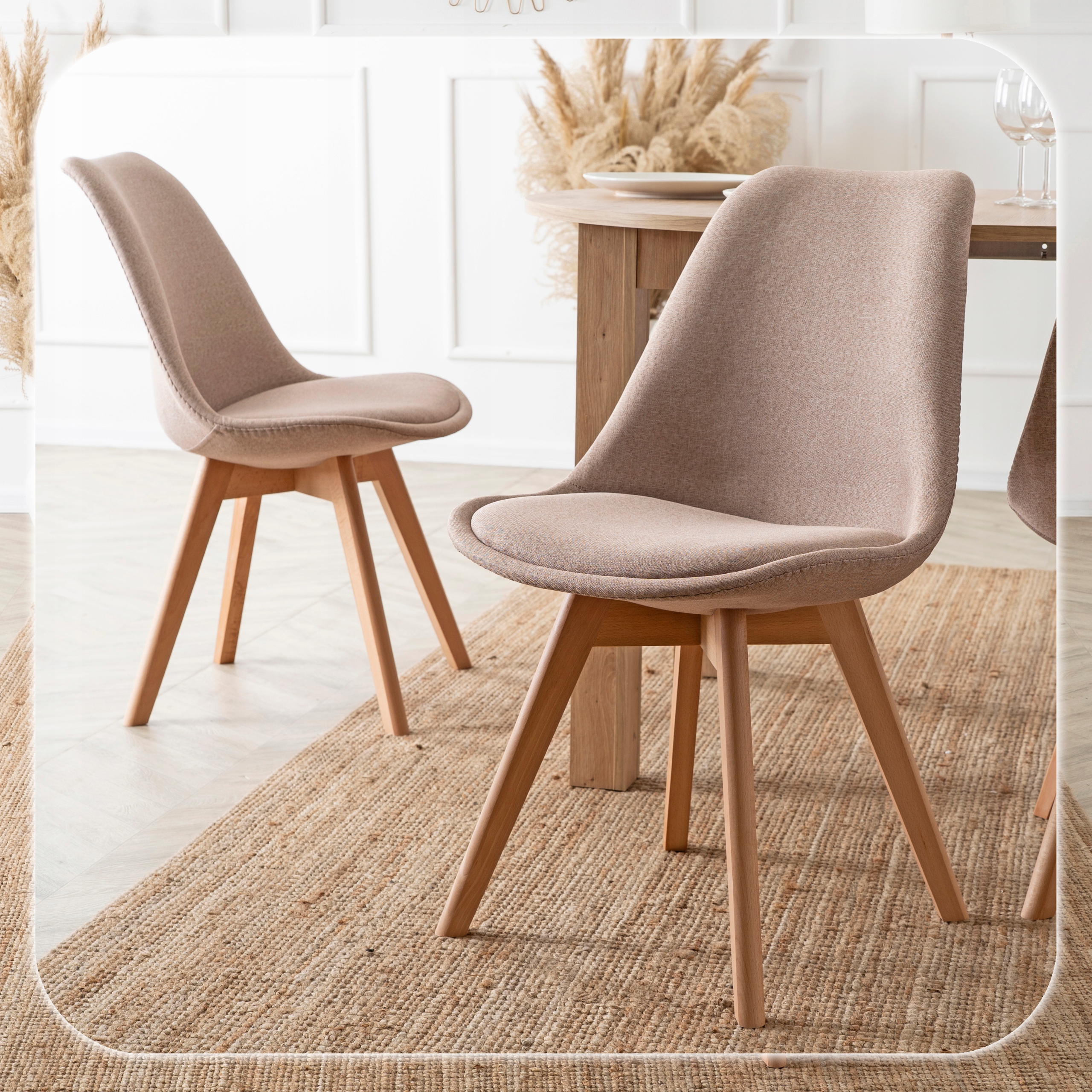 - Wygodne krzesła Nevel – miękkie, tapicerowane siedziska w odcieniu beżu gwarantują komfort siedzenia nawet podczas długich spotkań przy stole.