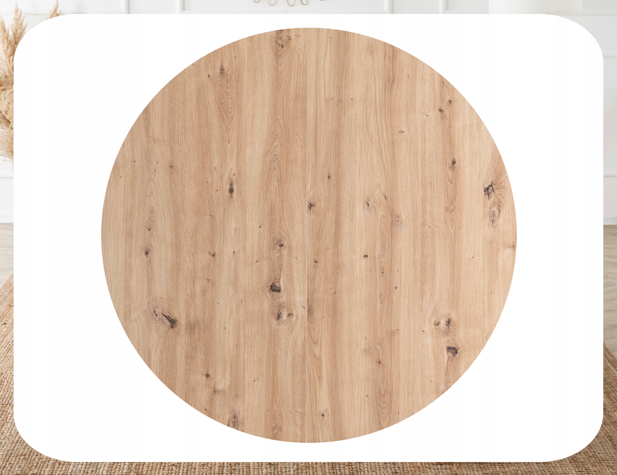- Stół rozkładany – okrągły blat o średnicy 102 cm z możliwością powiększenia do 142 cm.
