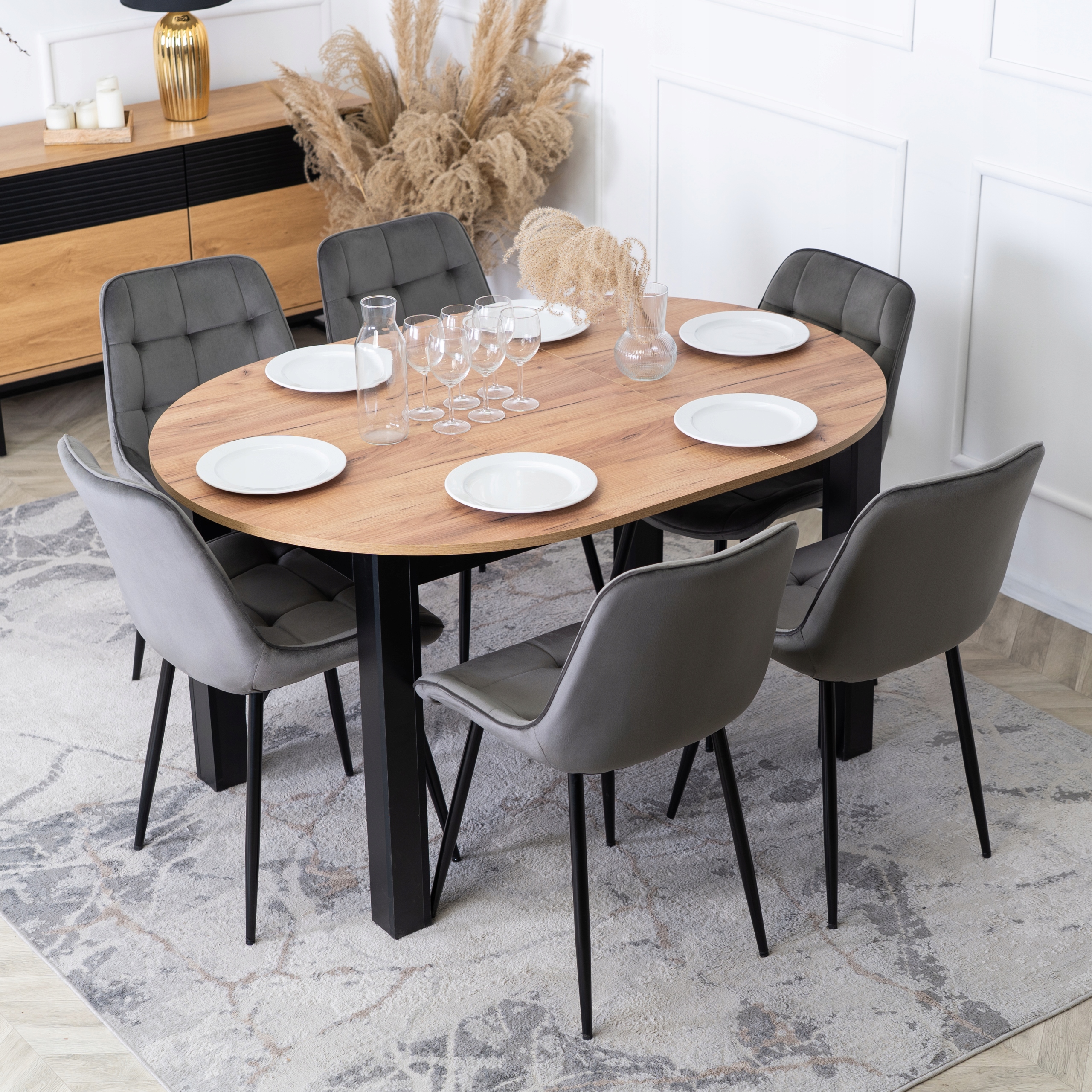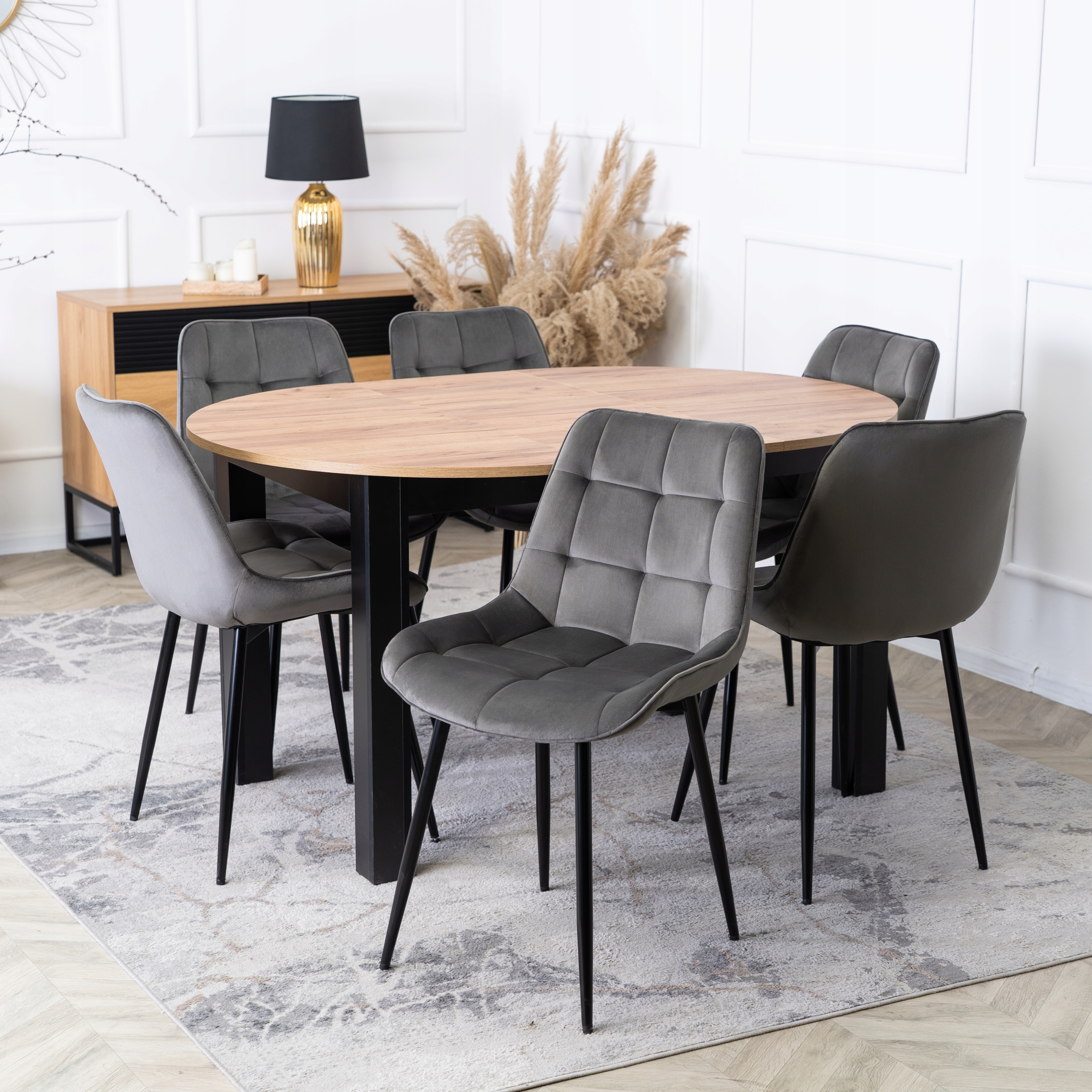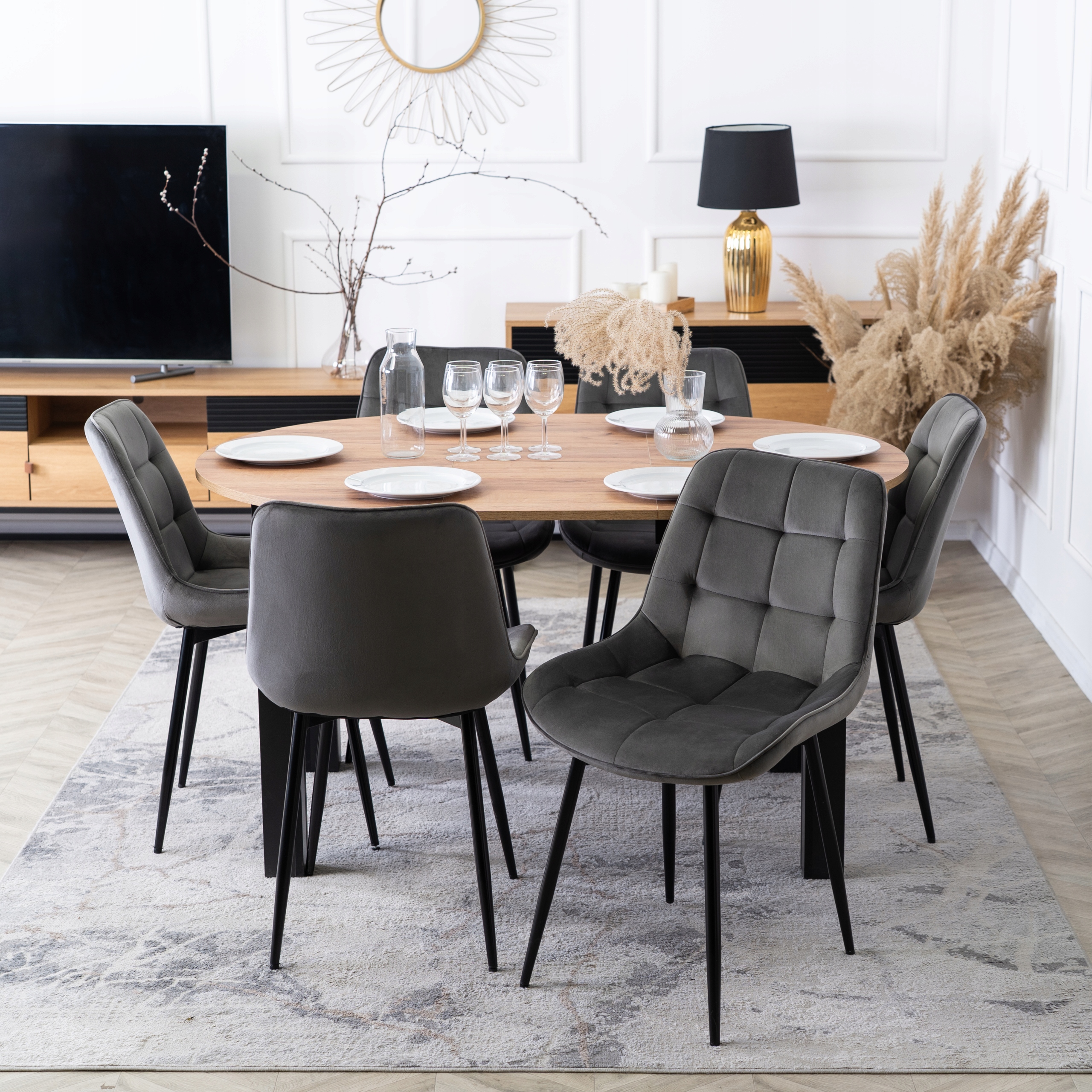 Zestaw składa się z okrągłego stołu w kolorze dąb craft oraz sześciu tapicerowanych krzeseł w kolorze szarym. Całość prezentuje się lekko, nowocześnie i elegancko.