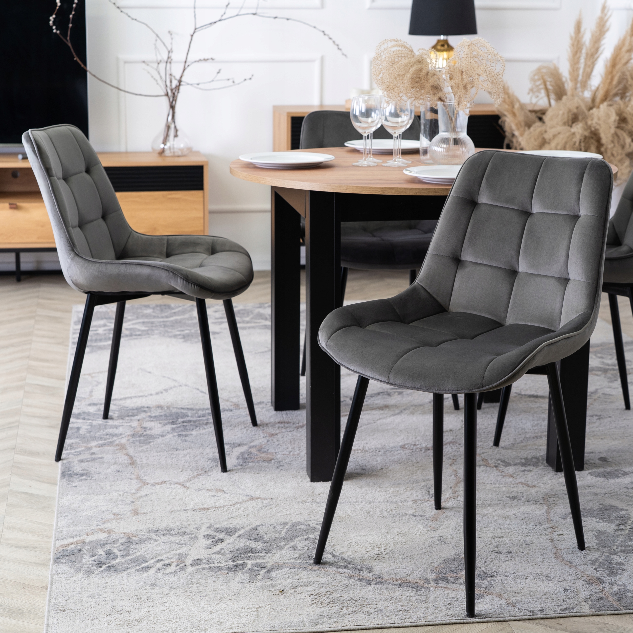 To doskonałe połączenie nowoczesnego designu z wygodą. Siedzisko oraz oparcie mają lekko wklęsły kształt, dzięki czemu dobrze dopasowują się do sylwetki podczas siedzenia. Krzesło jest tapicerowane pikowaną tkaniną welurową, która dodaje elegancji.