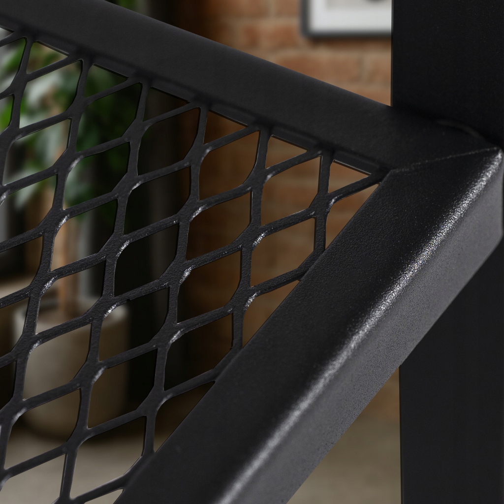 - Ażurowe półki z siatki stalowej – umożliwiają cyrkulację powietrza, idealne na buty, książki lub dekoracje