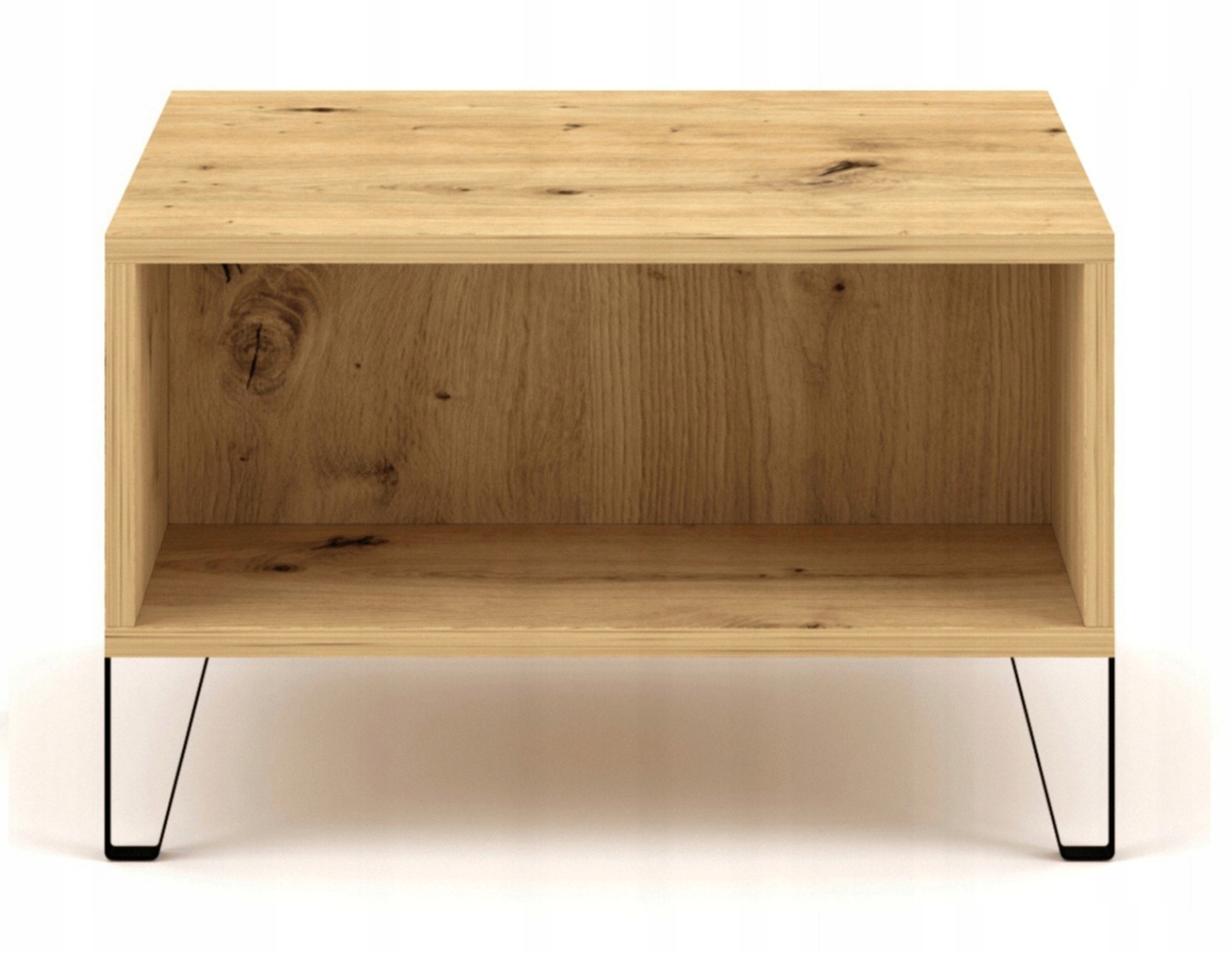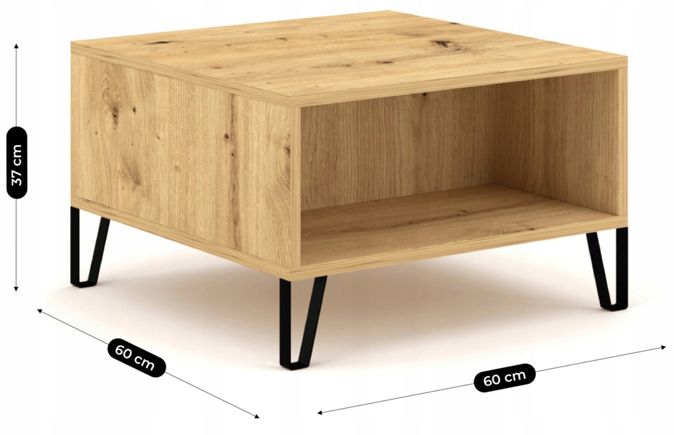 Stolik ma kwadratowy blat (60 x 60 cm) oraz otwartą półkę pod spodem, która zapewnia dodatkowe miejsce na przechowywanie np. książek, czasopism czy pilotów.