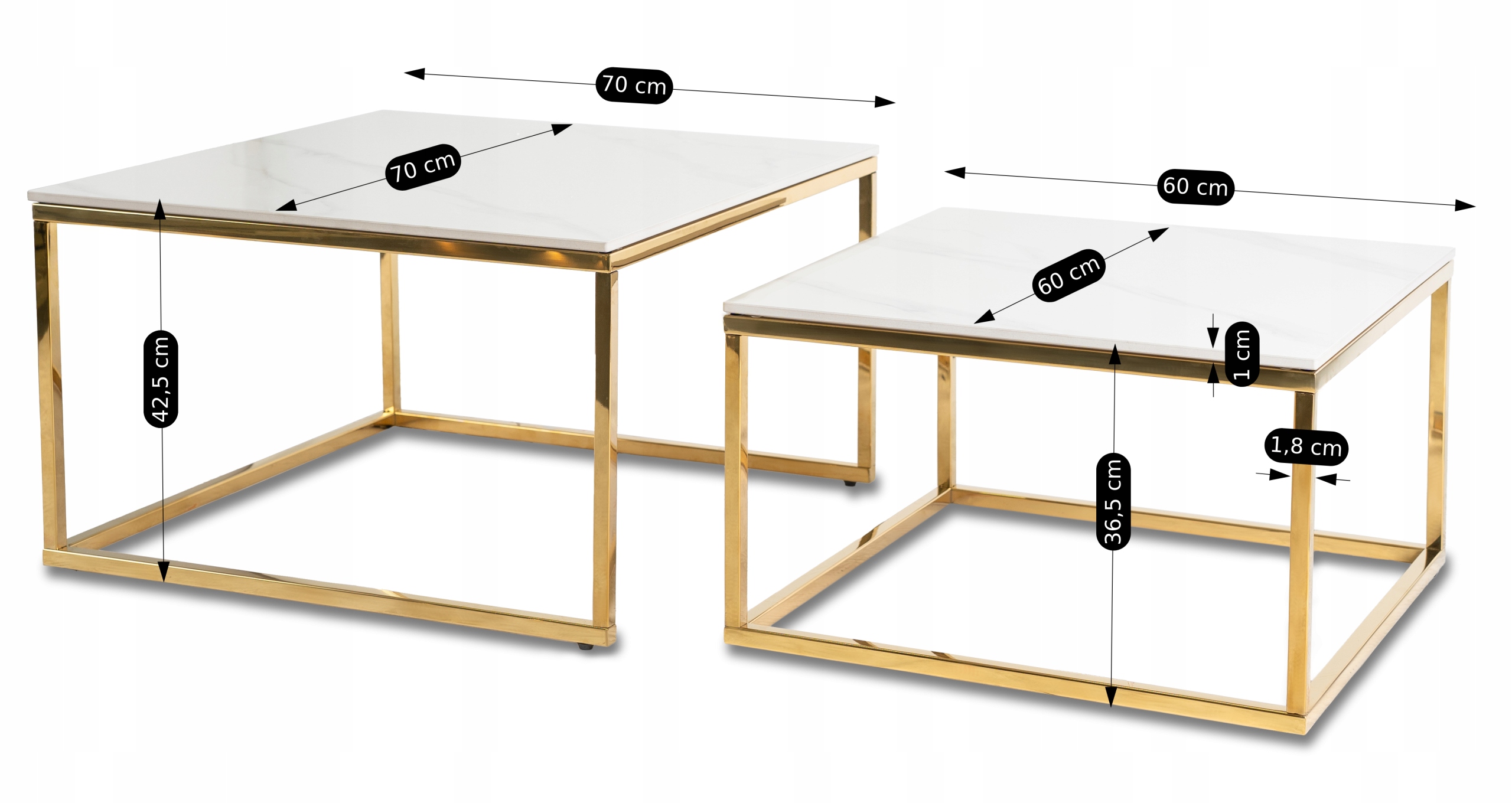 Blaty stolików są ceramiczne i stylizowane na biały marmur z efektem połysku. Wyglądają bardzo elegancko, są solidne i łatwe w czyszczeniu.