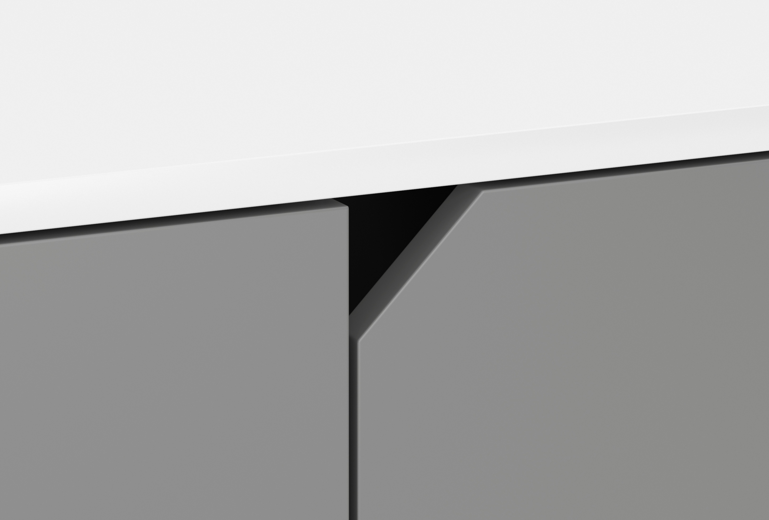 Stylowe połączenie kolorów – biel, szary kolor i uchwyt w kolorze drewna przyciąga wzrok.