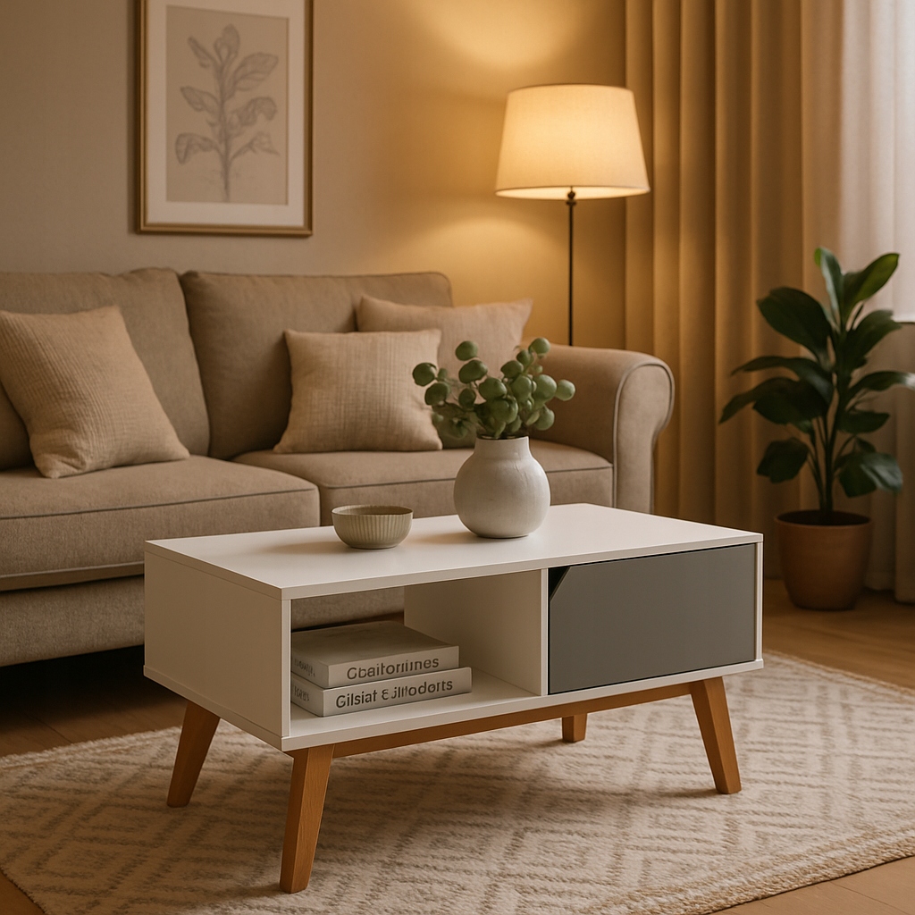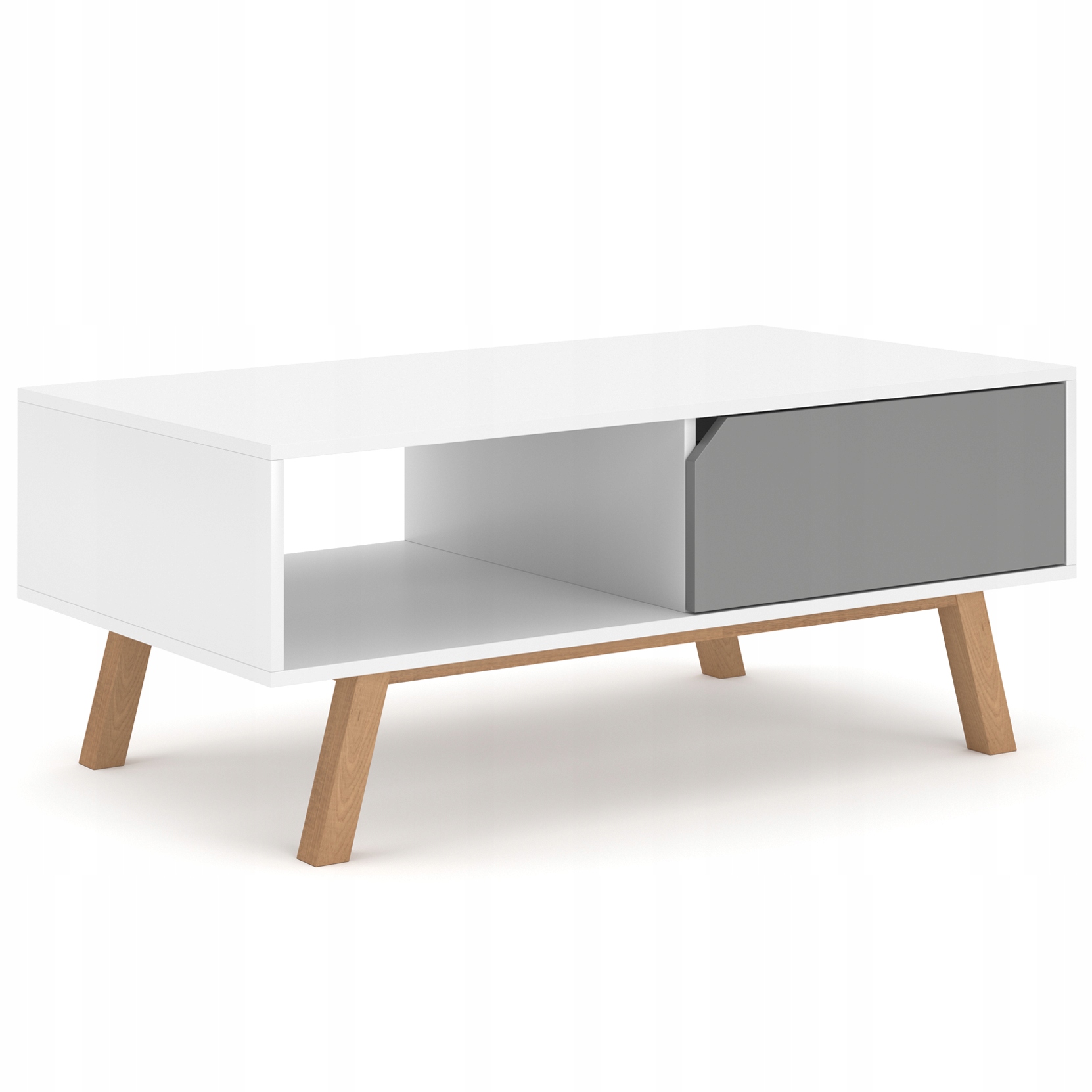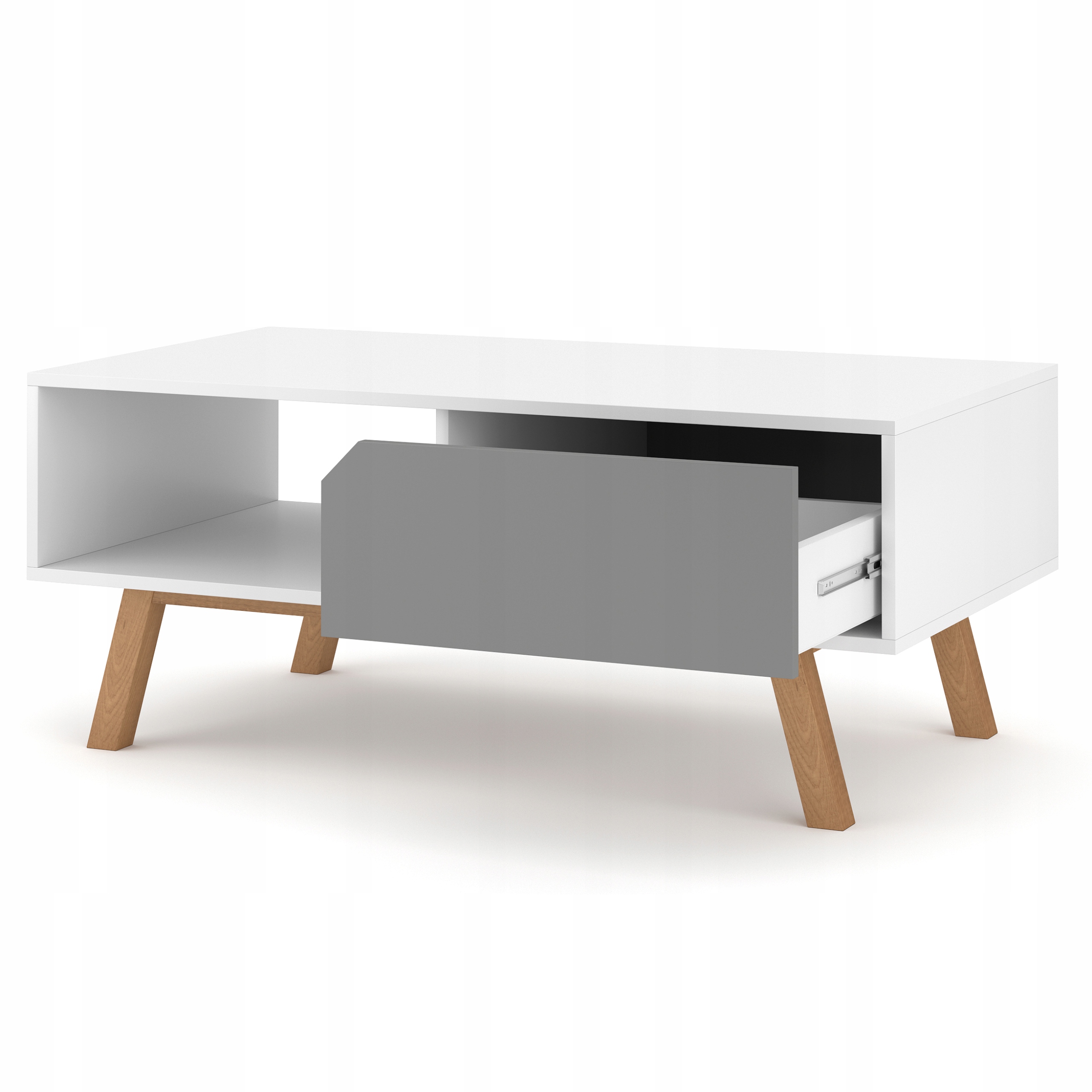 Funkcjonalny stolik kawowy charakteryzuje się białą konstrukcją, kontrastową szarą frontową szufladą oraz smukłymi, drewnianymi nogami.