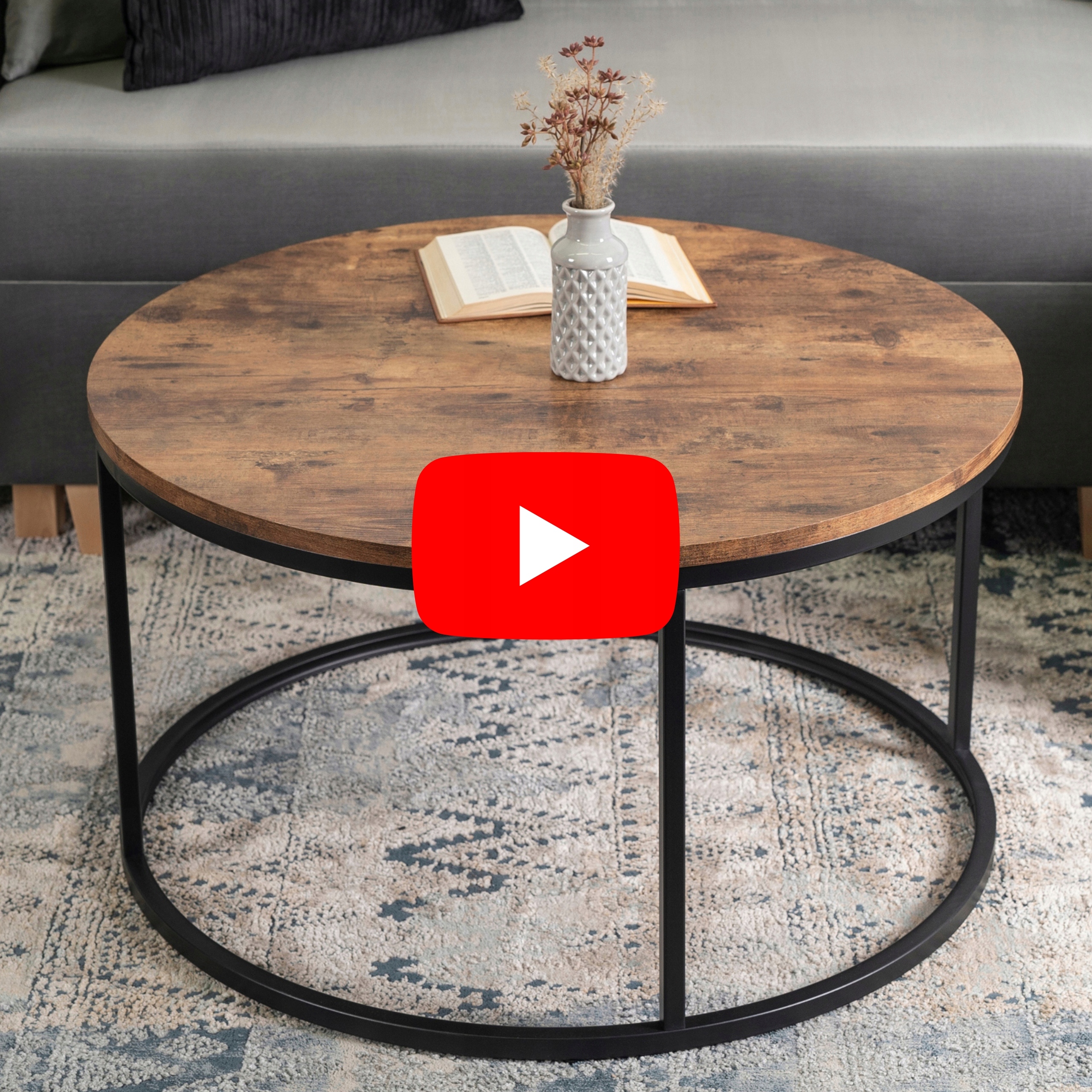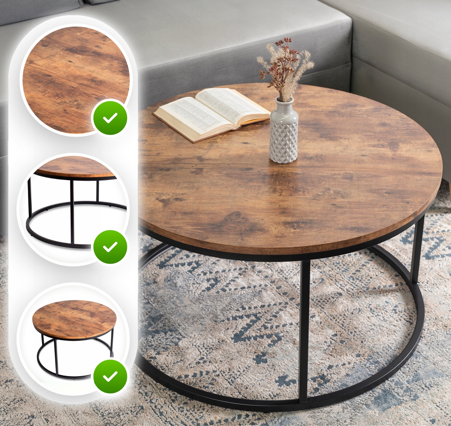 ✨ Stolik Kawowy Okrągły Ława Mała Salon Dąb Rustykalny Czarny TIM MAX