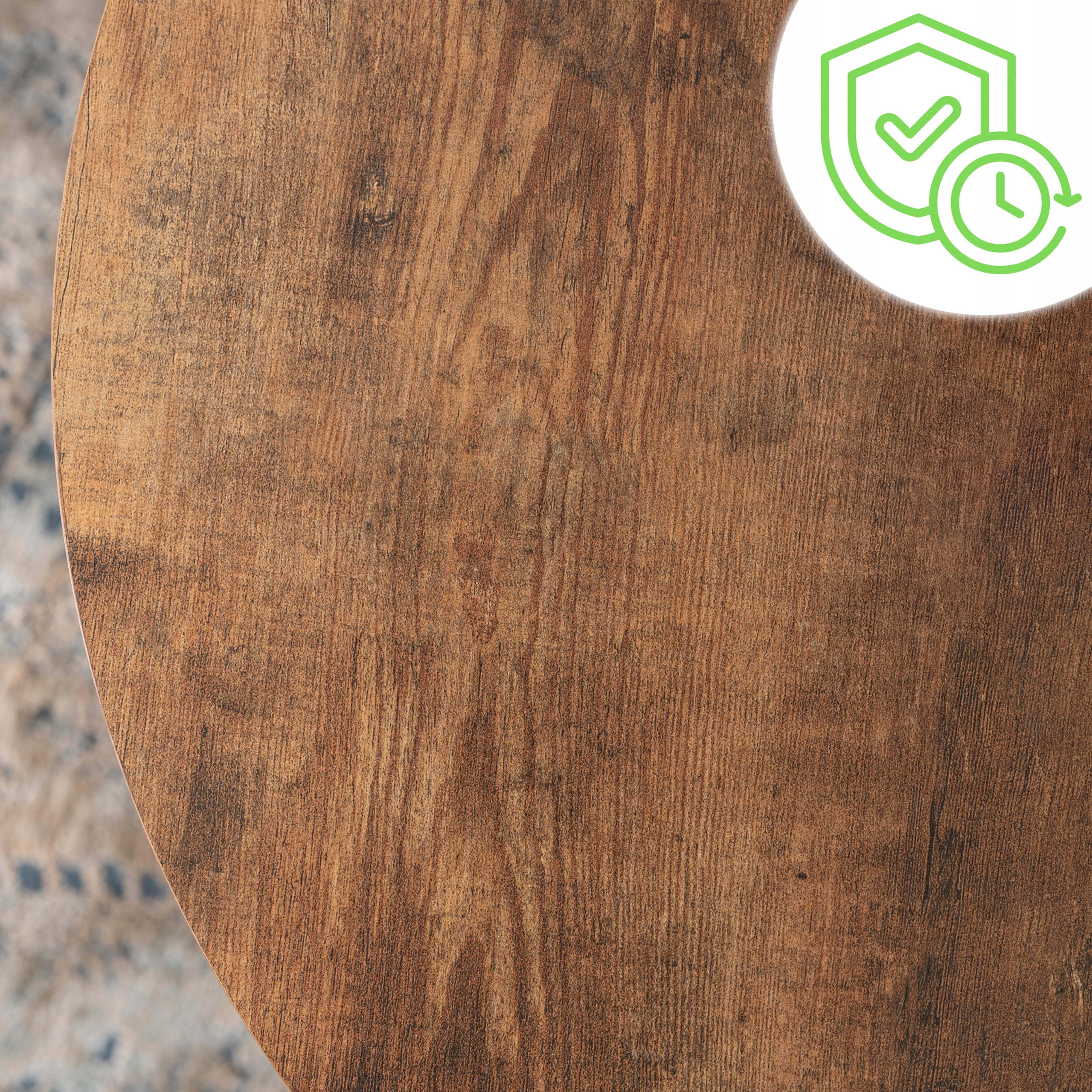 Blat wykonano z płyty MDF z wykończeniem w kolorze dębu rustykalnego. Materiał ten zapewnia trwałość, a jednocześnie efektowny wygląd z widocznym usłojeniem. Powierzchnia blatu jest zabezpieczona warstwą ochronną ułatwiającą pielęgnację.