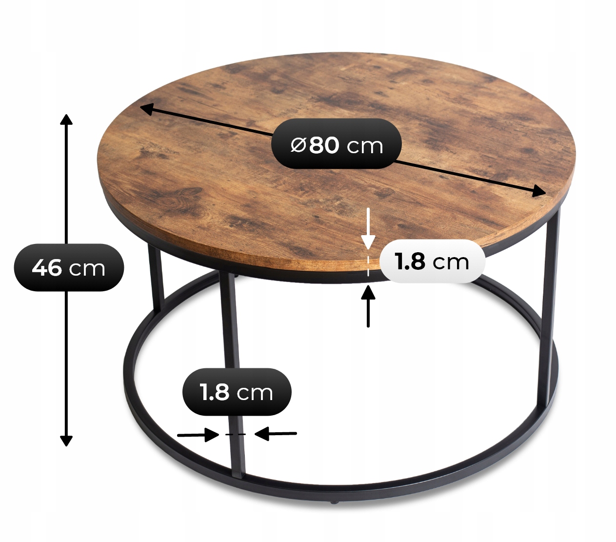Stylowy stolik o wysokości 46 cm i średnicy blatu 80 cm to doskonały wybór do salonu, pokoju dziennego, biura lub eleganckiej strefy wypoczynkowej.