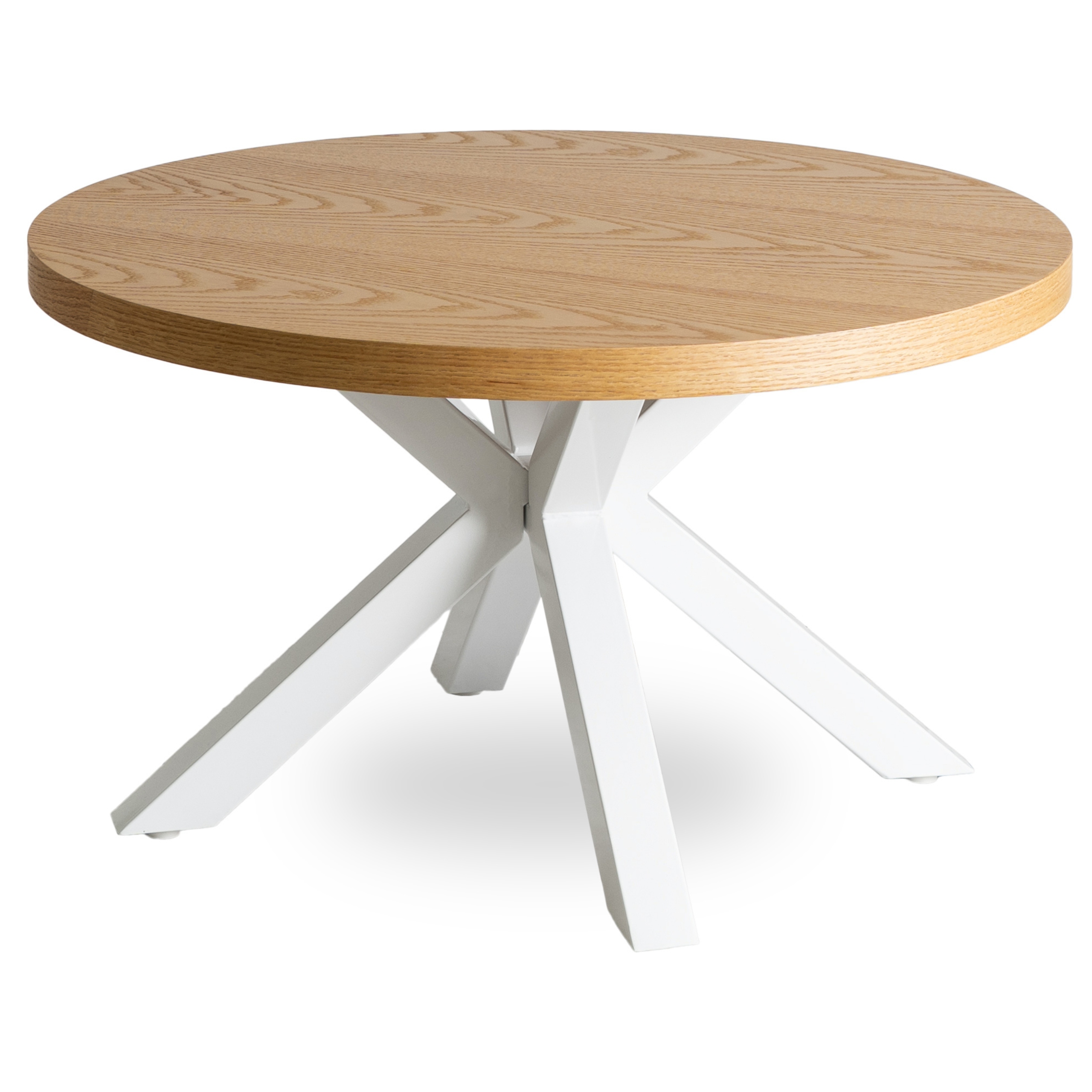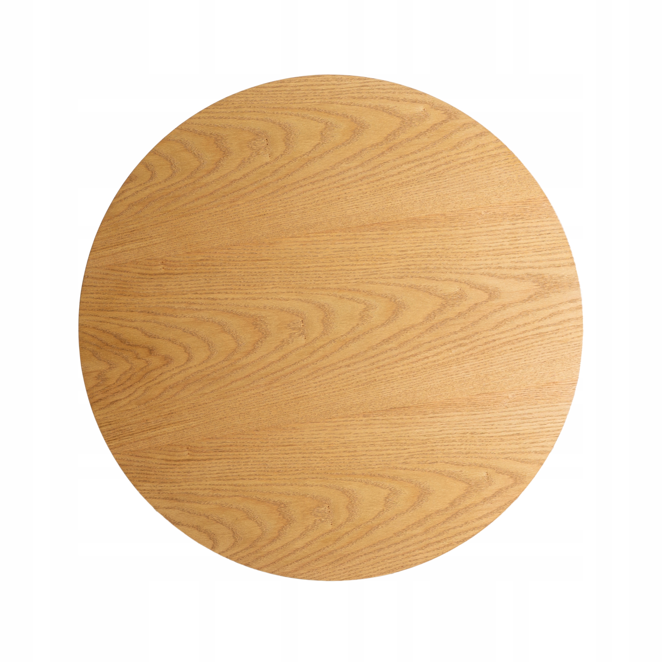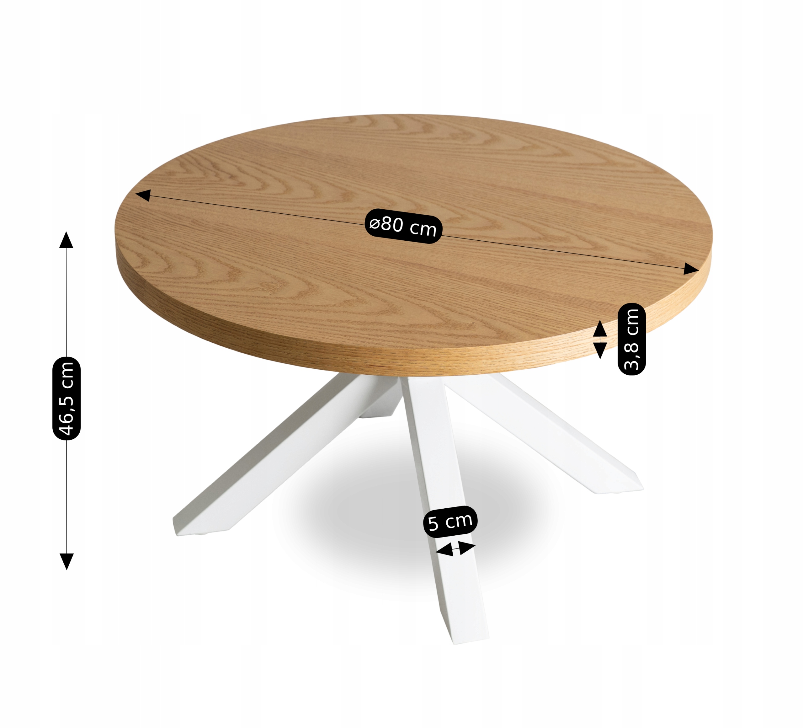 Mała ława o wymiarach 80 x 80 x 46,5 cm to piękny mebel idealny do salonu, gabinetu, pokoju gościnnego. Ma okrągły blat w modnym kolorze dębu złotego i stylową białą podstawę z metalu.