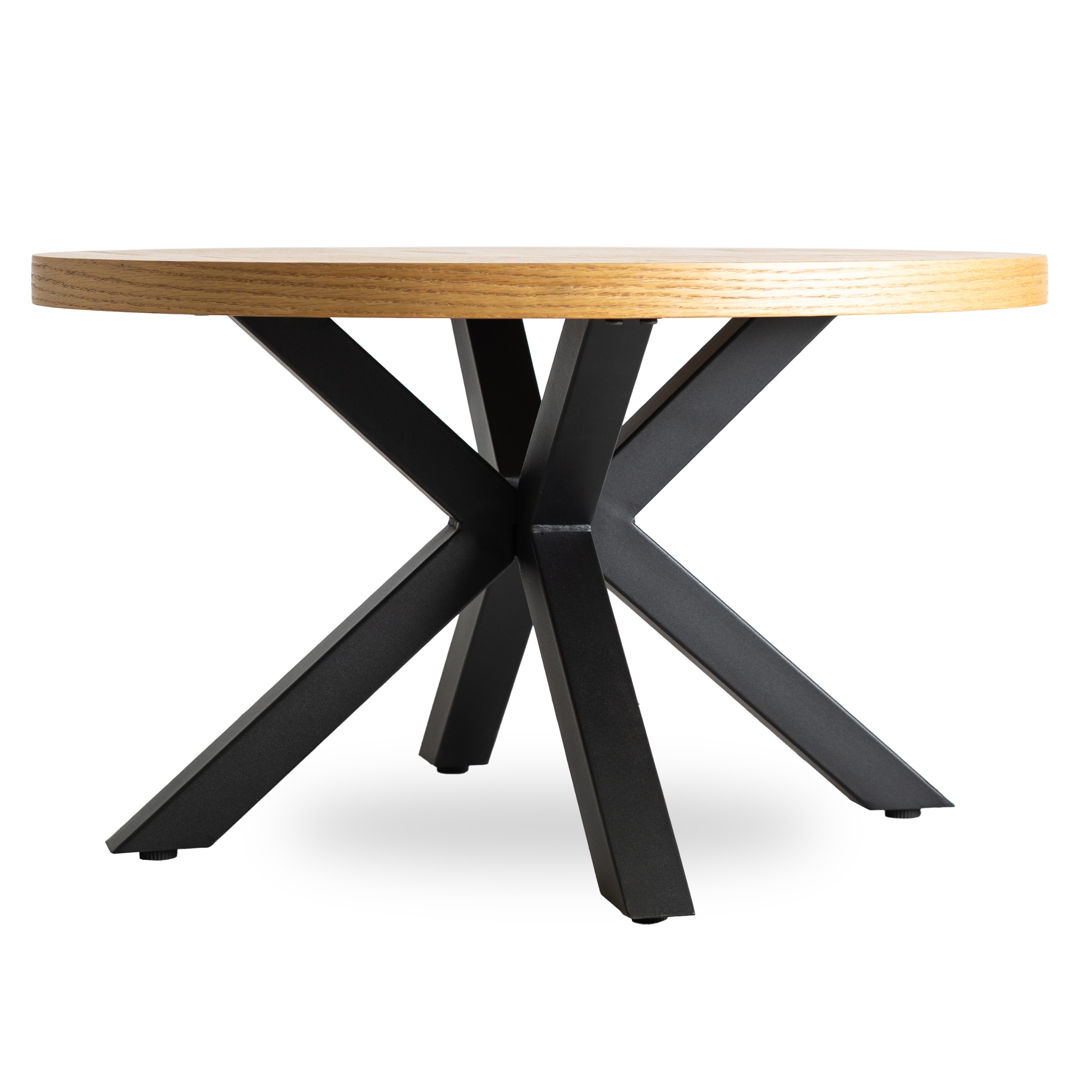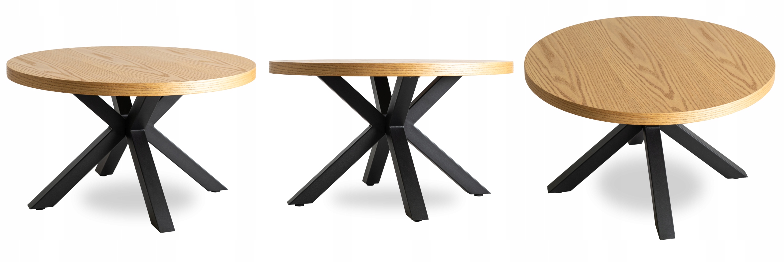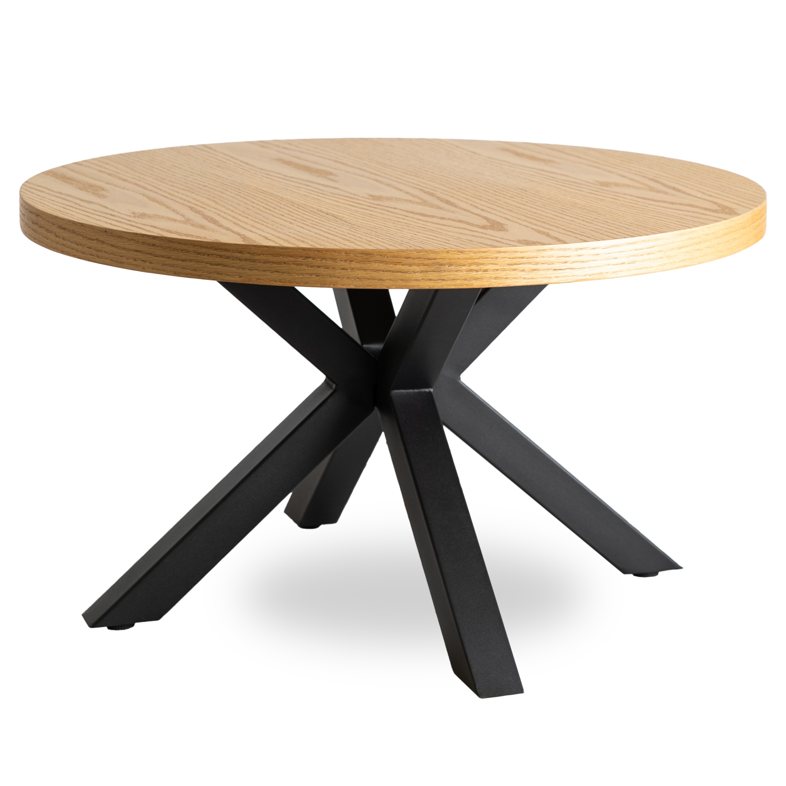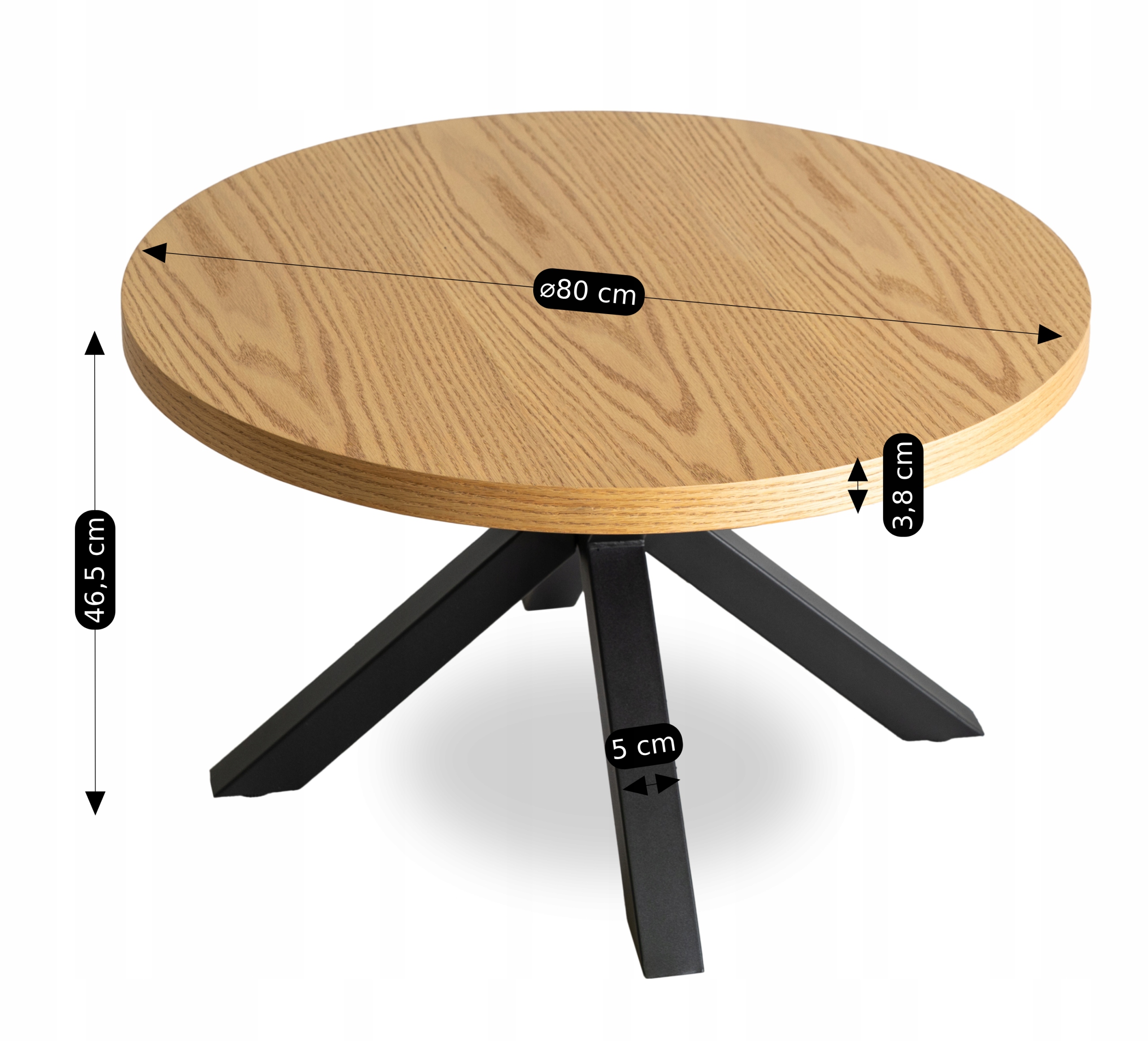 Mała ława o wymiarach 80 x 80 x 46,5 cm to piękny mebel idealny do salonu, gabinetu, pokoju gościnnego. Ma okrągły blat w modnym kolorze dębu złotego i stylową czarną podstawę z metalu.