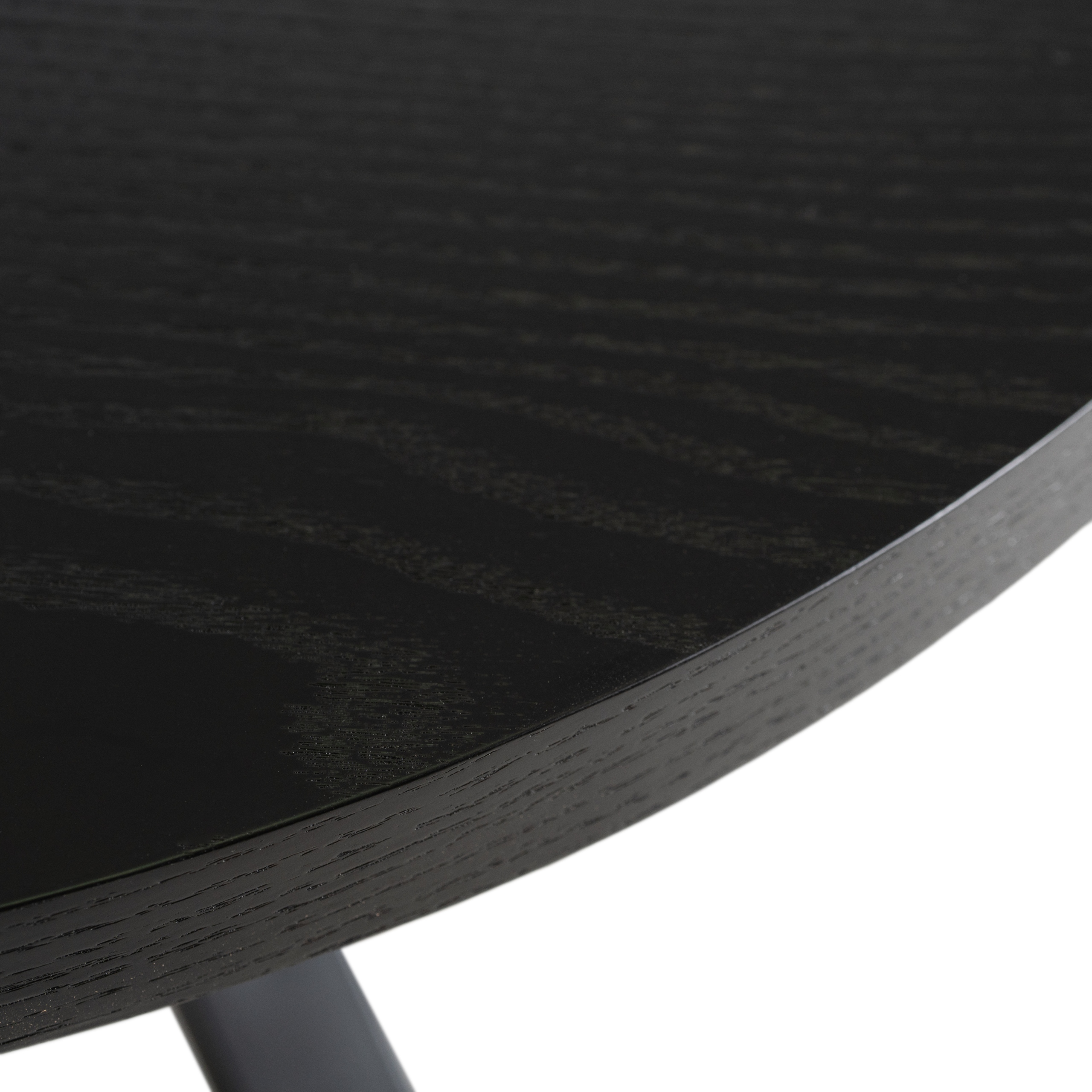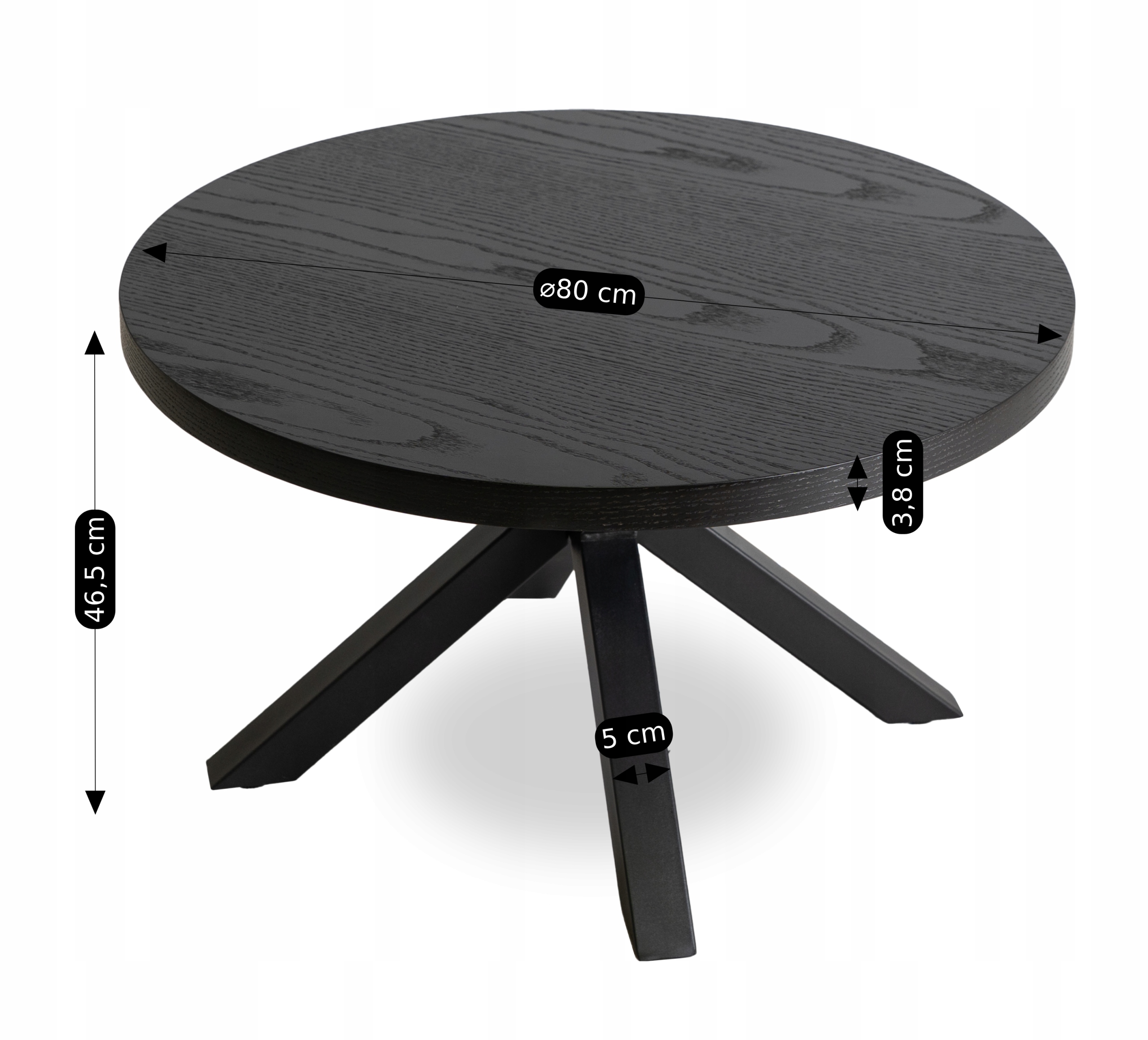 Mała ława o wymiarach 80 x 80 x 46,5 cm to piękny mebel idealny do salonu, gabinetu, pokoju gościnnego. Ma okrągły blat w eleganckim czarnym kolorze i stylową czarną podstawę z metalu.