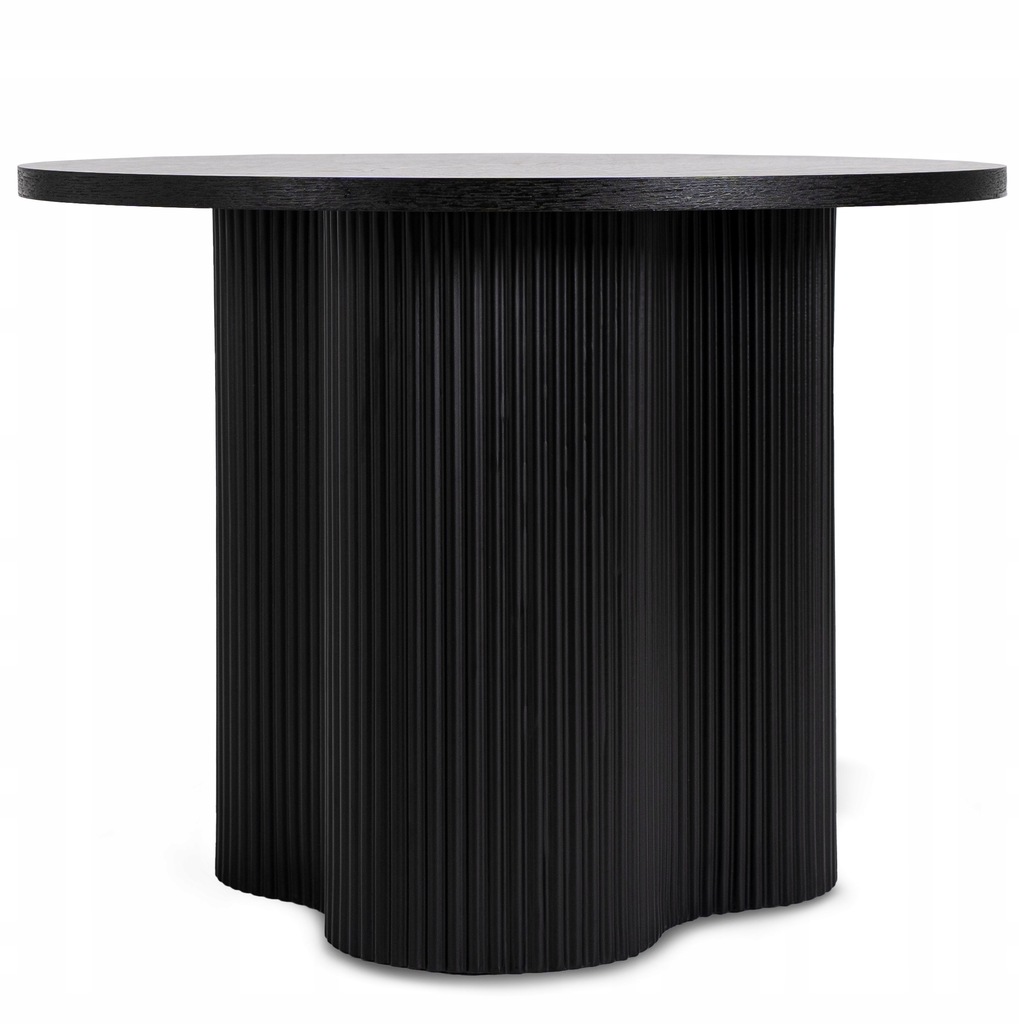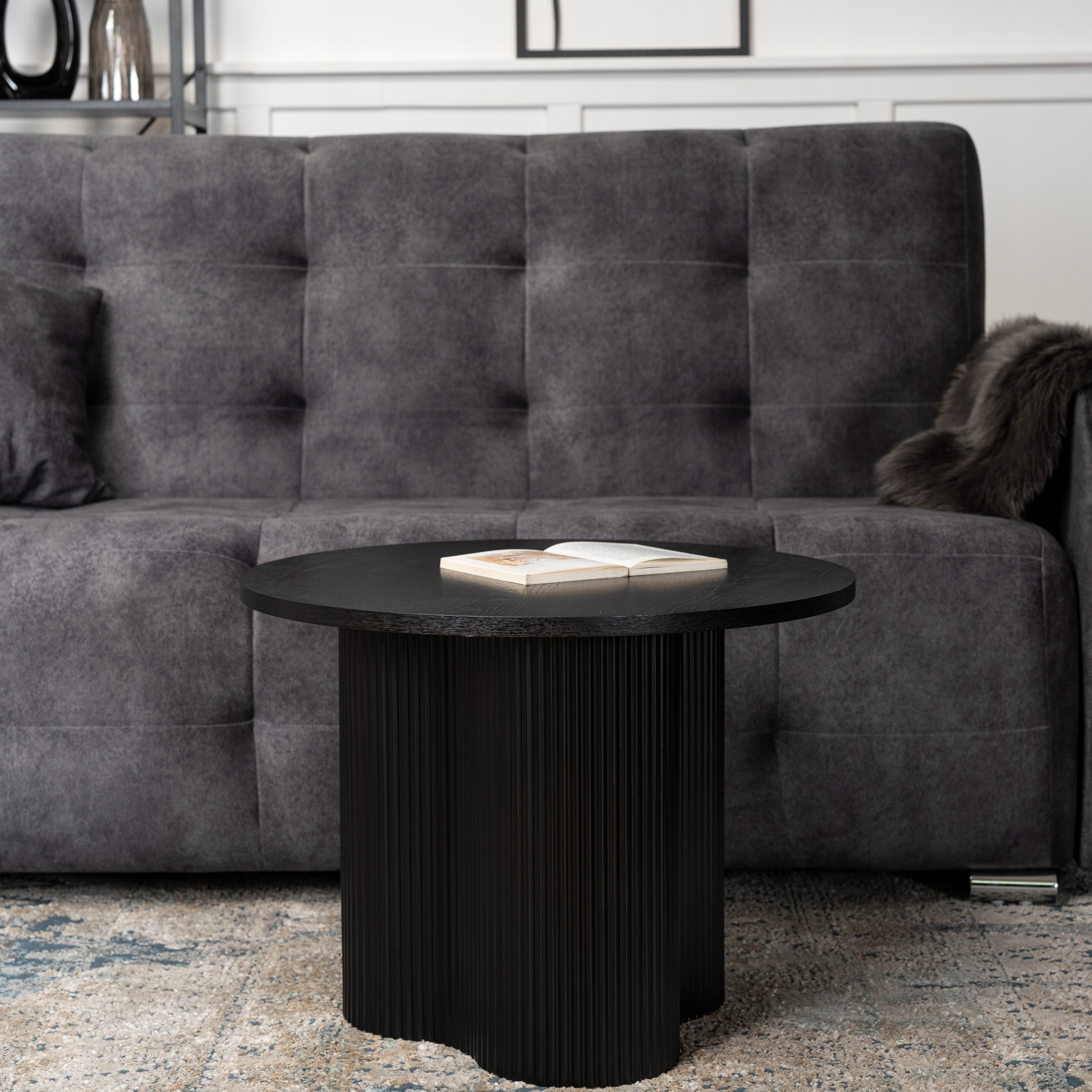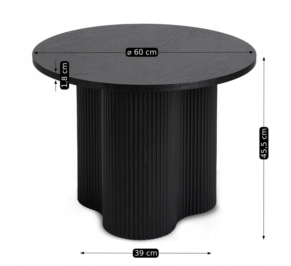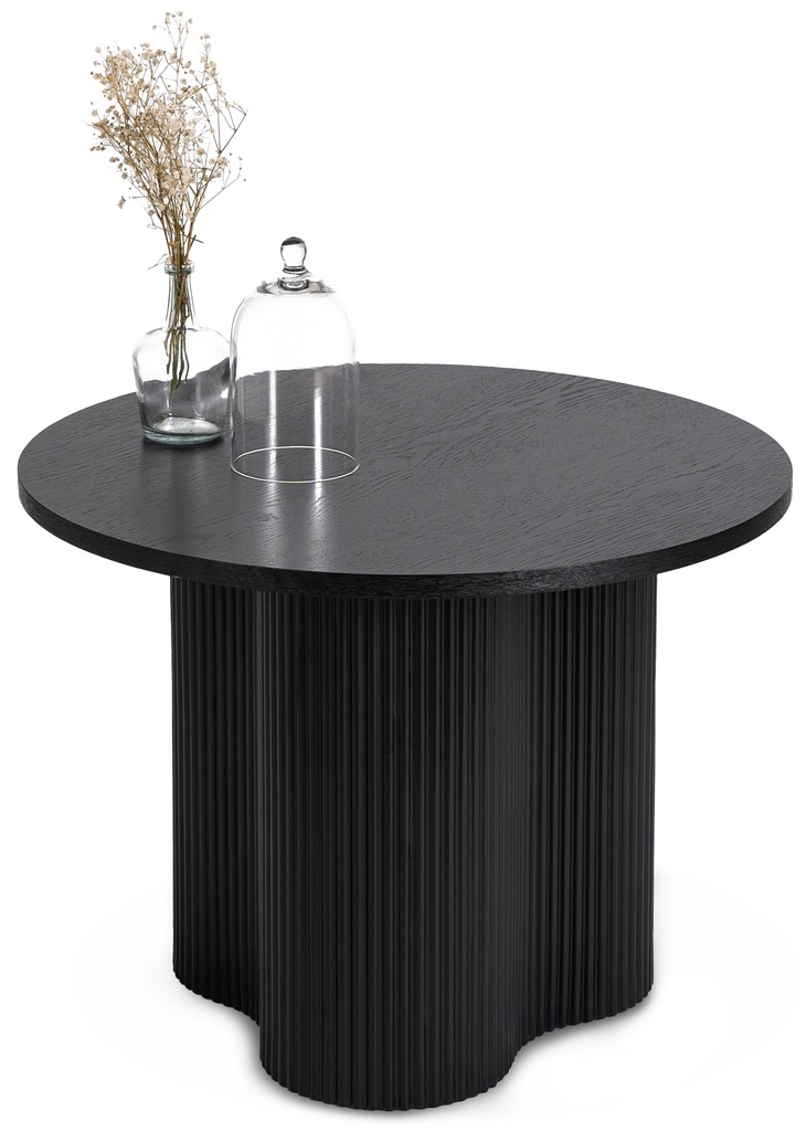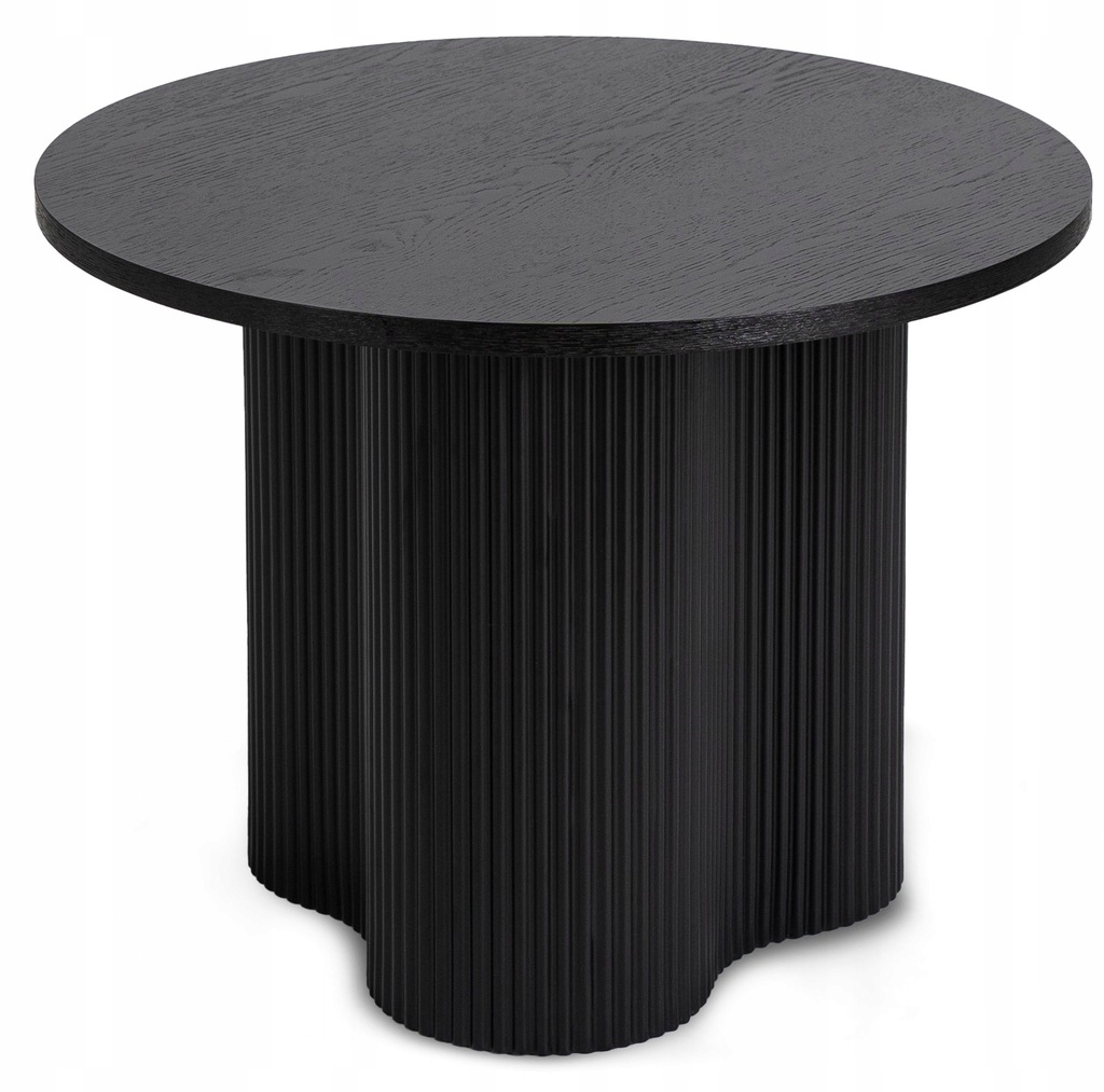Mała ława o wymiarach 60 x 60 x 45,5 cm to piękny mebel idealny do salonu, gabinetu, pokoju gościnnego. Ma okrągły blat i stylową ryflowaną podstawę w eleganckim czarnym kolorze.