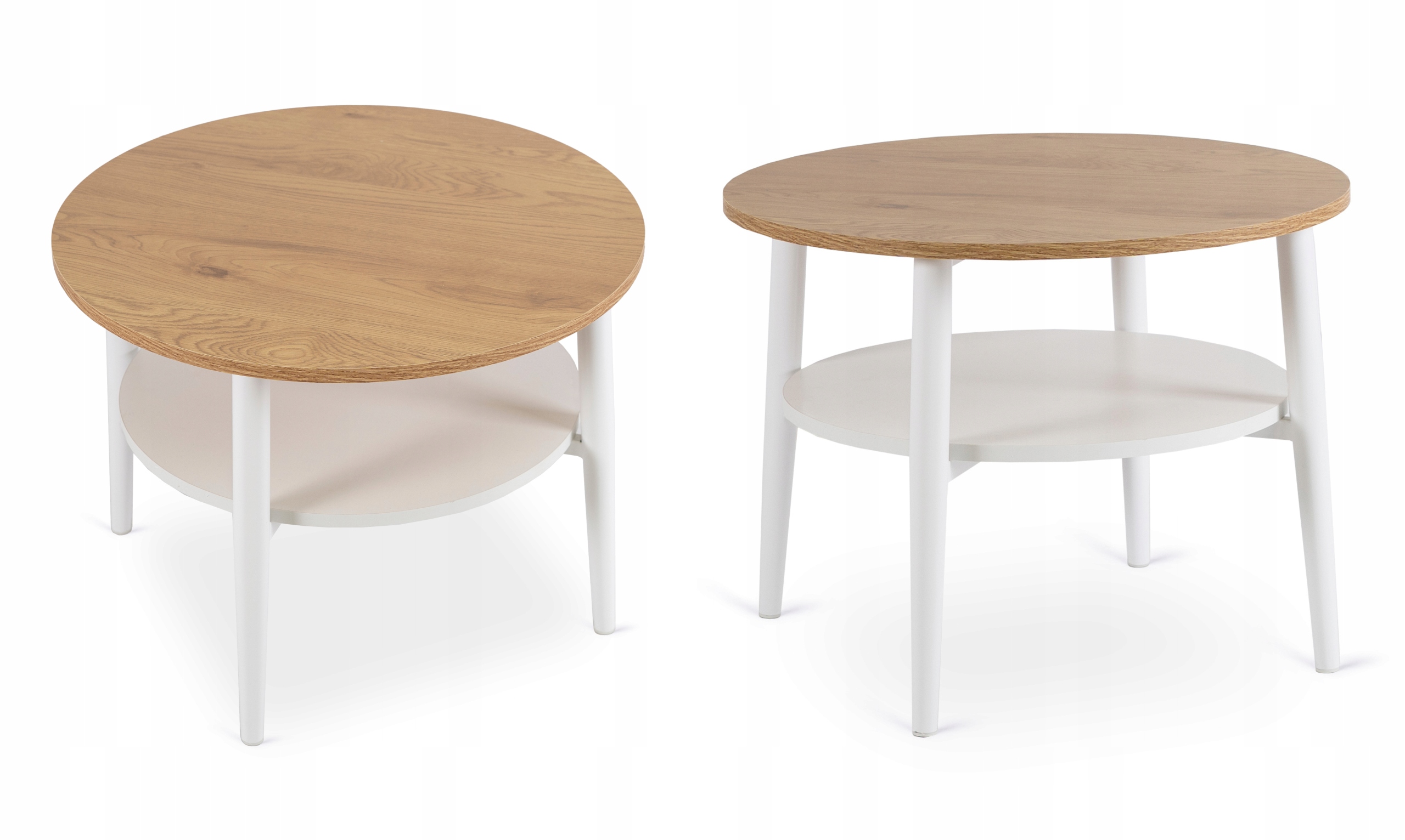 Okrągły stolik z dwoma blatami i malowanymi na biało metalowymi nogami. Minimalistyczny design, który wprowadza do wnętrza elegancję i lekkość. Świetnie pasuje do aranżacji w stylu skandynawskim.