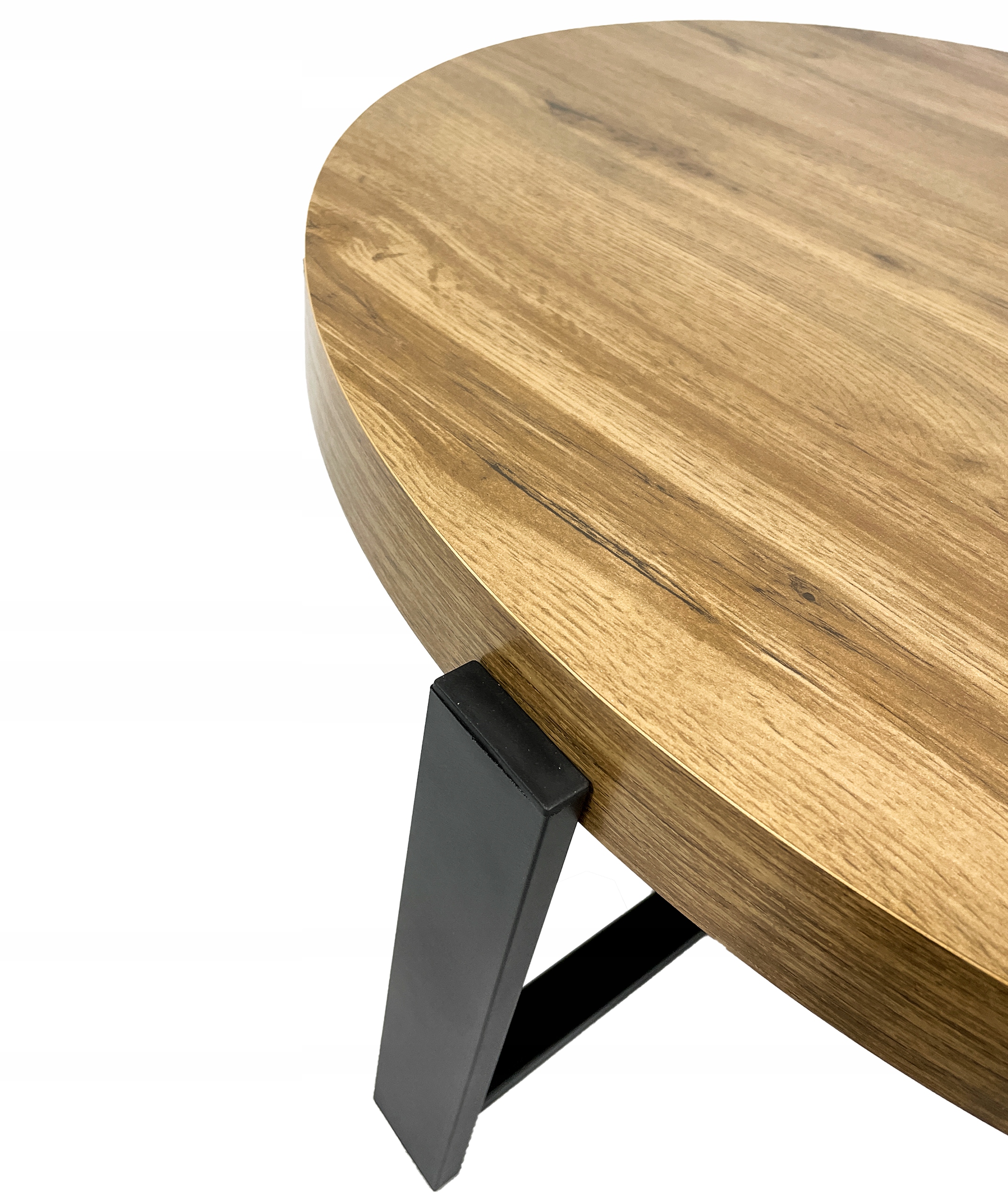 ✔️ Materiał: blat z płyty MDF pokryty melaminą w kolorze dębu, czarna podstawa stalowa malowana proszkowo.