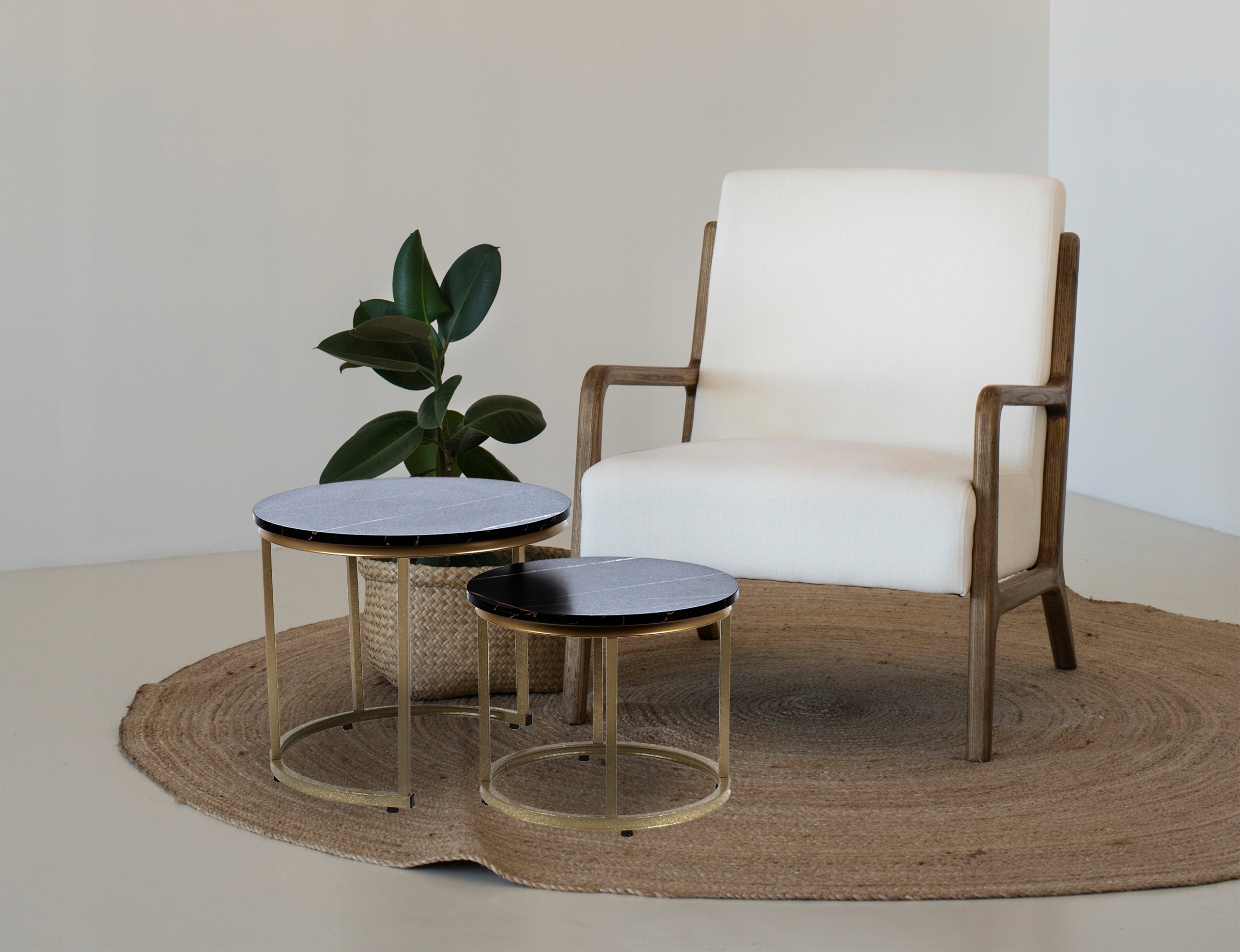 - Blaty stolików w kolorze czarnego marmuru.