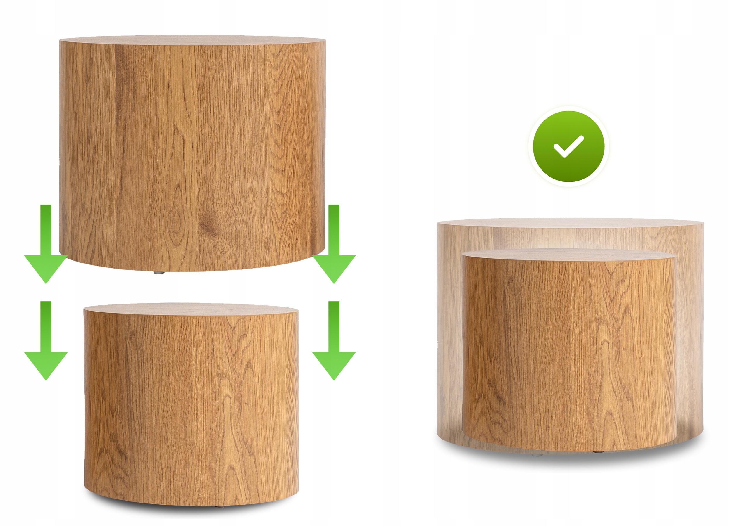 Dodatkową zaletą jest możliwość schowania mniejszego stolika wewnątrz większego – wystarczy wsunąć go pod spód, by w kilka sekund zyskać więcej przestrzeni w salonie. To idealne rozwiązanie dla miłośników praktycznego designu i eleganckiego stylu. Mimo masywnego wyglądu stoliki są lekkie i łatwe w przenoszeniu, dzięki czemu bez trudu dopasujesz ich układ do potrzeb chwili.