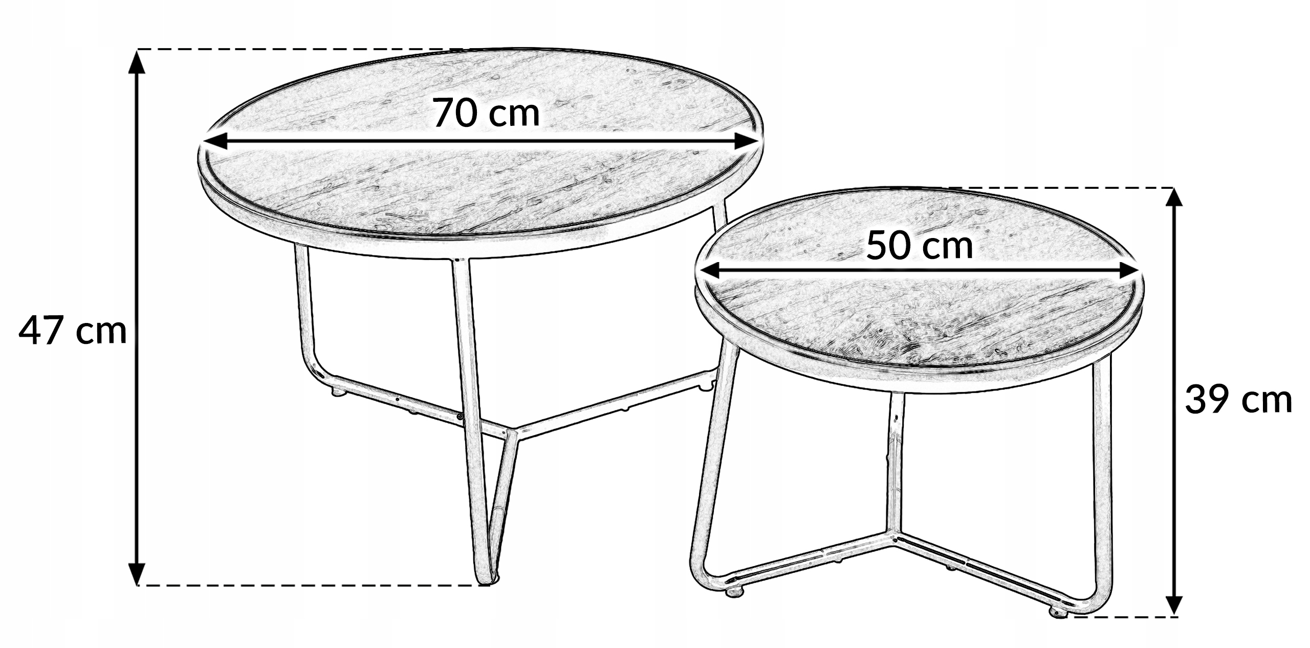 - Rozmiar mniejszego stolika: fi 50x39cm.