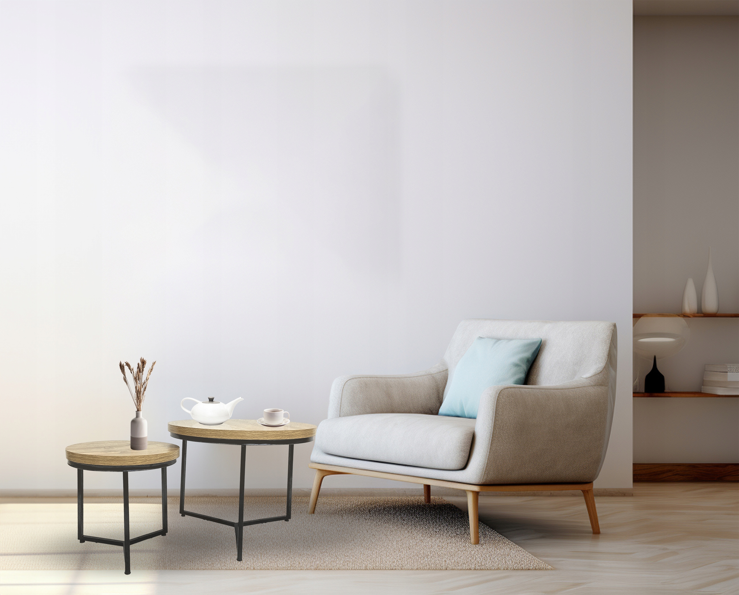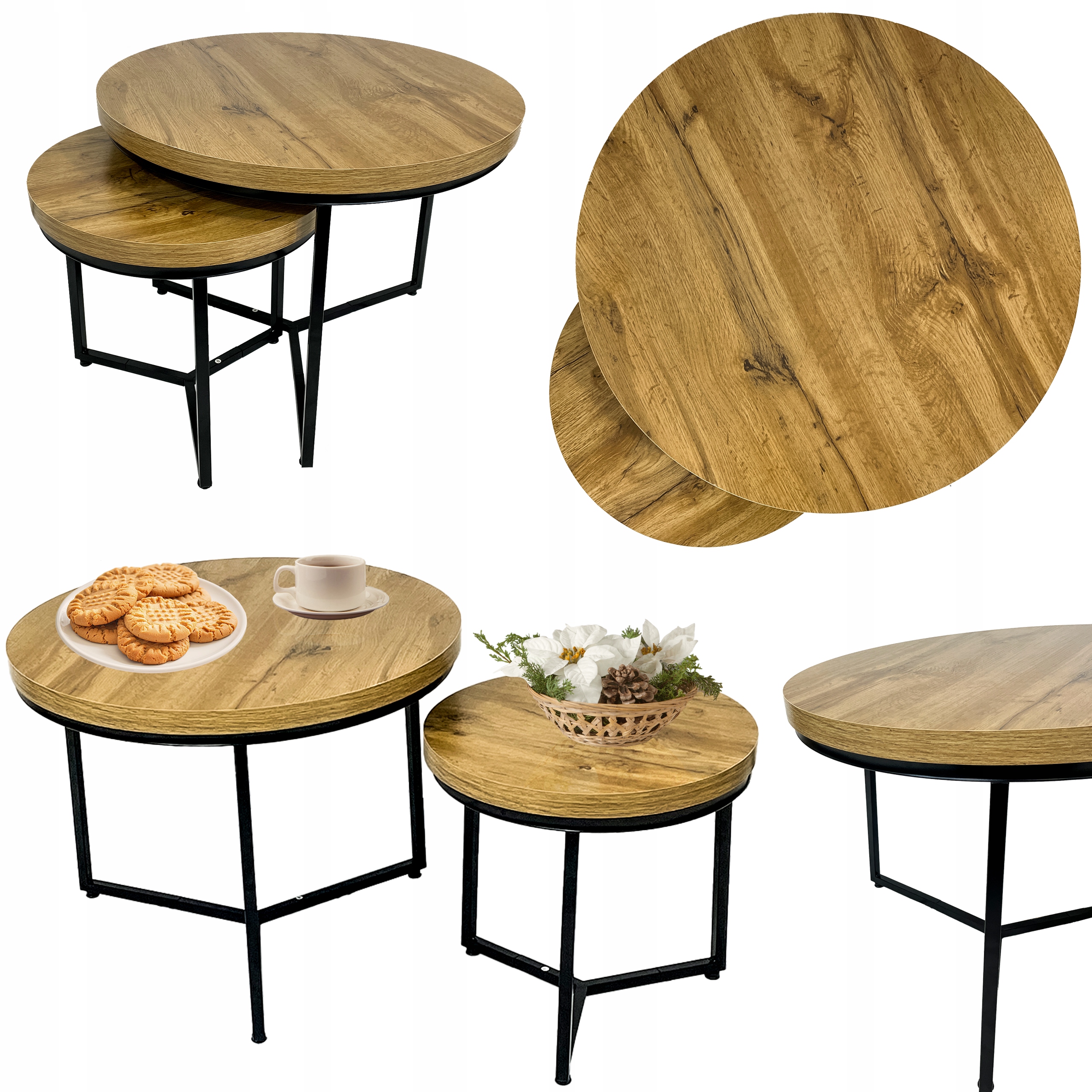 - Blaty stolików w kolorze dębu.