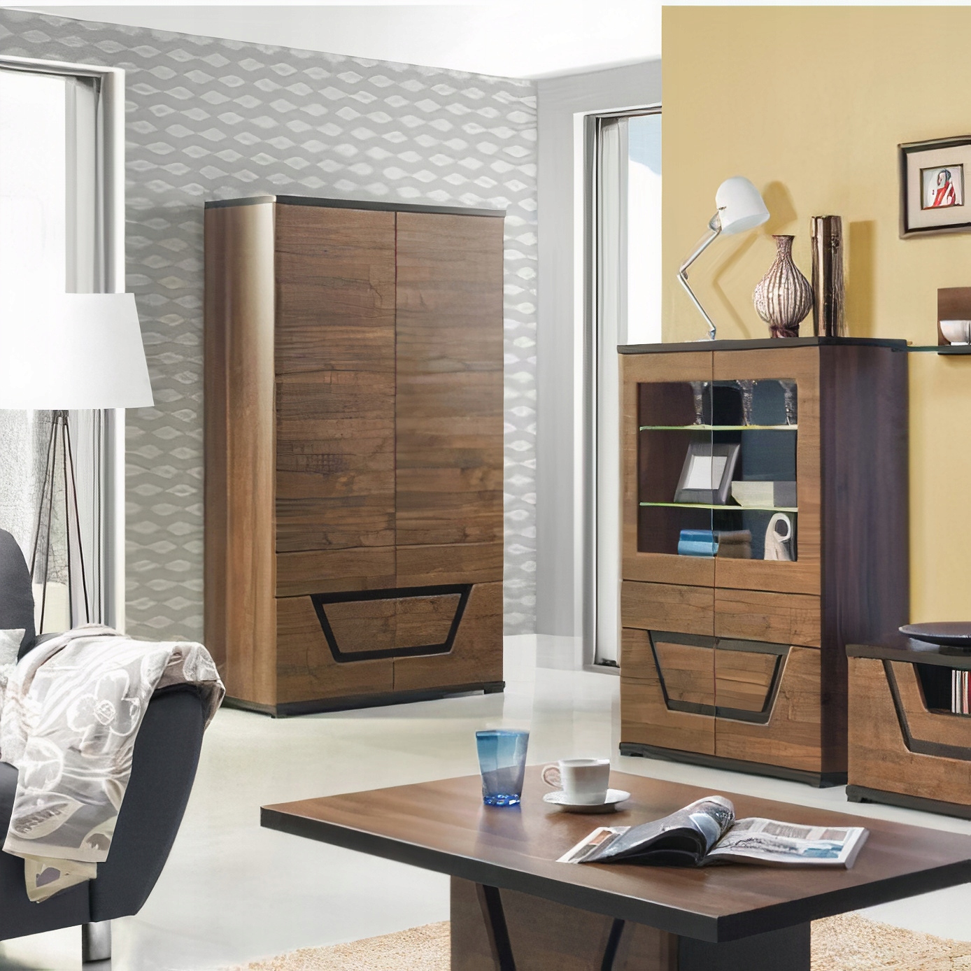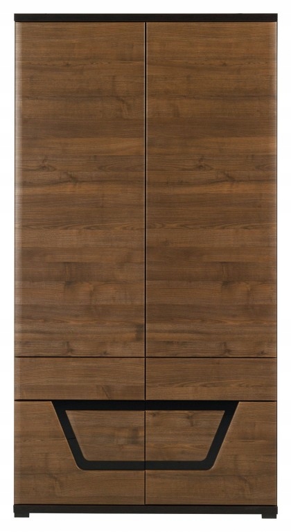 - Stylowe wykończenie – połączenie dekoru orzechowego z czarnym szkłem oraz geometryczny wzór w dolnej części frontu nadają szafie elegancki i unikatowy charakter, który doskonale komponuje się z klasycznymi i nowoczesnymi aranżacjami.