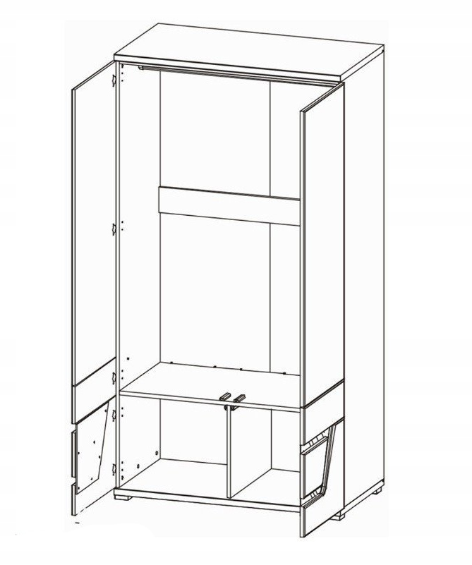 - Przemyślane wnętrze – szafa wyposażona jest w drążek na ubrania oraz dwie pojemne przegrody dolne, które umożliwiają wygodne przechowywanie zarówno odzieży wiszącej, jak i składanej. Idealna do organizacji przestrzeni w salonie, sypialni czy garderobie.