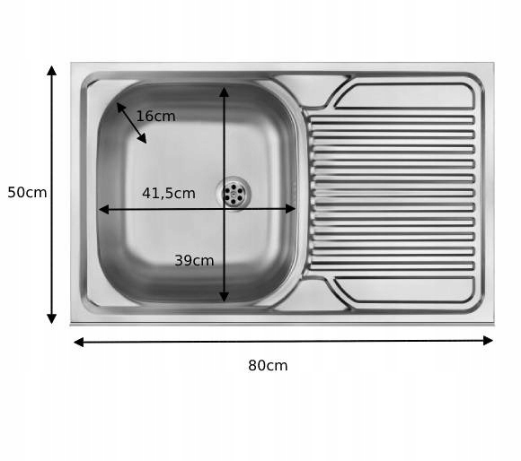 - Wymiary zlewozmywaka to 80x50 cm, co zapewnia komfortowe warunki do mycia naczyń, nawet większych garnków czy patelni.