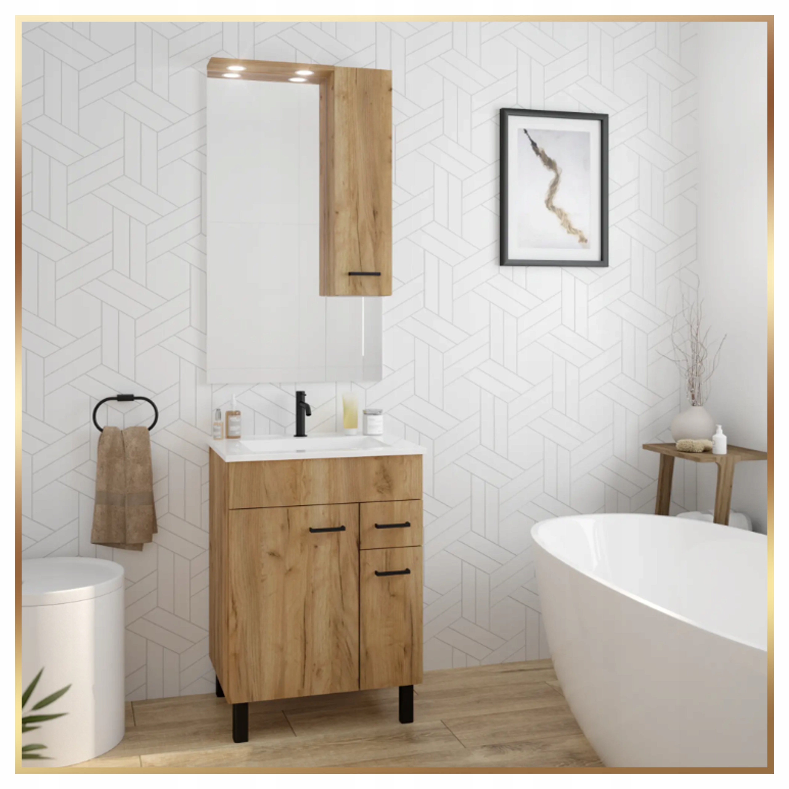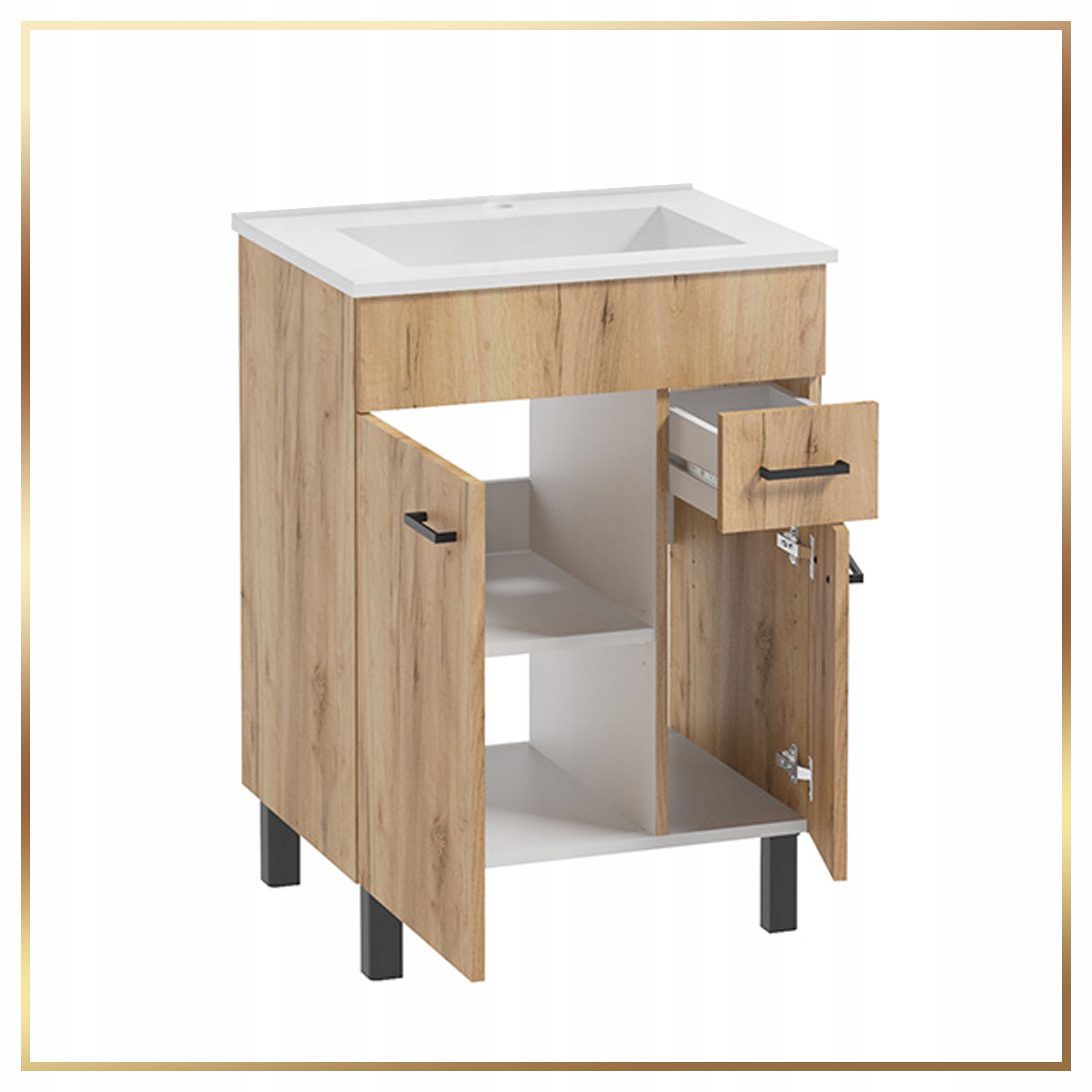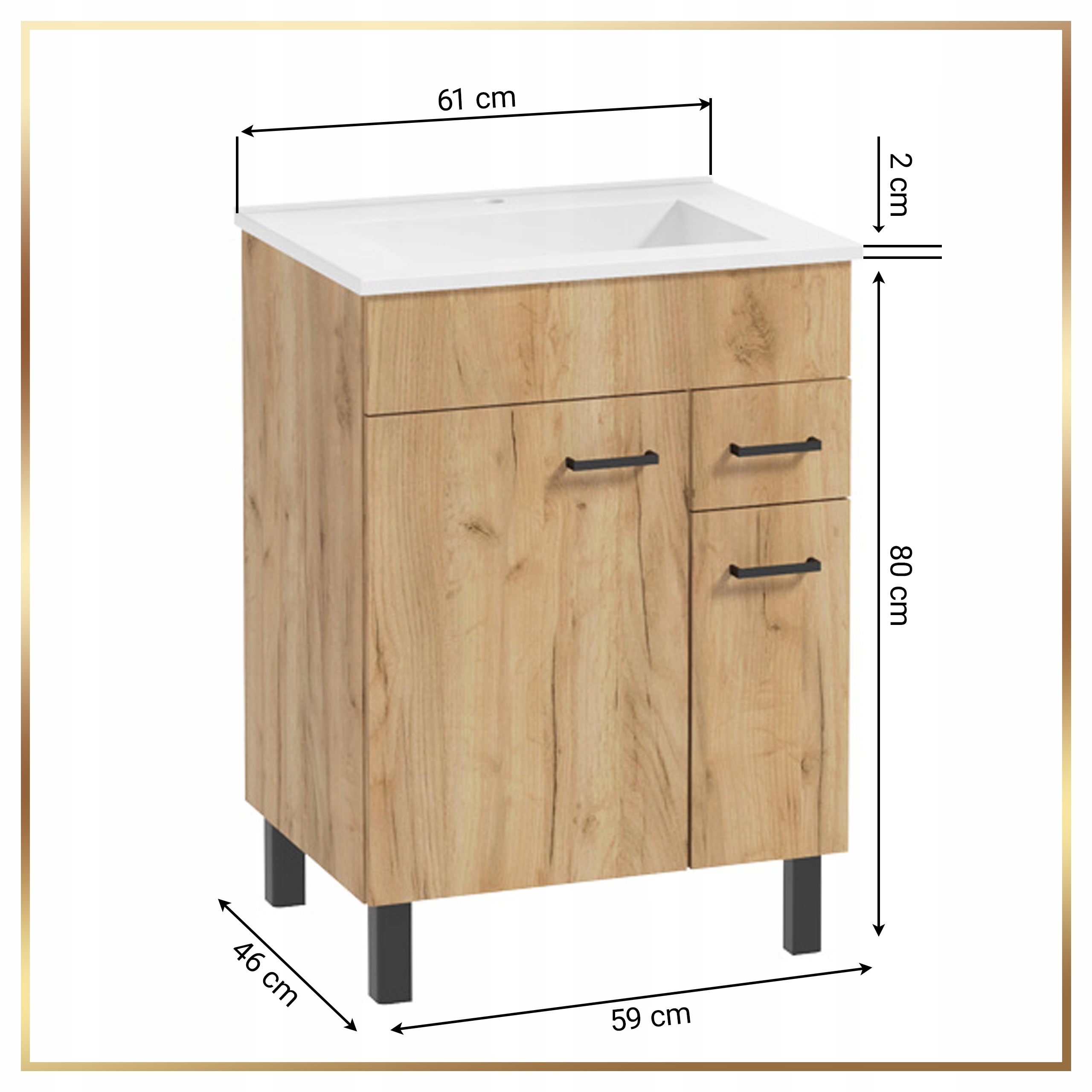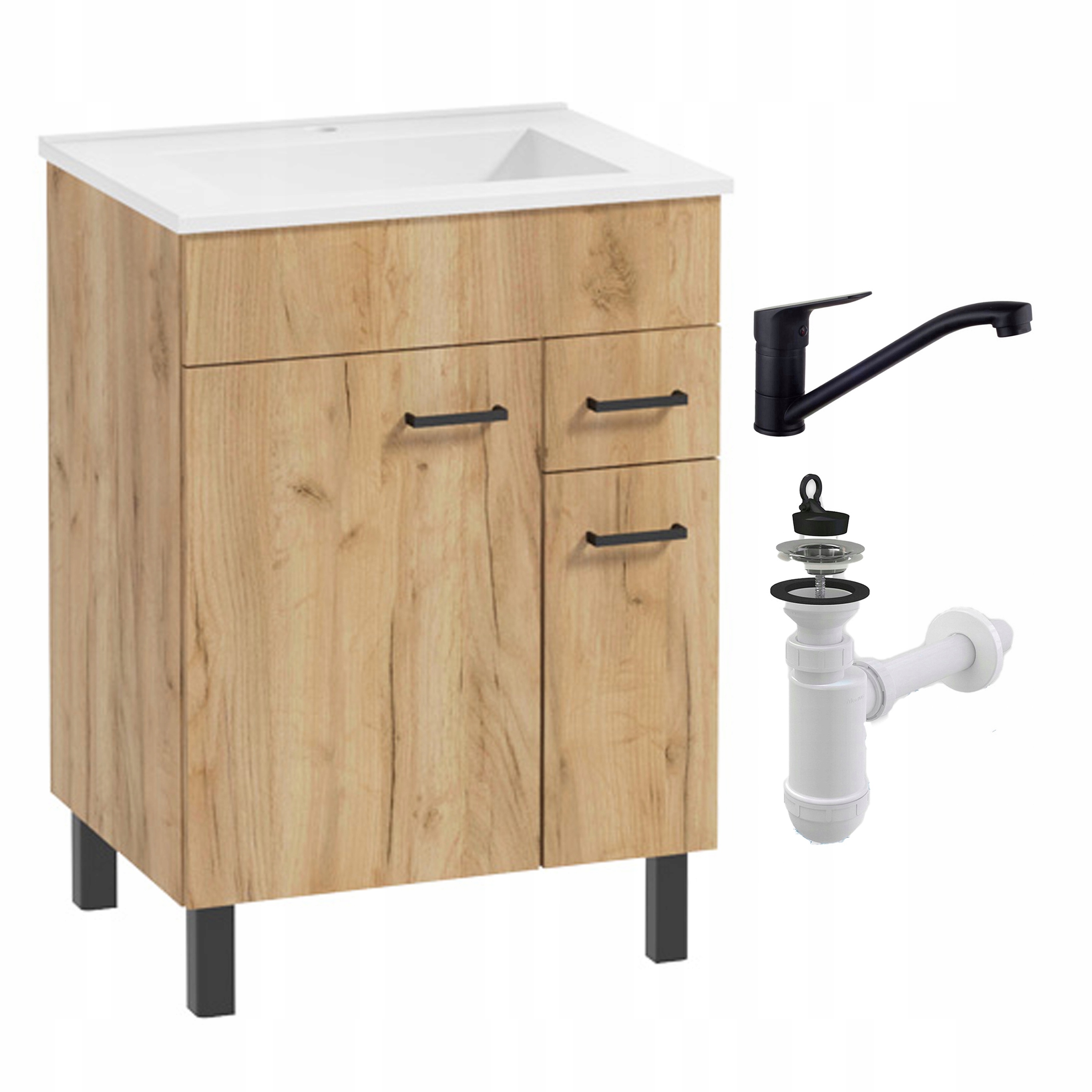 Szafka Łazienkowa z Umywalką Stojąca 60 Dąb Craft Złoty Bateria Czarna Obro