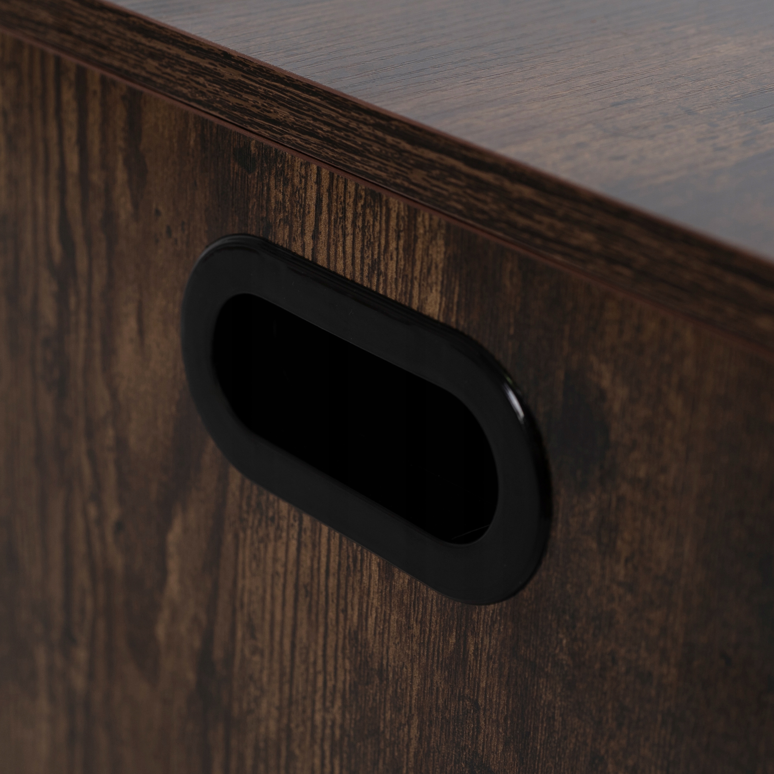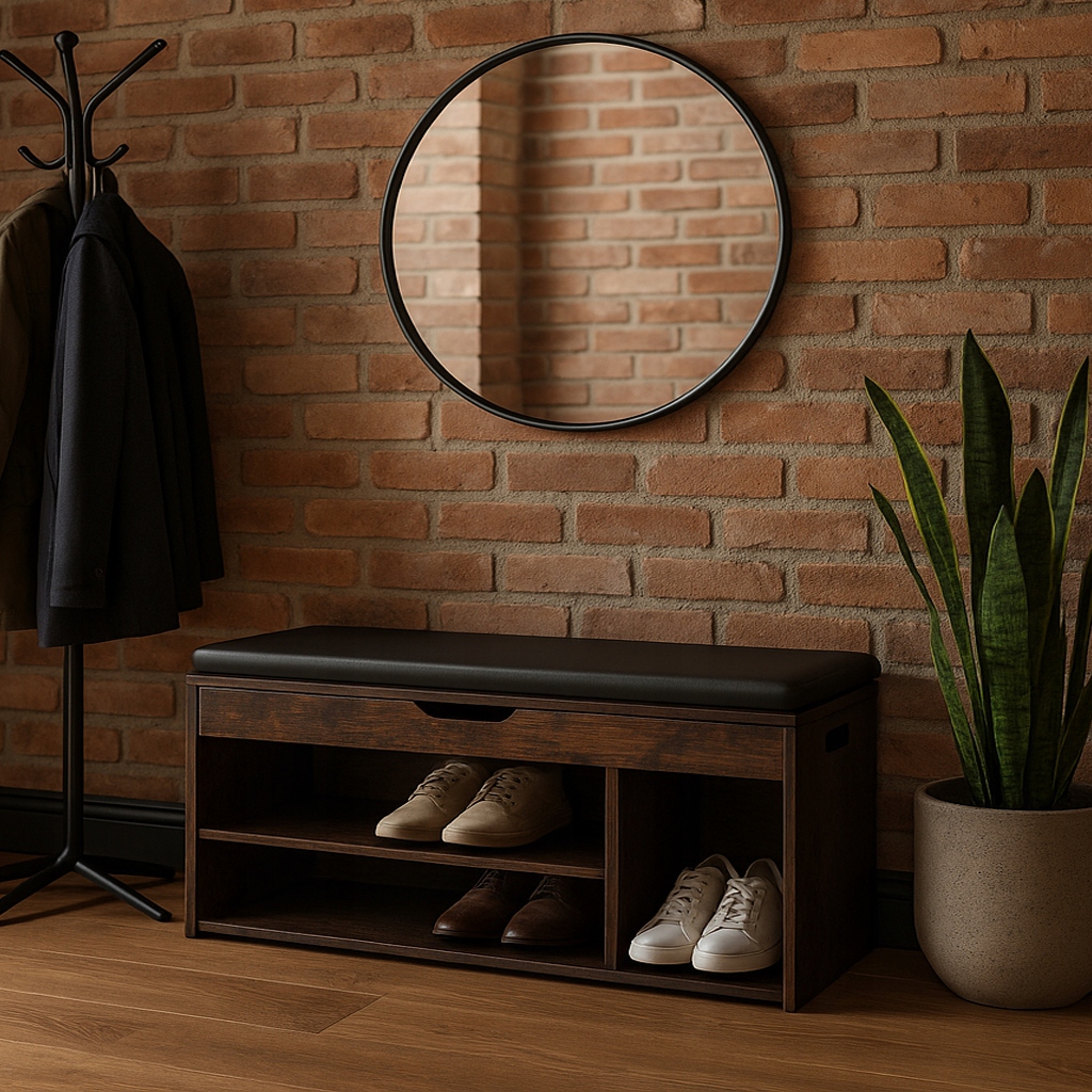 Elegancka i funkcjonalna szafka na buty z wygodnym siedziskiem. Wykończenie w kolorze rustykalnego dębu wprowadza do wnętrza ciepły, naturalny klimat, a czarna poduszka z ekoskóry zapewnia komfort podczas siadania i łatwe utrzymanie w czystości.