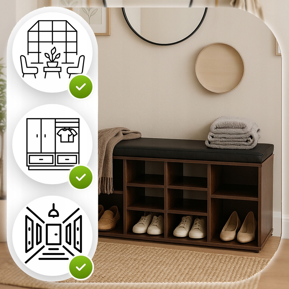 - W przedpokoju – jako wygodne siedzisko przy zakładaniu butów i praktyczny organizer na obuwie, torby czy czapki – wszystko w jednym, stylowym meblu.