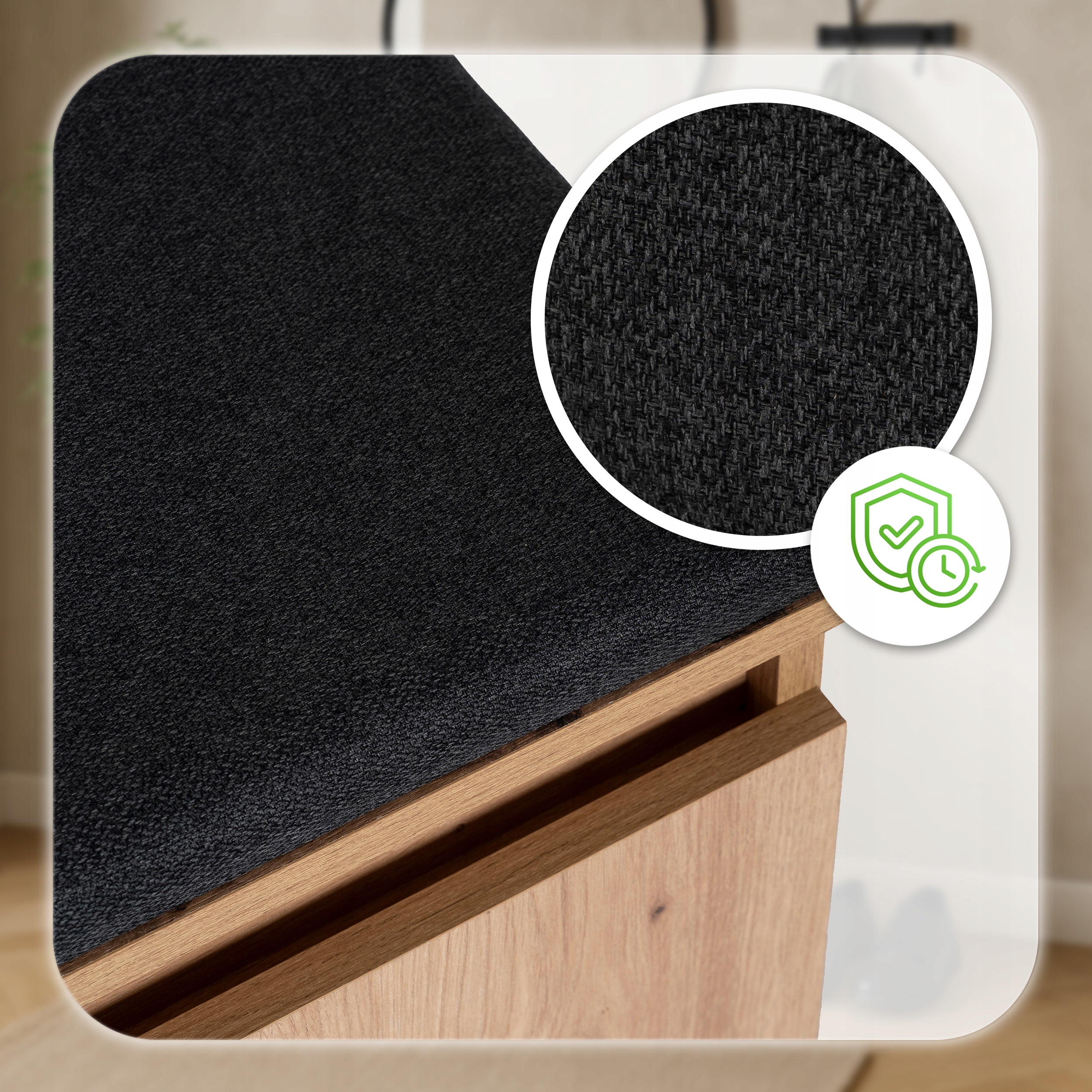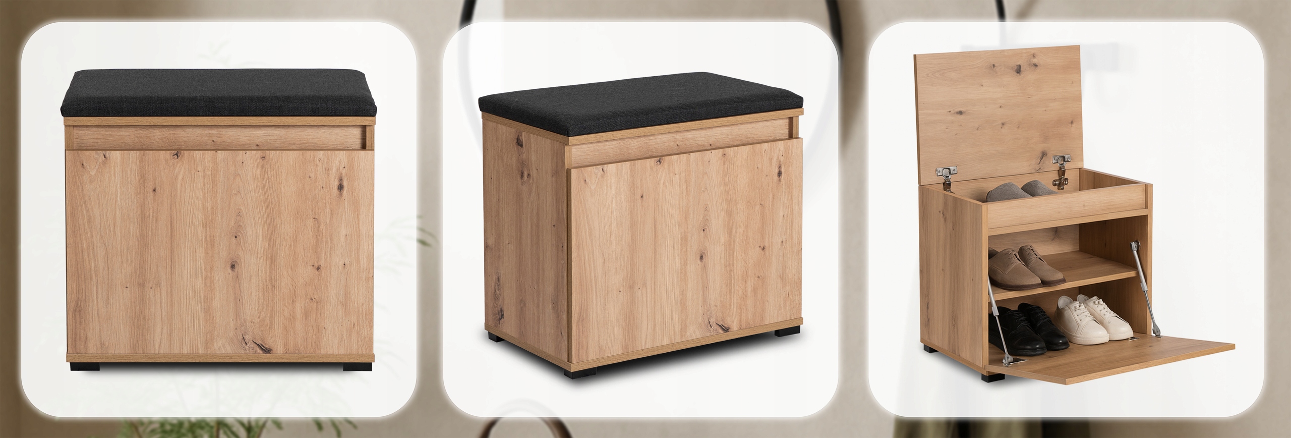 Szafka na buty MODENA w kolorze dębu artisan została wyposażona w miękkie siedzisko z tapicerowanym obiciem, które zapewnia wygodę podczas zakładania i zdejmowania obuwia. Dzięki łatwej w pielęgnacji tkaninie szafka przez długi czas zachowuje świeży wygląd.
