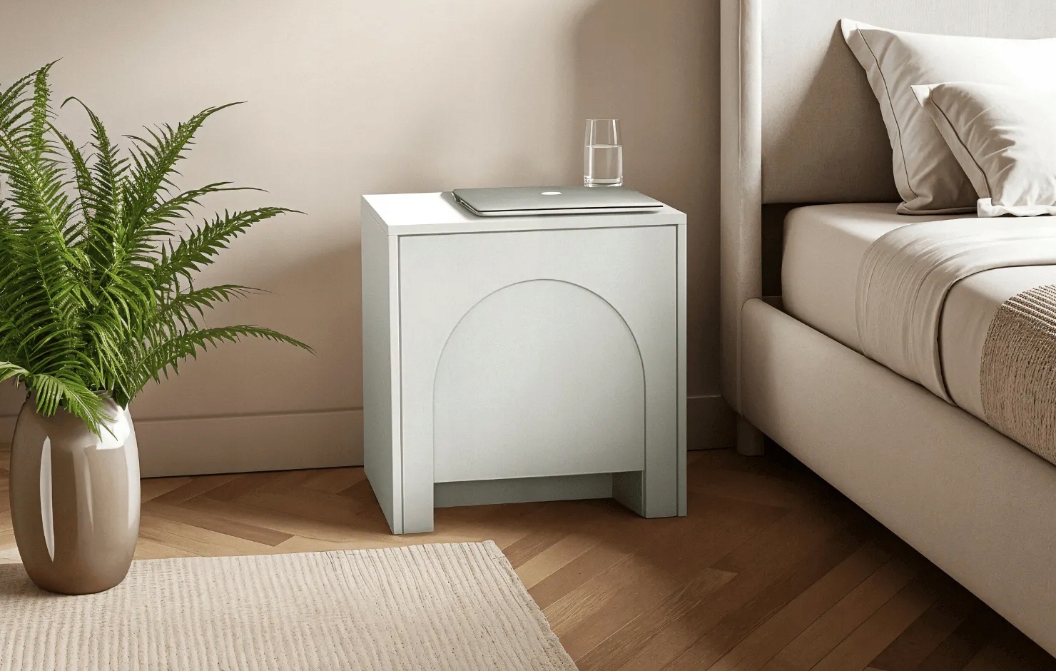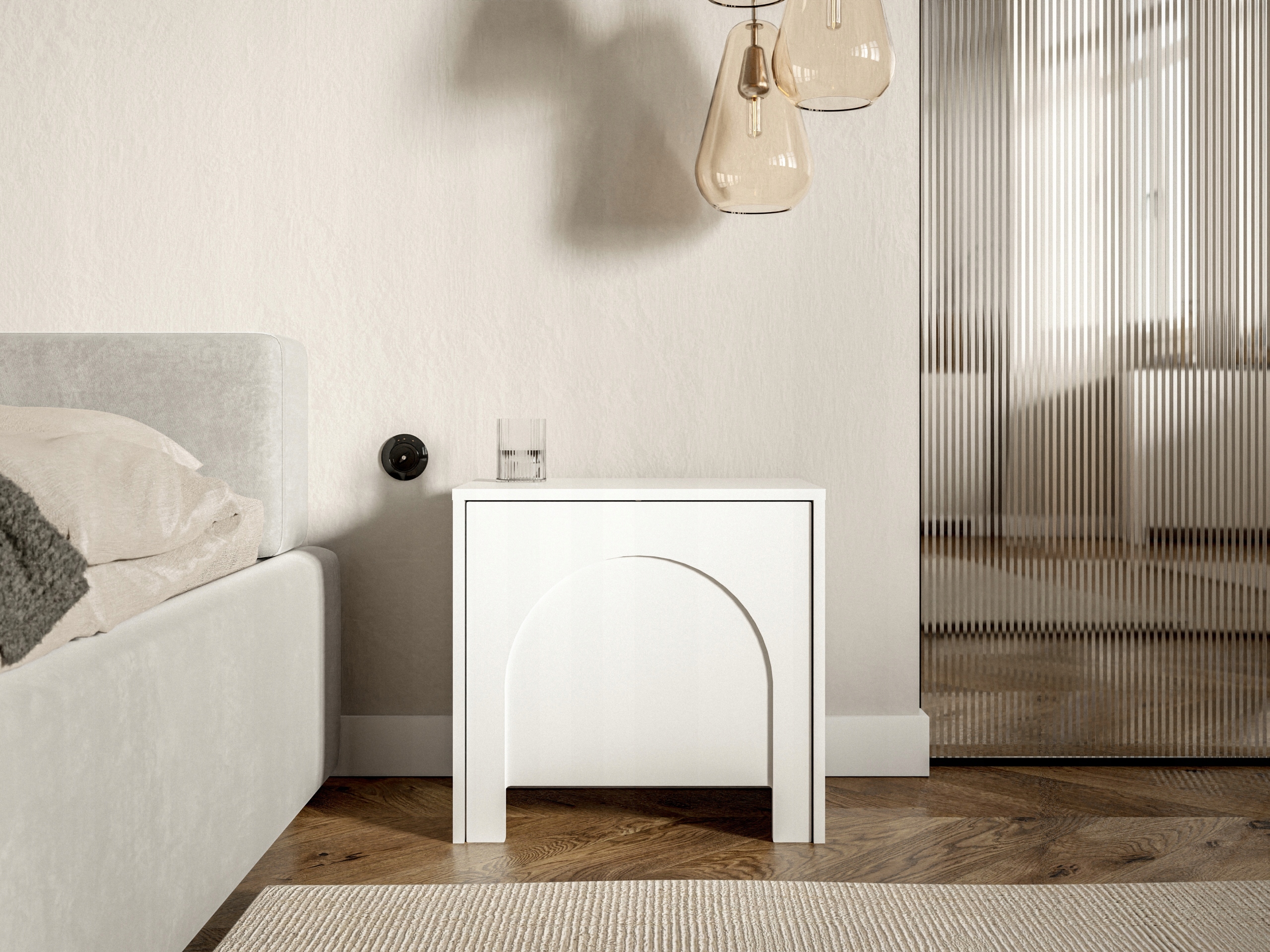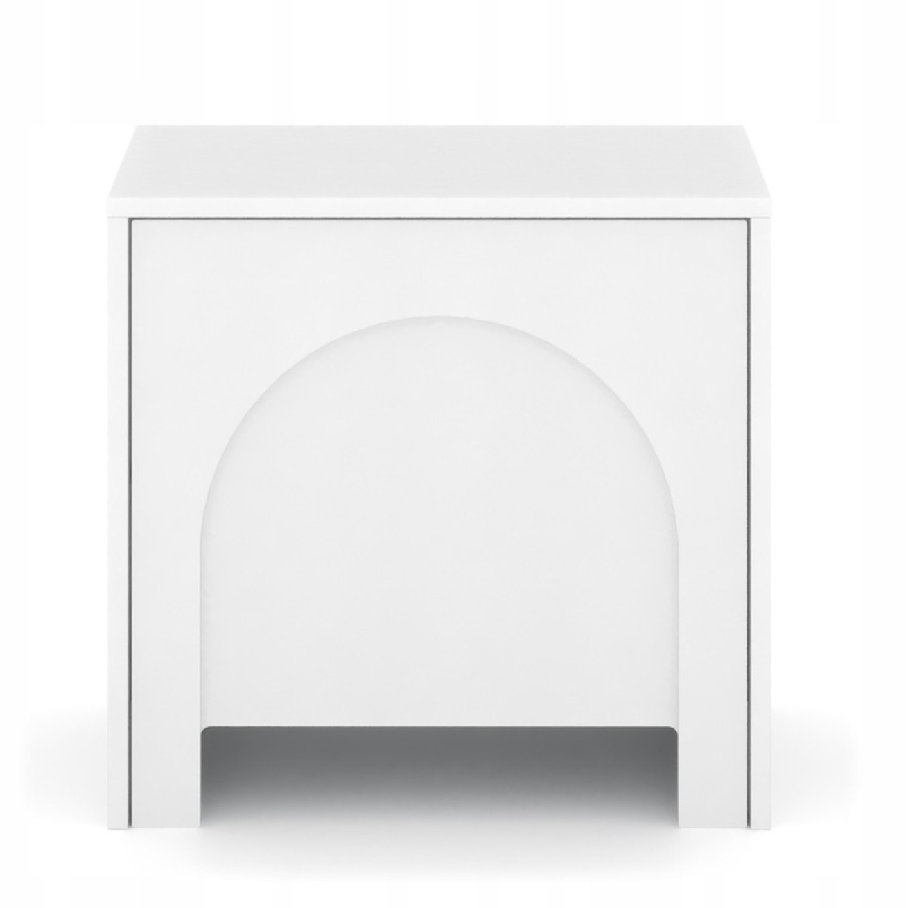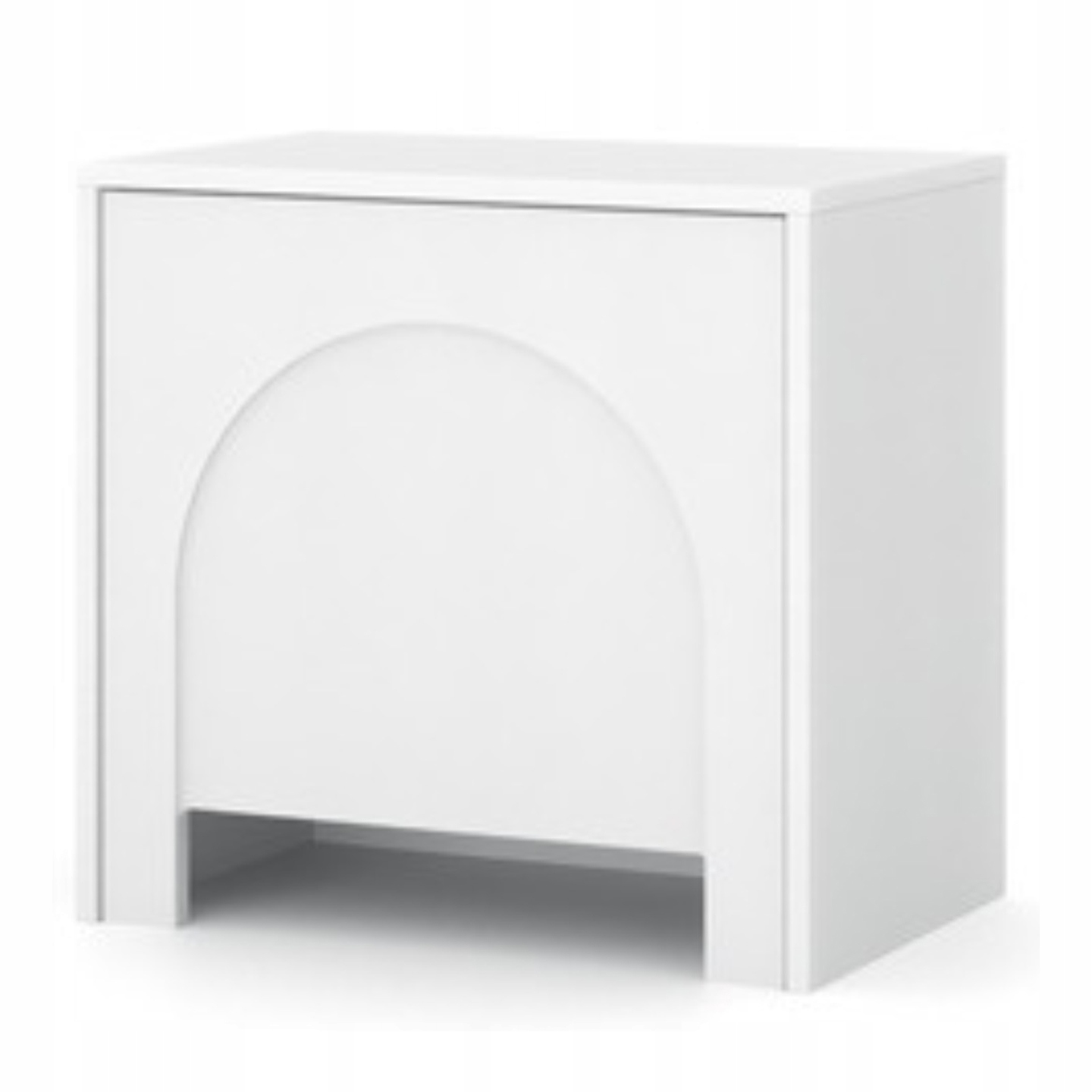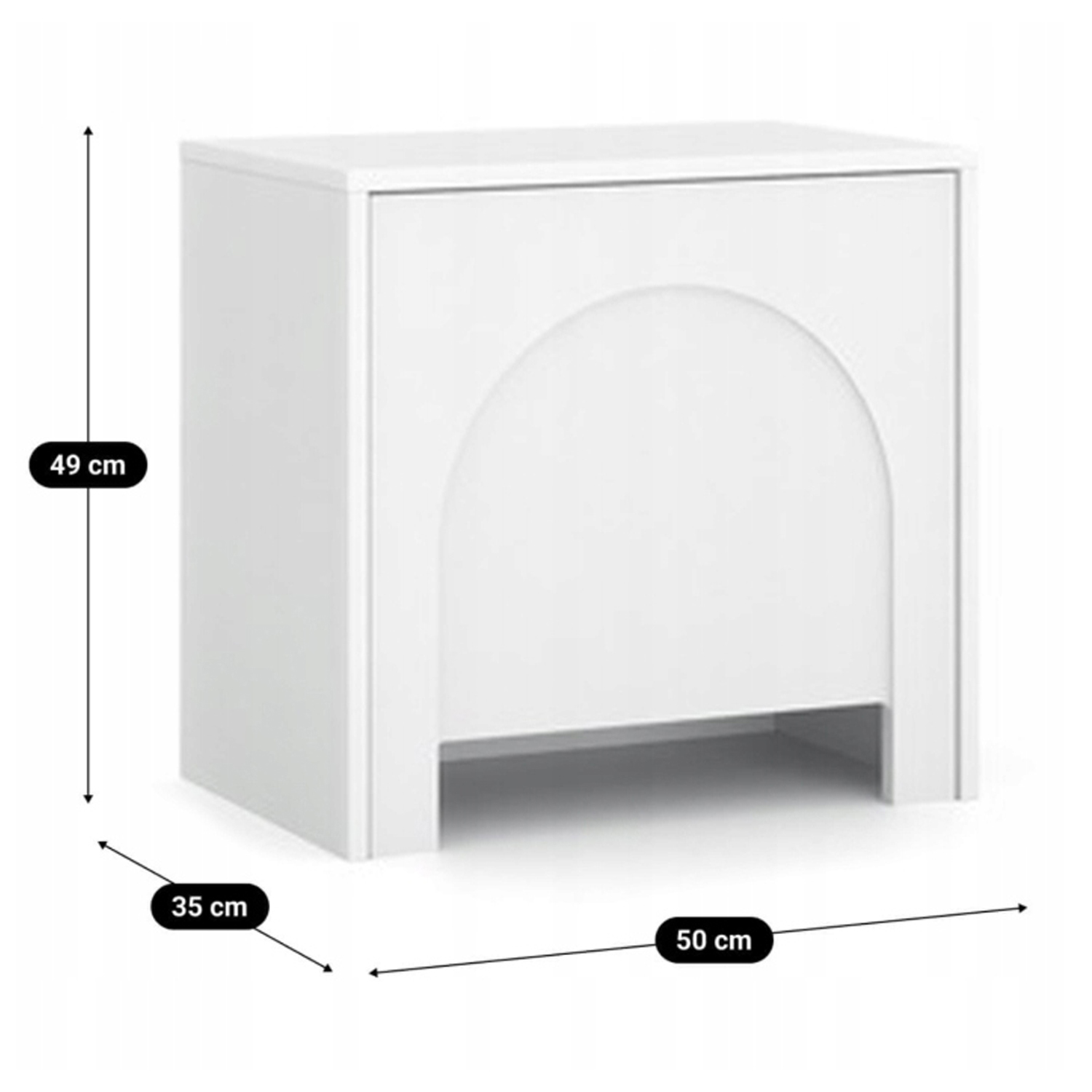 Szafka nocna o wymiarach 49 x 35 x 50 cm to nowoczesny i funkcjonalny mebel idealny do sypialni. Białe fronty z subtelnym wzorem łuków, wykonane są z płyty MDF i zabezpieczone obrzeżem ABS. System push to open umożliwia wygodne otwieranie bez uchwytów. Wykonana z wytrzymałych materiałów.