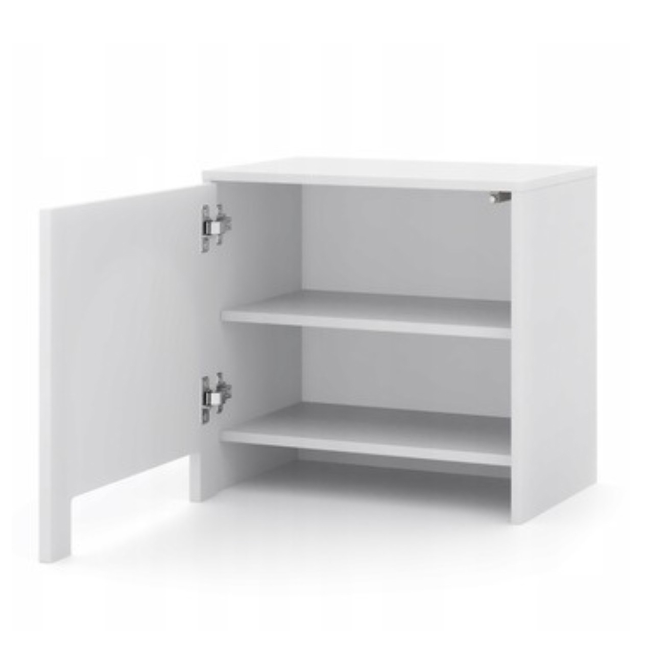 Szafka posiada wewnętrzne półki z dużą ilością miejsca do przechowywania. Półki są solidne i stabilne, co pozwala na bezpieczne przechowywanie różnych przedmiotów.