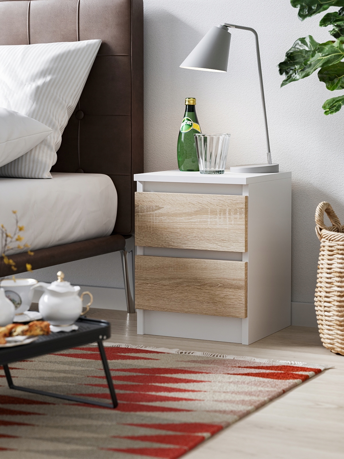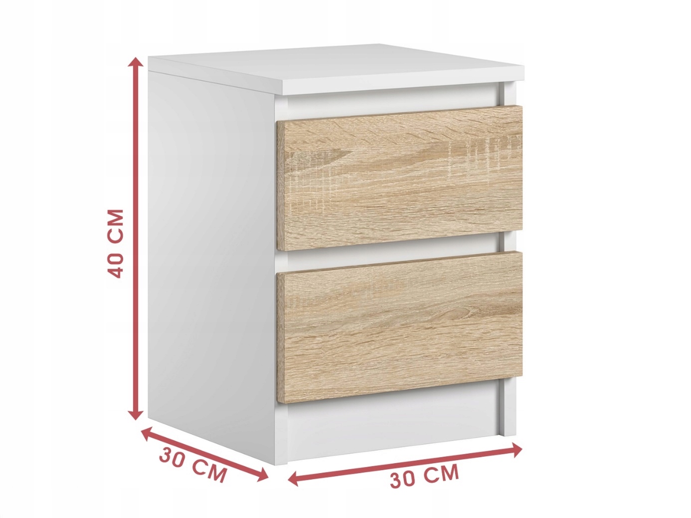 Model wyposażony jest w 2 pojemne szuflady na prowadnicach rolkowych, które ułatwiają przechowywanie najpotrzebniejszych przedmiotów, takich jak książki, kosmetyki czy akcesoria codziennego użytku. Dzięki zastosowaniu płyty laminowanej 16 mm, szafka nocna jest solidna, odporna na uszkodzenia i łatwa do utrzymania w czystości. Stabilna konstrukcja gwarantuje wielozadaniowość i trwałość mebla.