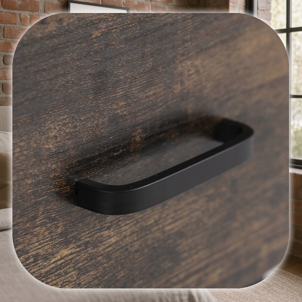 Połączenie czerni uchwytu z rustykalnym odcieniem dębu tworzy harmonijny, nowoczesny kontrast, dodając meblowi elegancji i charakteru.
