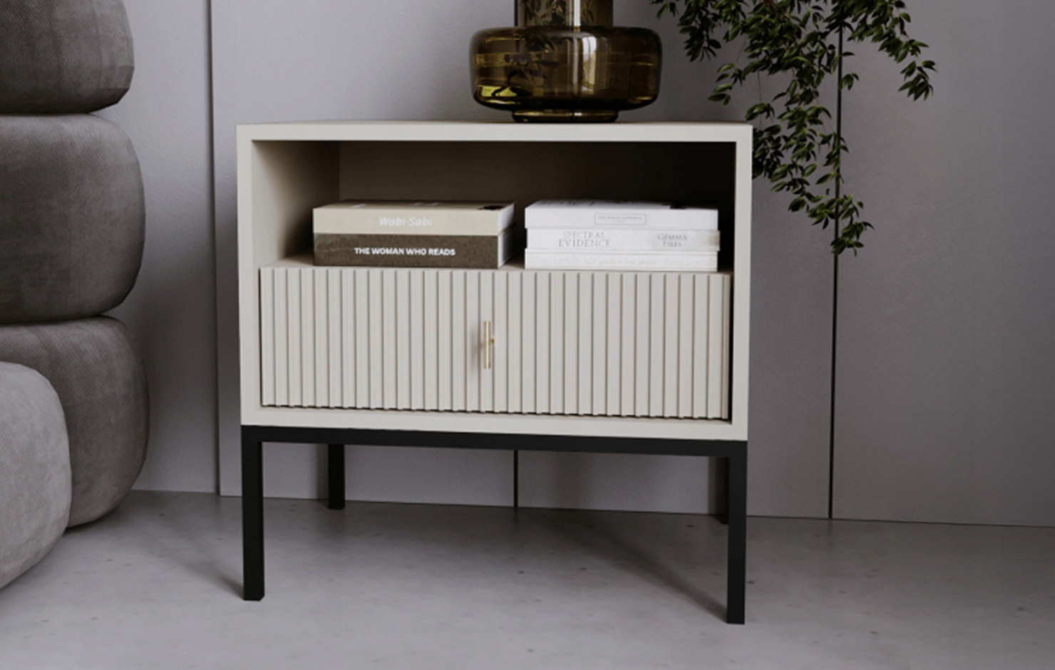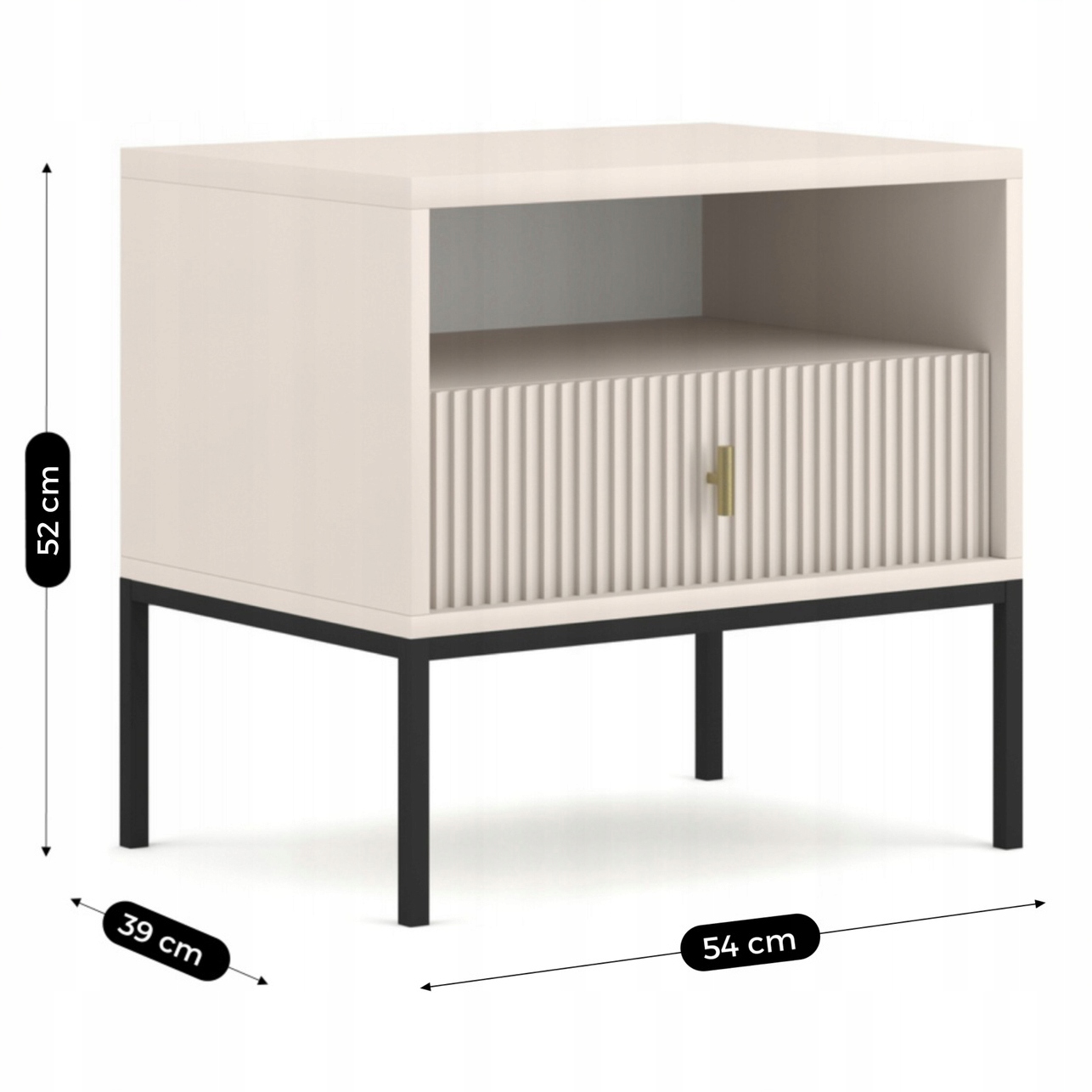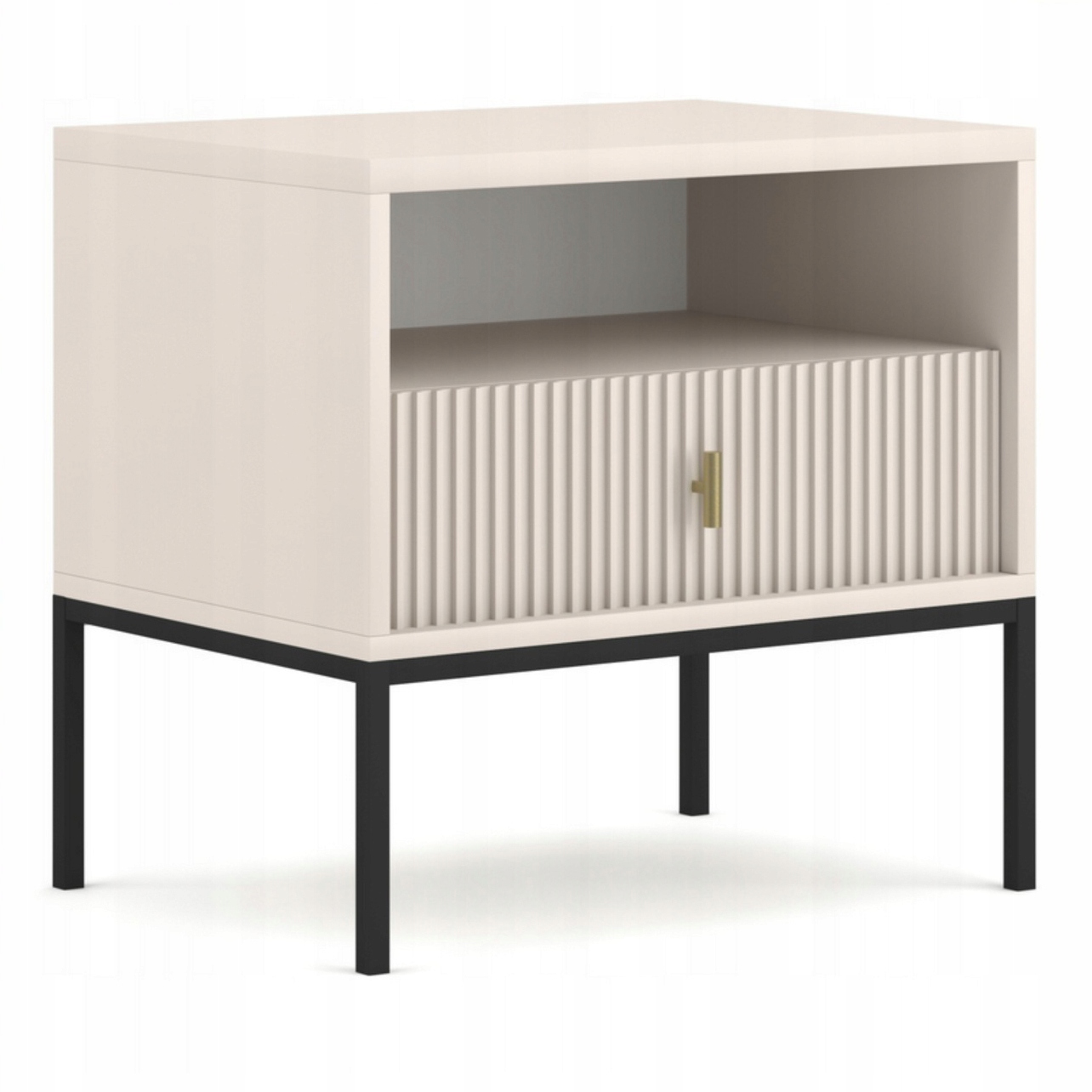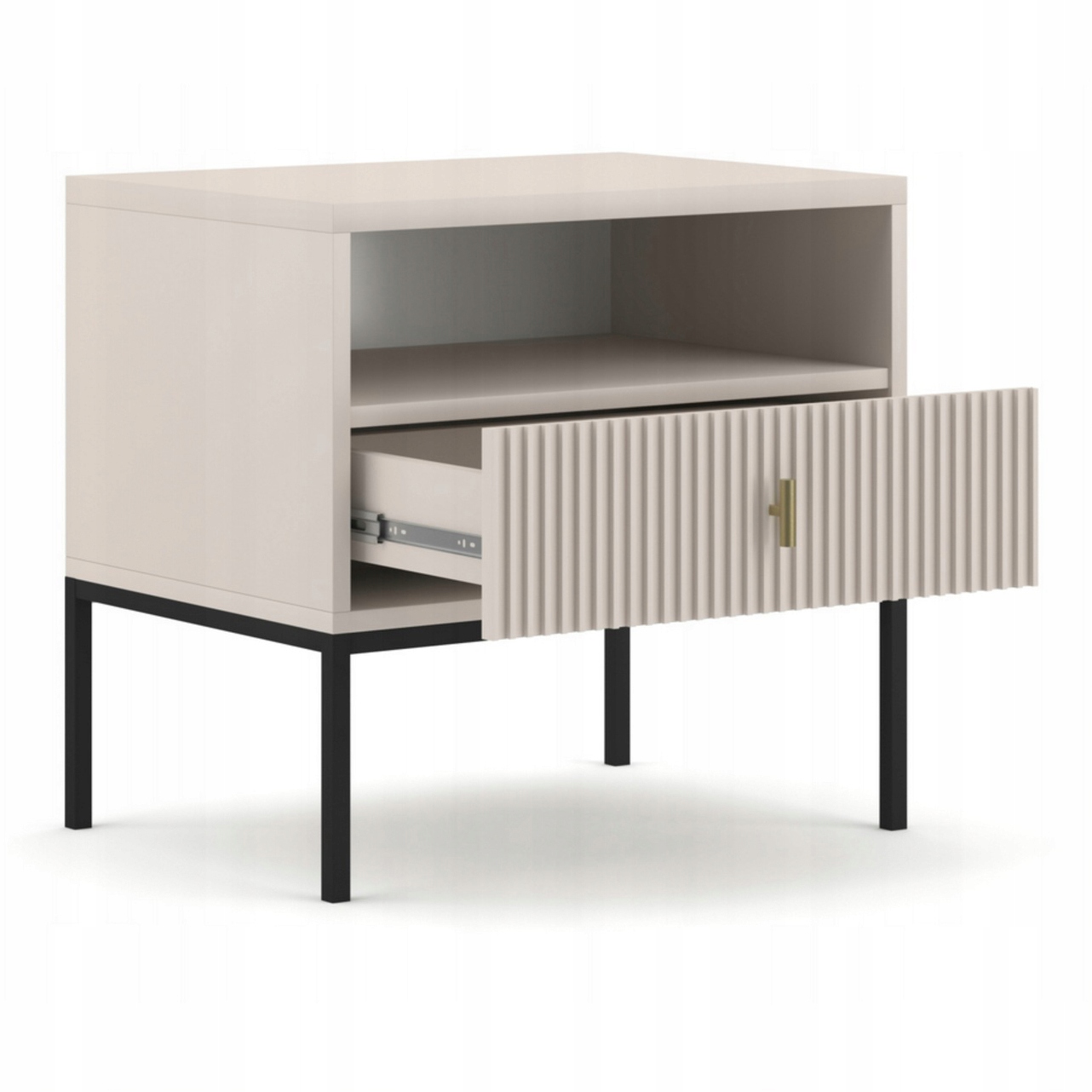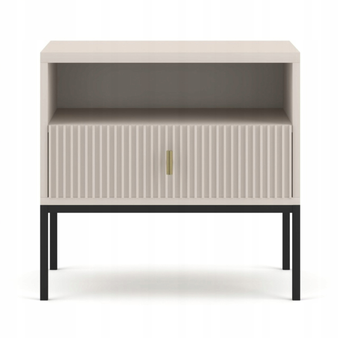 Stolik nocny MARCOS to kwintesencja nowoczesnego designu, który łączy w sobie ponadczasową elegancję i praktyczność. Jego kaszmirowy kolor, ozdobne ryflowanie oraz złoty uchwyt i czarne nóżki wprowadzają do wnętrza stylowy wygląd. To mebel, który wpisuje się w estetykę nowoczesnych przestrzeni, ale z powodzeniem odnajdzie się także w klasycznych aranżacjach.