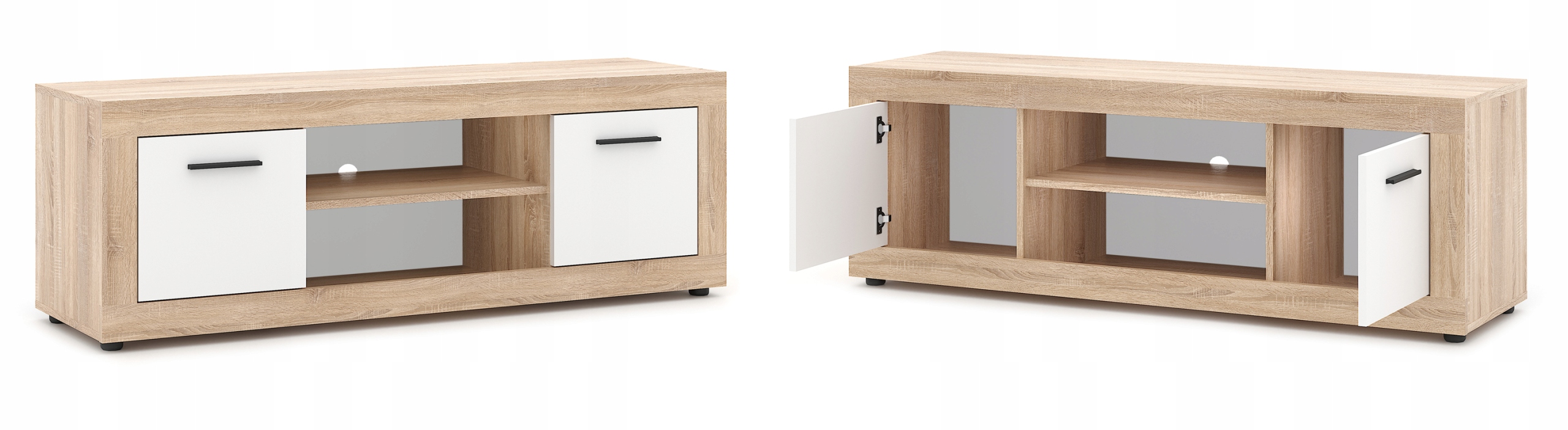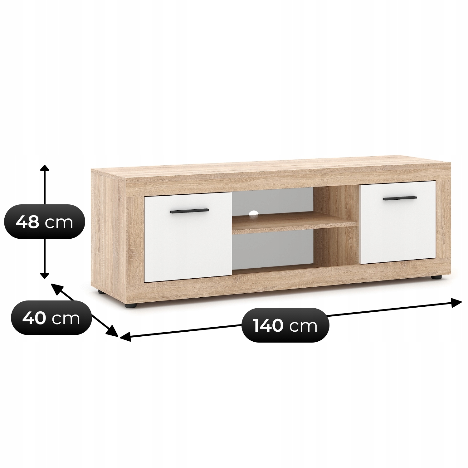 Nowoczesna szafka RTV o wymiarach 140 x 40 x 48 cm w kolorze dąb sonoma z białymi frontami to stylowe i funkcjonalne rozwiązanie do salonu lub sypialni. Posiada praktyczne półki, zamykane szafki i otwór na przewody.
