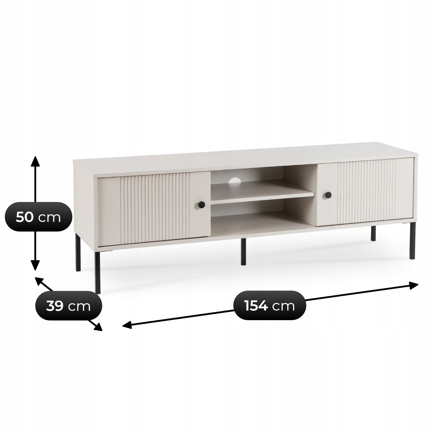 Szafka stojąca o wymiarach 154 x 39 x 50 cm to nowoczesny i funkcjonalny mebel idealny do salonu, sypialni. Fronty drzwiczek zdobi eleganckie ryflowanie, które nadaje meblowi unikalny i nowoczesny charakter. Czarne nogi oraz czarne uchwyty dodają jej elegancji, sprawiając, że świetnie wpisuje się w nowoczesne wnętrza.