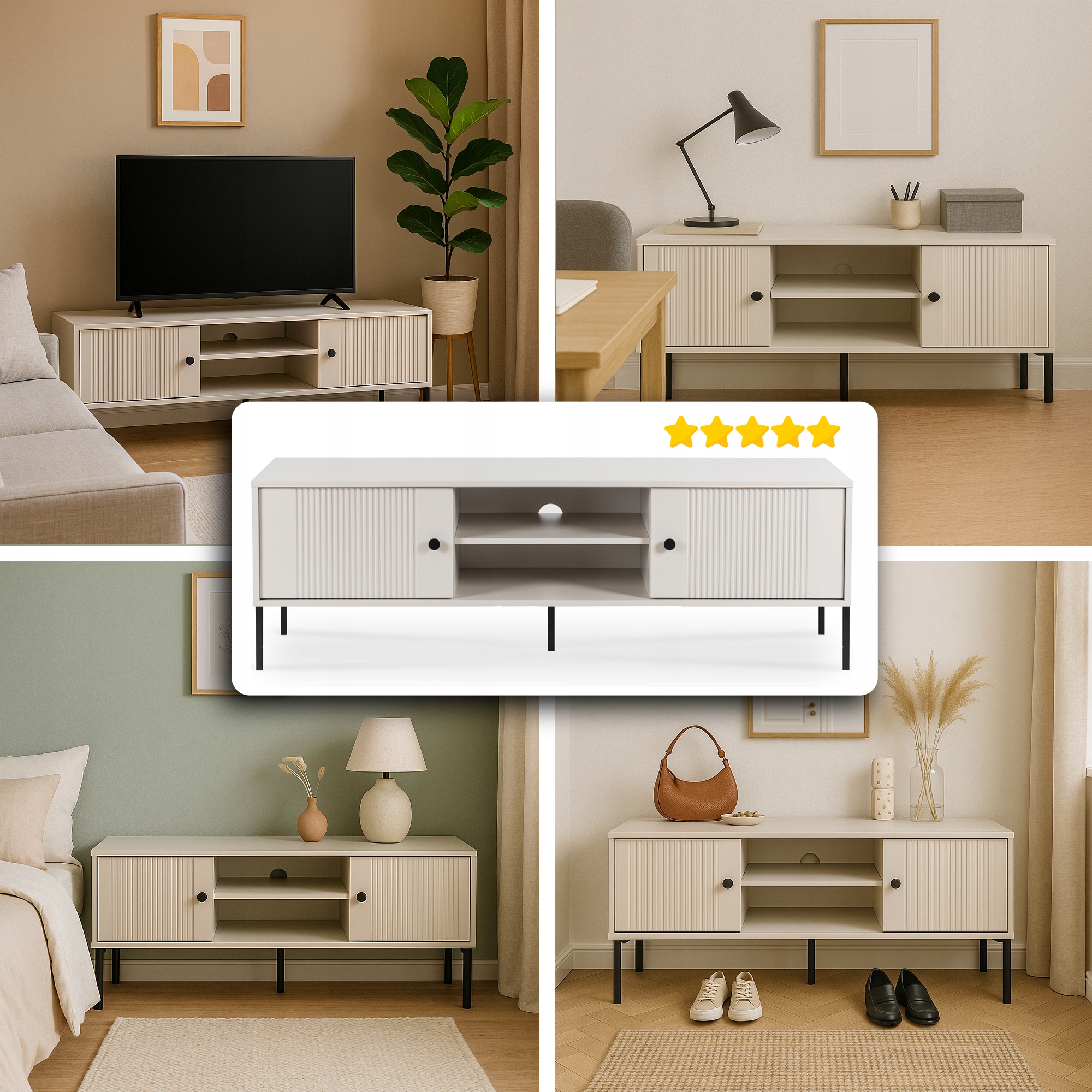 - W salonie – jako szafka pod telewizor lub wolnostojący mebel do przechowywania.