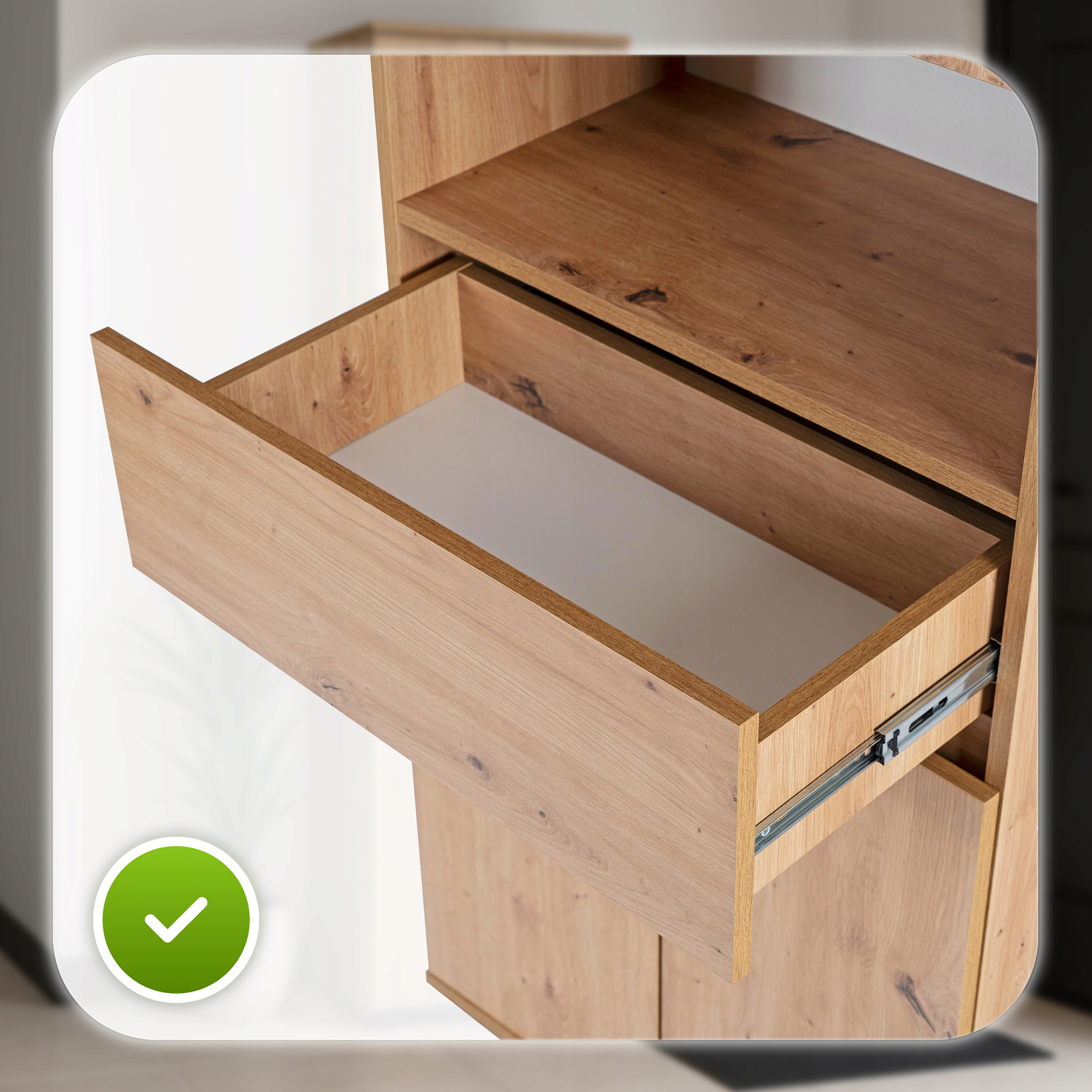 Nowoczesny słupek MODENA w kolorze dębu to praktyczne rozwiązanie do przedpokoju czy garderoby. Wysoka forma, pojemne półki, szuflada i zamykane szafki zapewniają wygodne przechowywanie. Smukła bryła zmieści się nawet w małych wnętrzach, a naturalny odcień dębu doda im przytulnego charakteru.