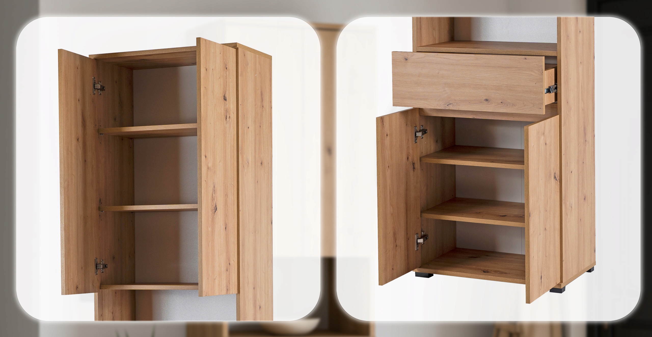 - Wielozadaniowość – połączenie szuflady i półek sprawia, że mebel jest niezwykle funkcjonalny i dopasowany do różnych potrzeb domowników.