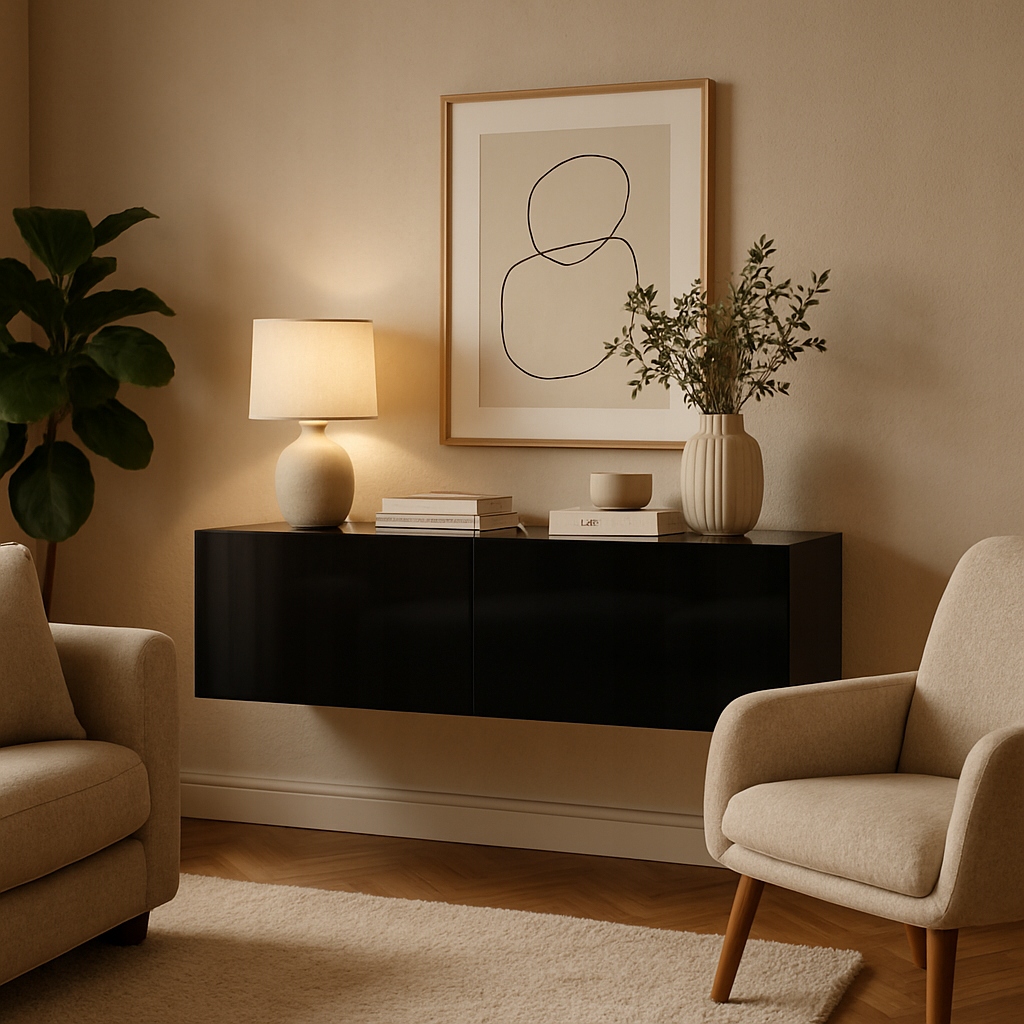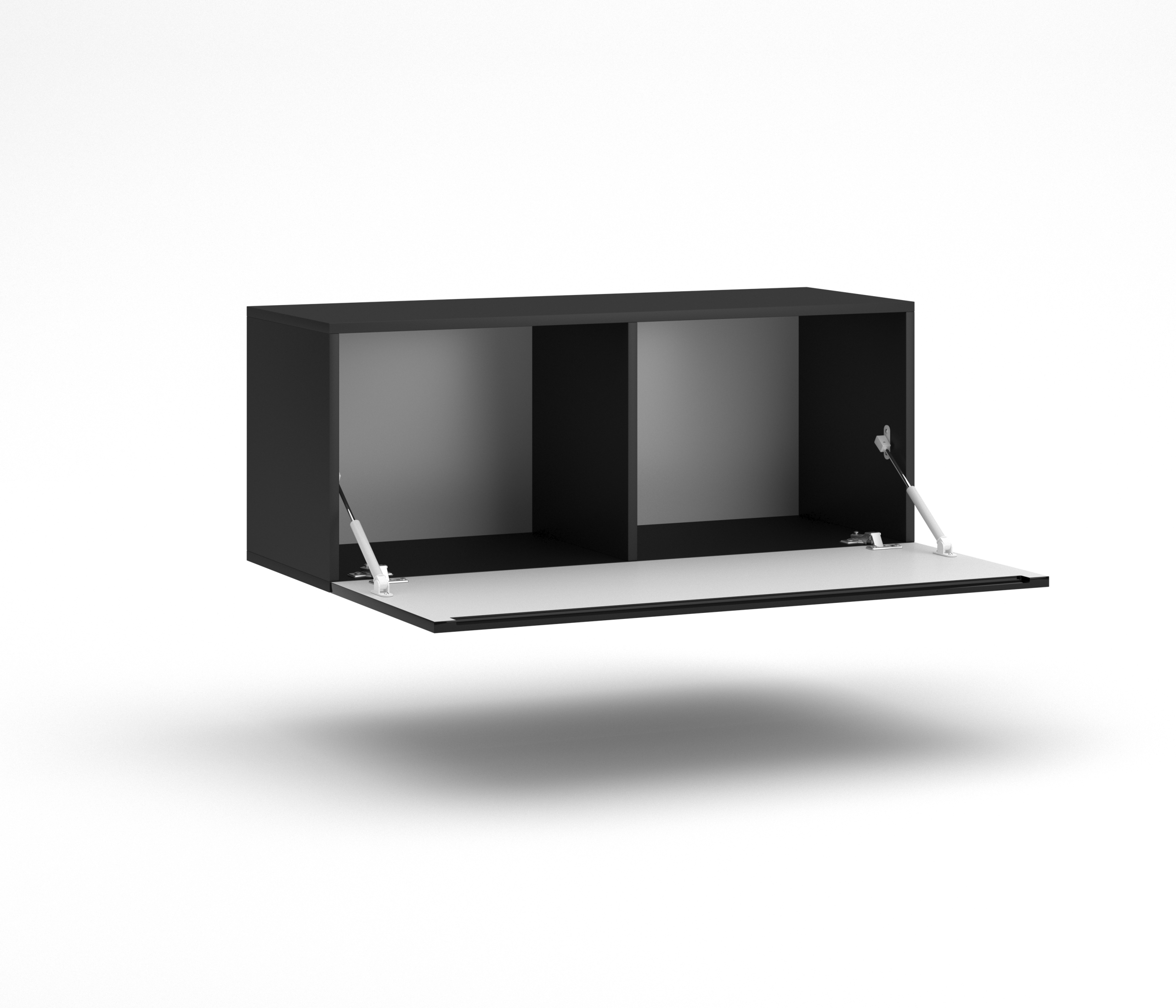 Nowoczesna szafka RTV wisząca o wymiarach 100 x 38 x 40 cm to eleganckie i funkcjonalne rozwiązanie do salonu, sypialni lub przestrzeni hotelowej. Jej minimalistyczny design w ponadczasowej kolorystyce czarnego korpusu i czarnego frontu na wysoki połysk (BLACK / BLACK GLOSS) doskonale wpisuje się w nowoczesne wnętrza.